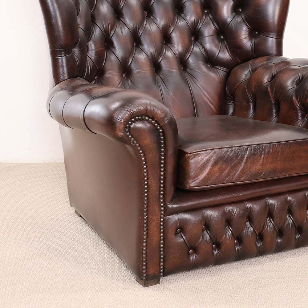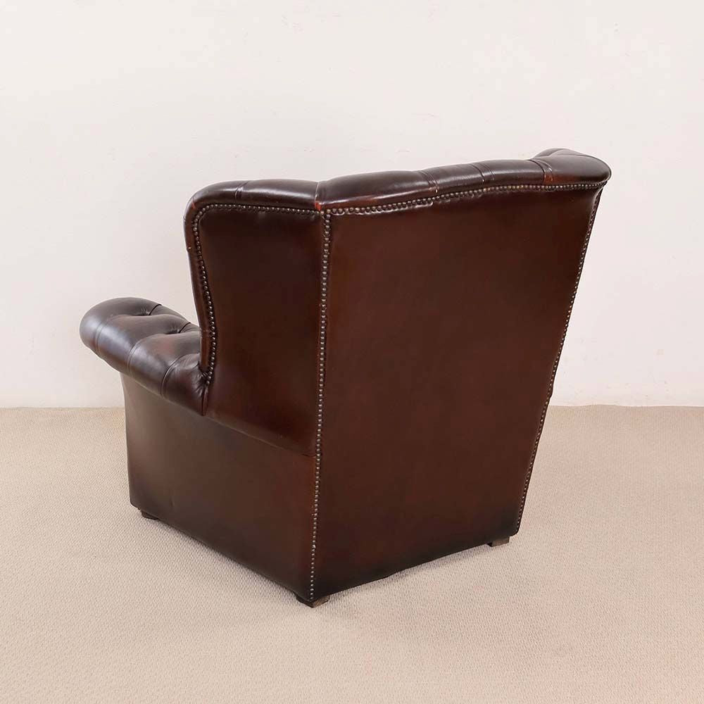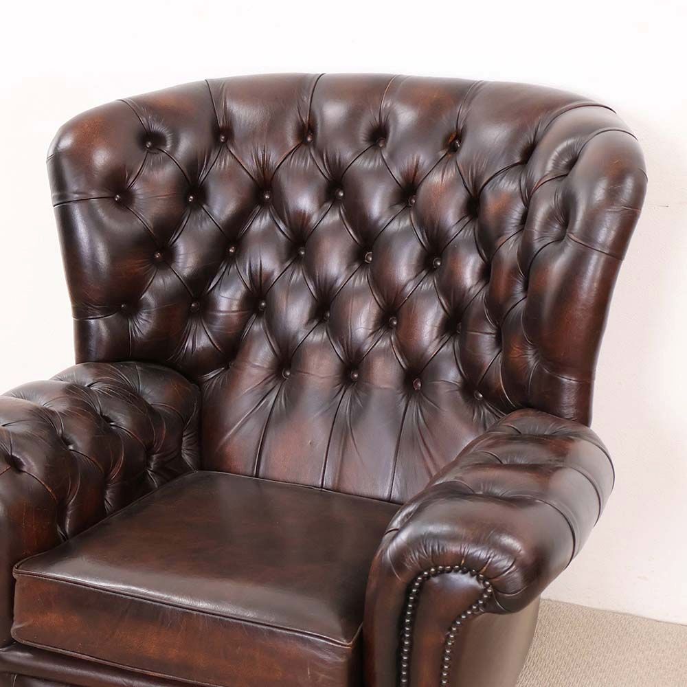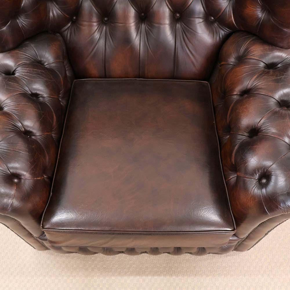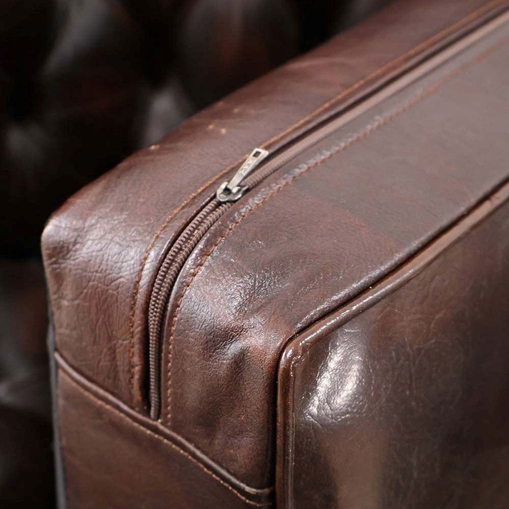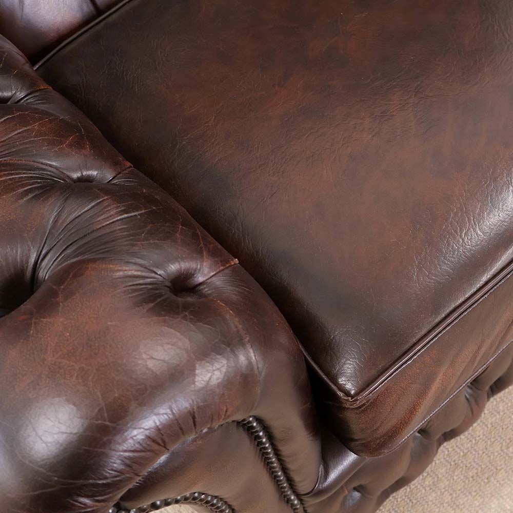 ボタン留めの立体感が素晴らしい背もたれは、革張りのソファーならではの高級感。洗練された英国スタイルをお楽しみください。