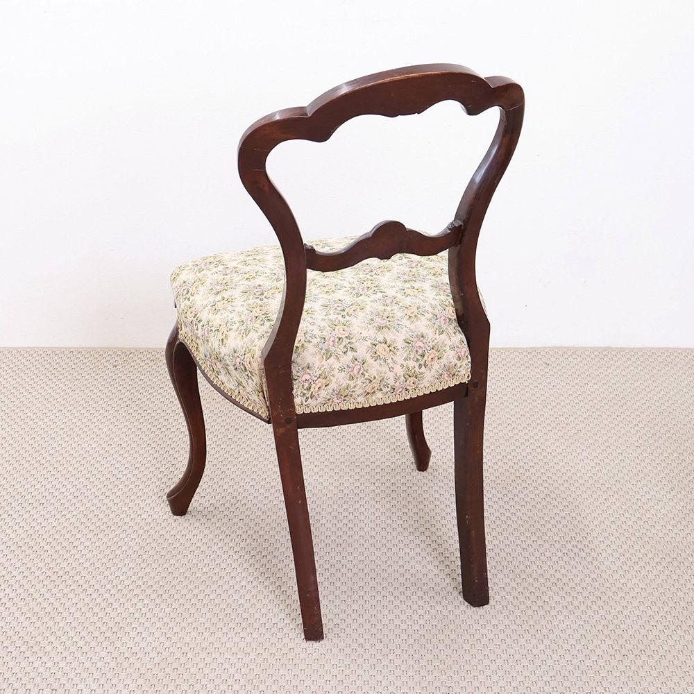 彫りの装飾をあしらった可憐な背もたれと優雅な猫足が視線を誘う、魅惑のアンティークチェアです。