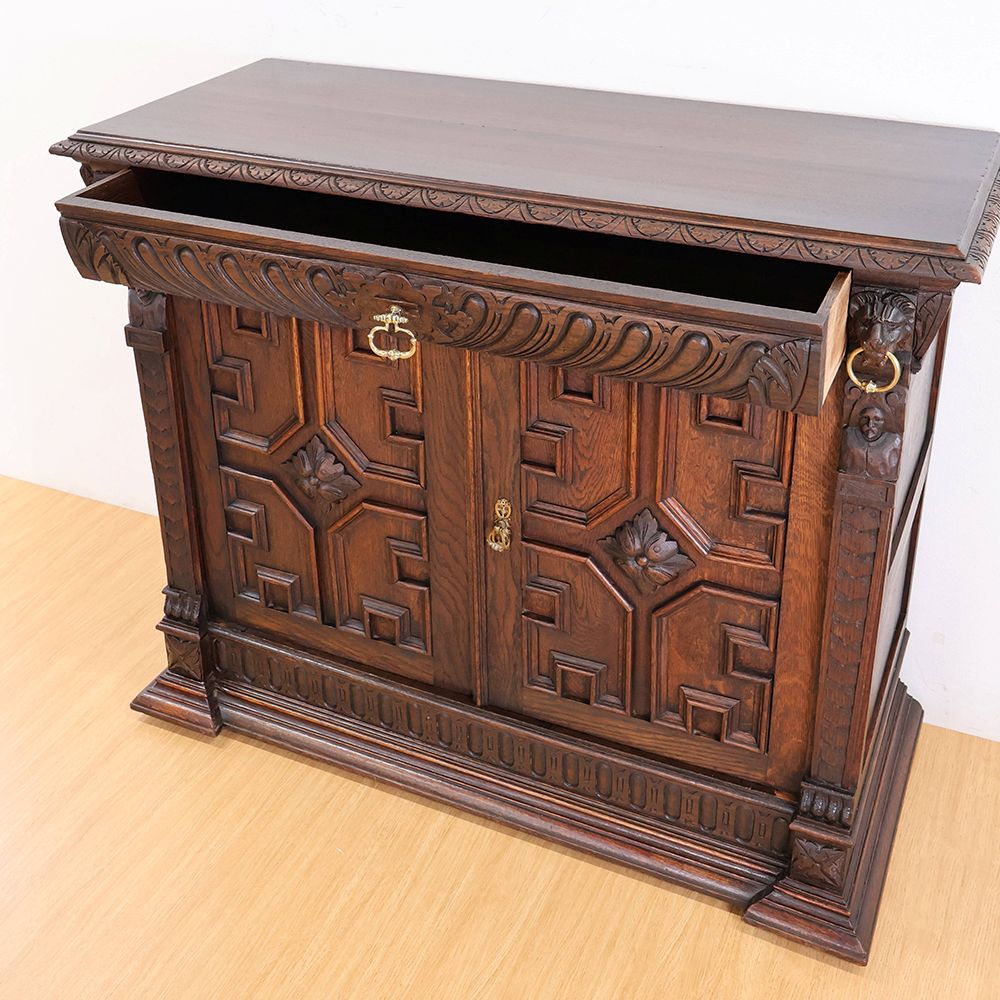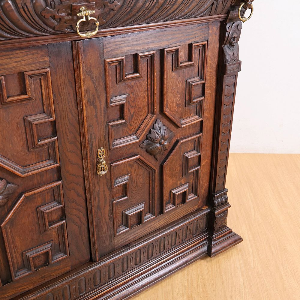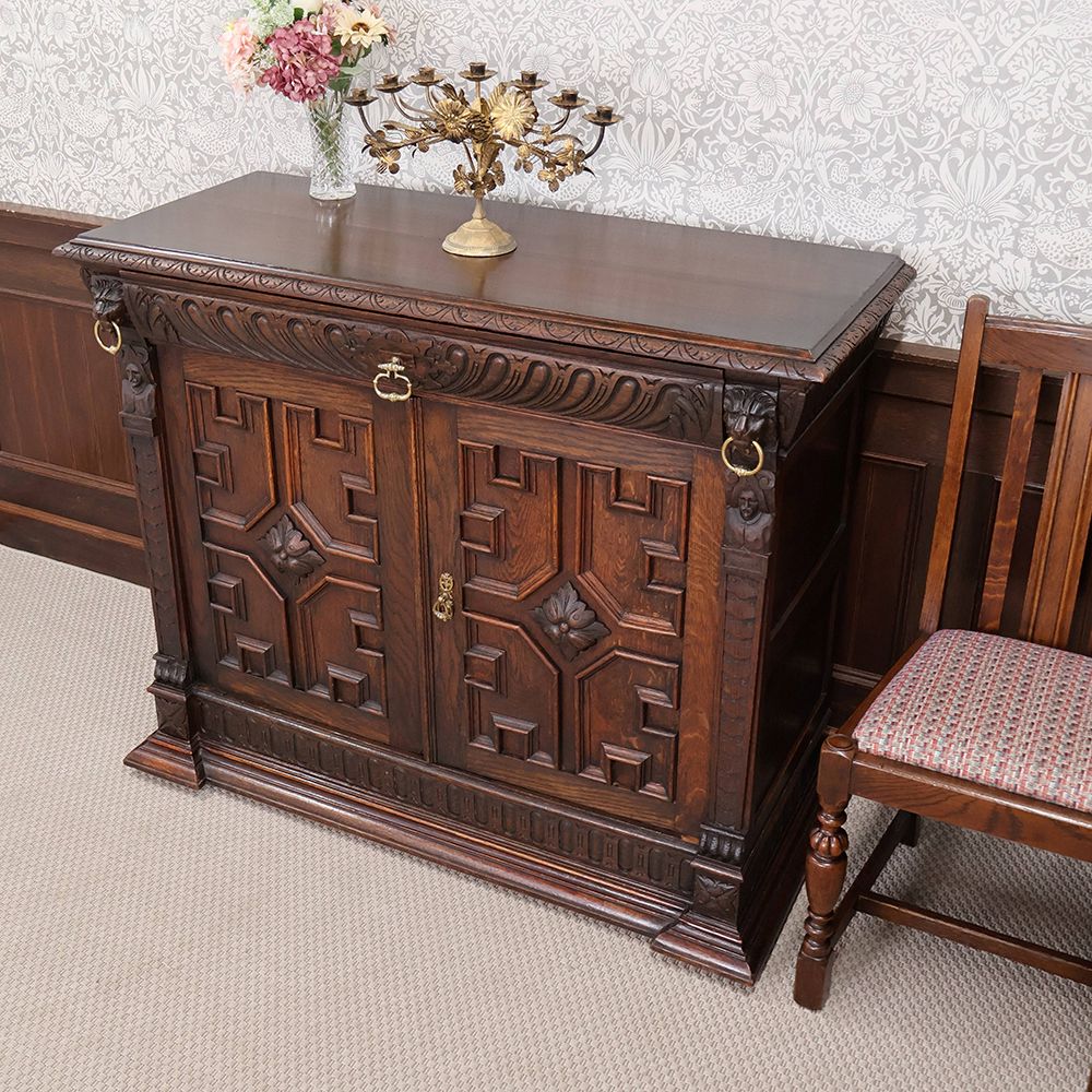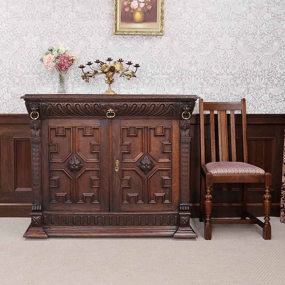 これだけの装飾があしらわれても華美になりすぎず、しっかりと品格が感じられる逸品。切嵌め式の幾何学模様が視線を釘付けにする、贅沢なジャコビアン様式のアンティークです。