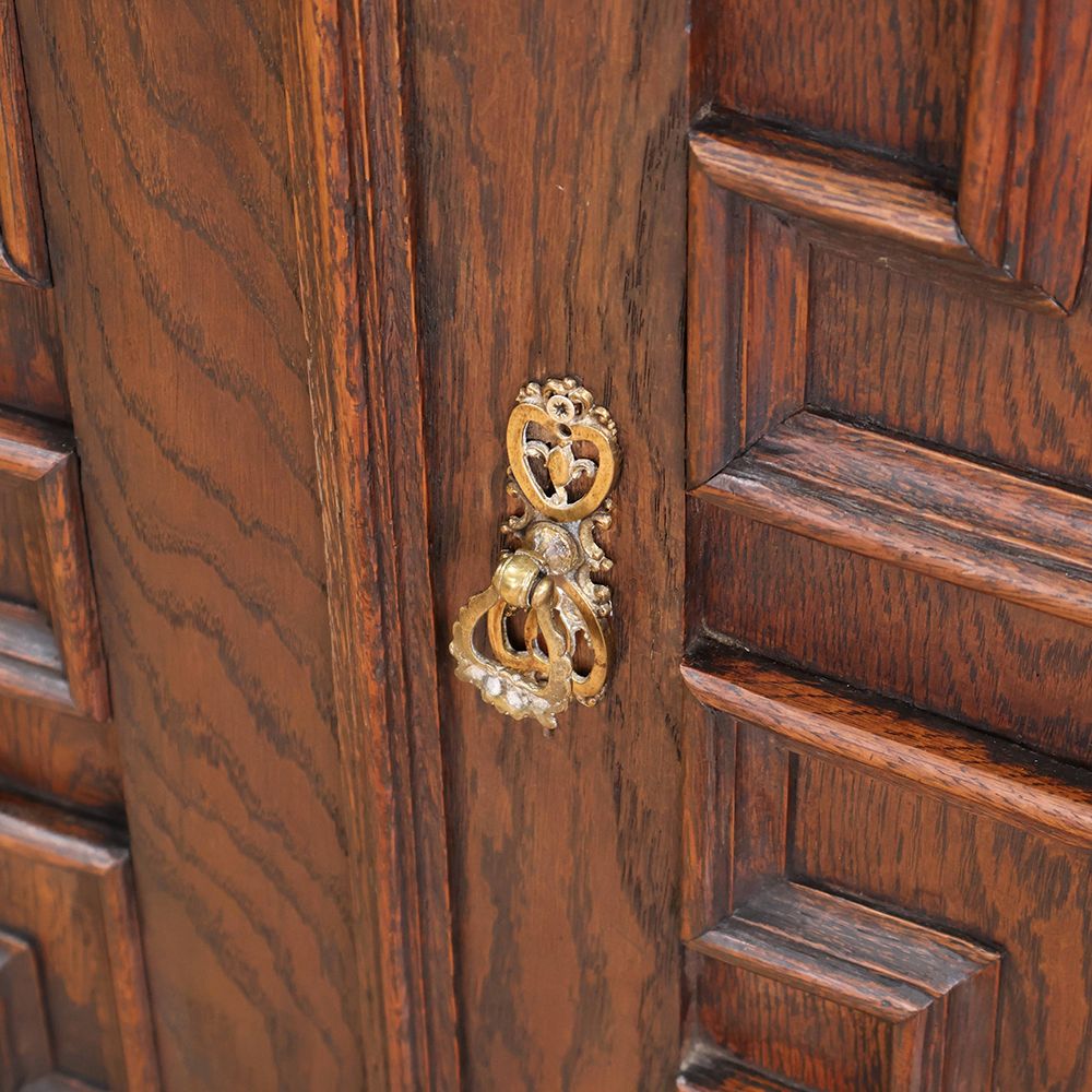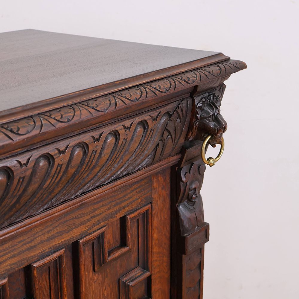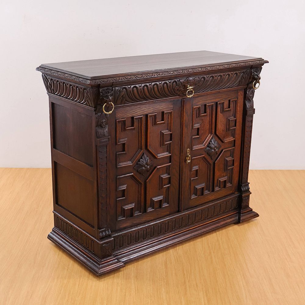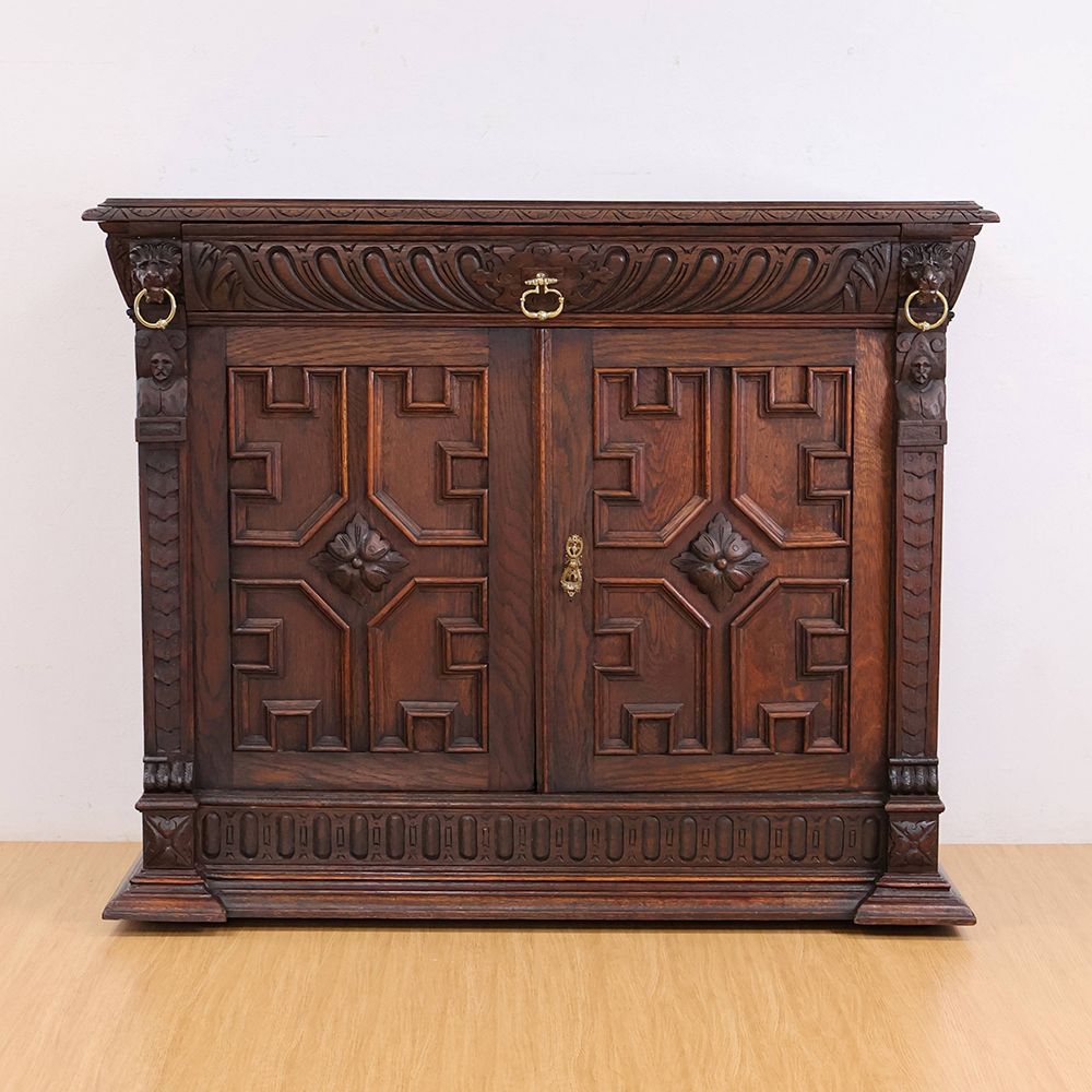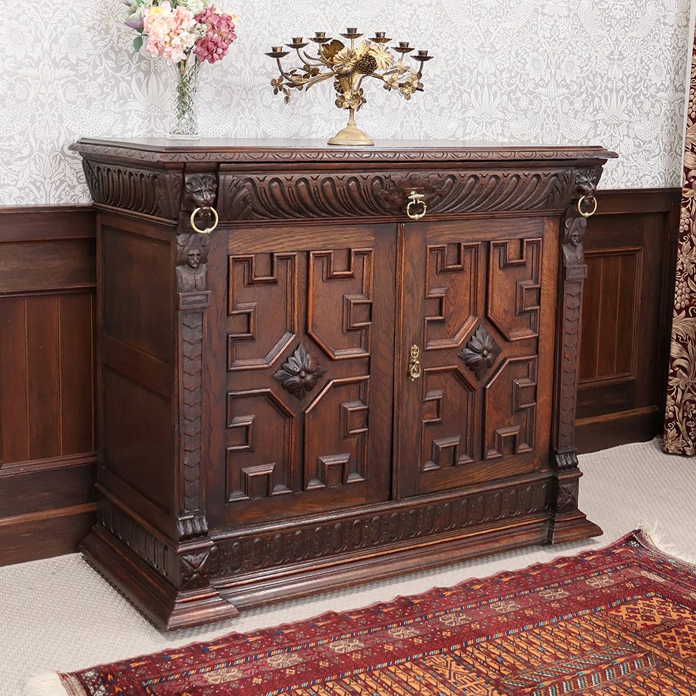 これだけの装飾があしらわれても華美になりすぎず、しっかりと品格が感じられる逸品。切嵌め式の幾何学模様が視線を釘付けにする、贅沢なジャコビアン様式のアンティークです。