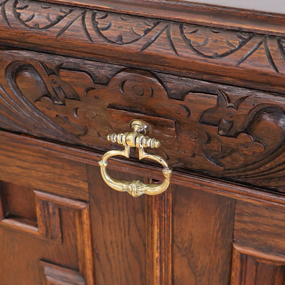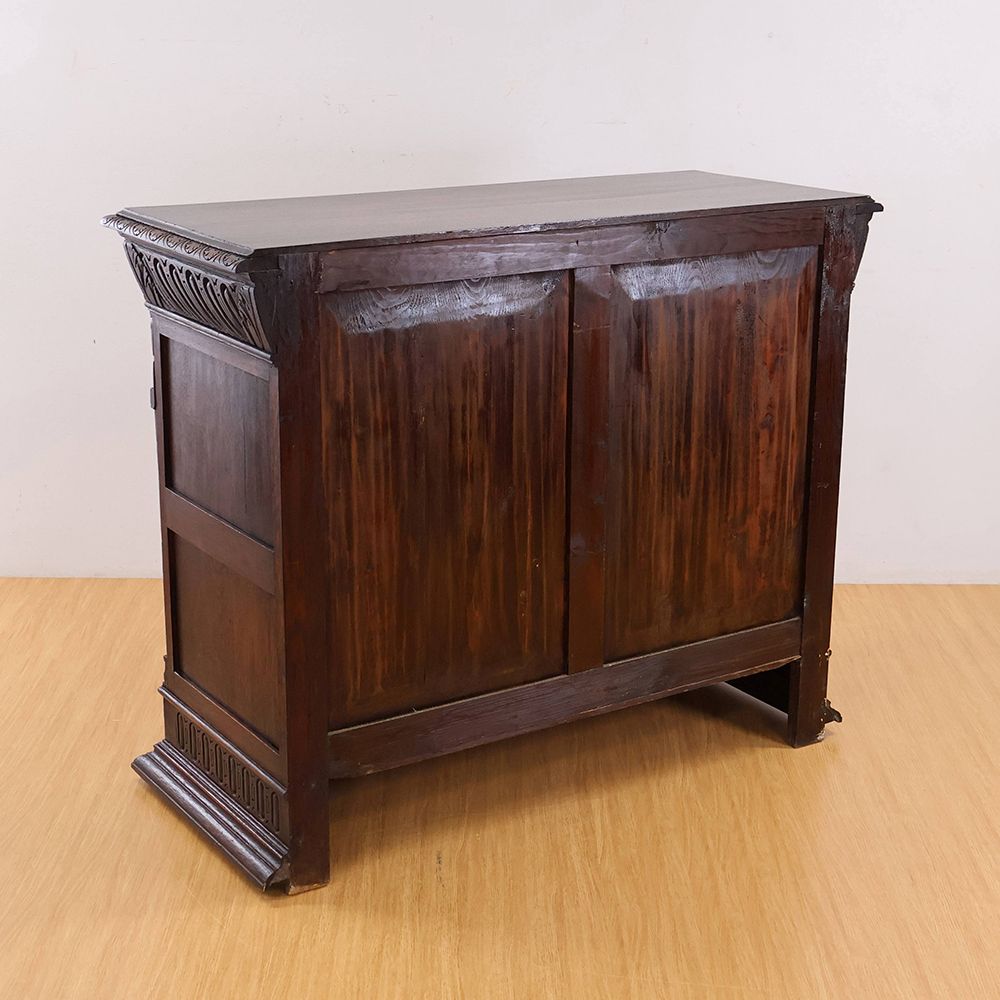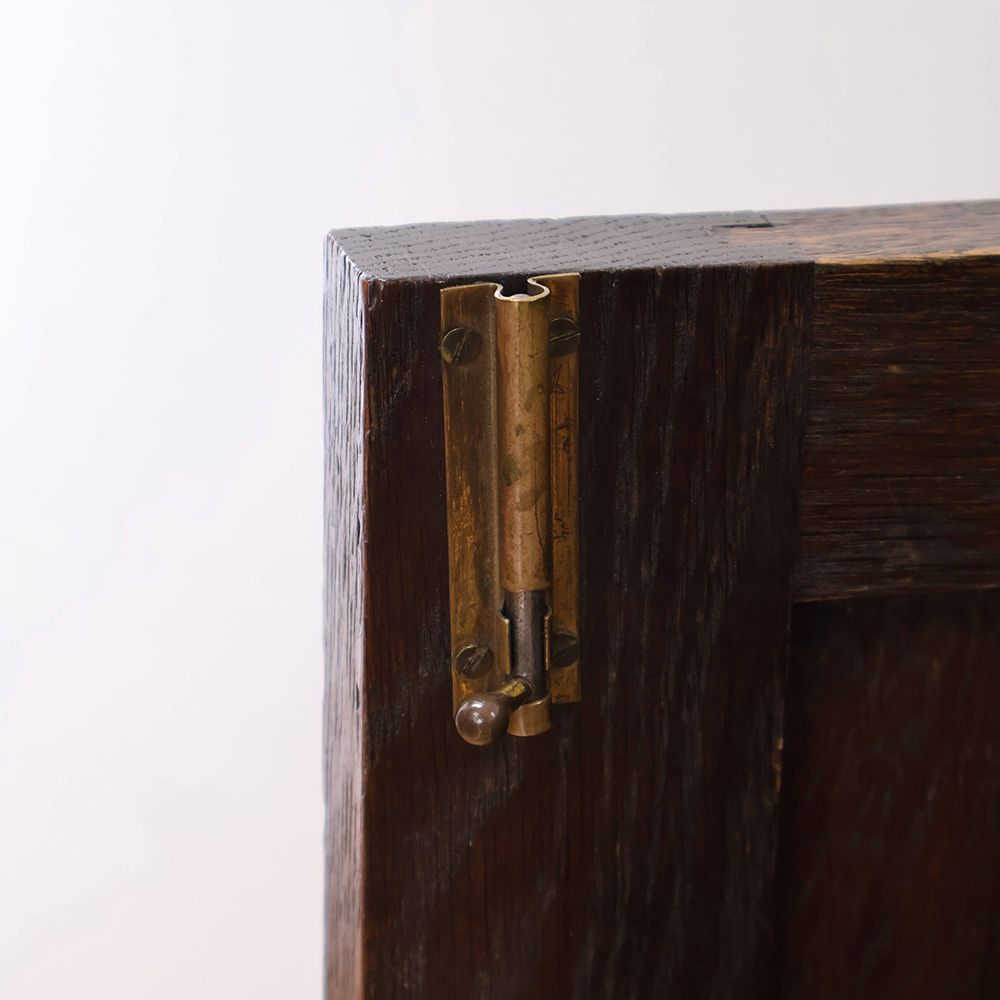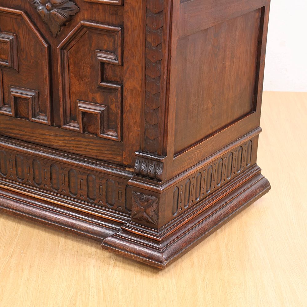 正面扉の装飾はH型のパネルを組みませた切嵌め式のデザイン。幾何学模様の華やかなジャコビアン様式です。