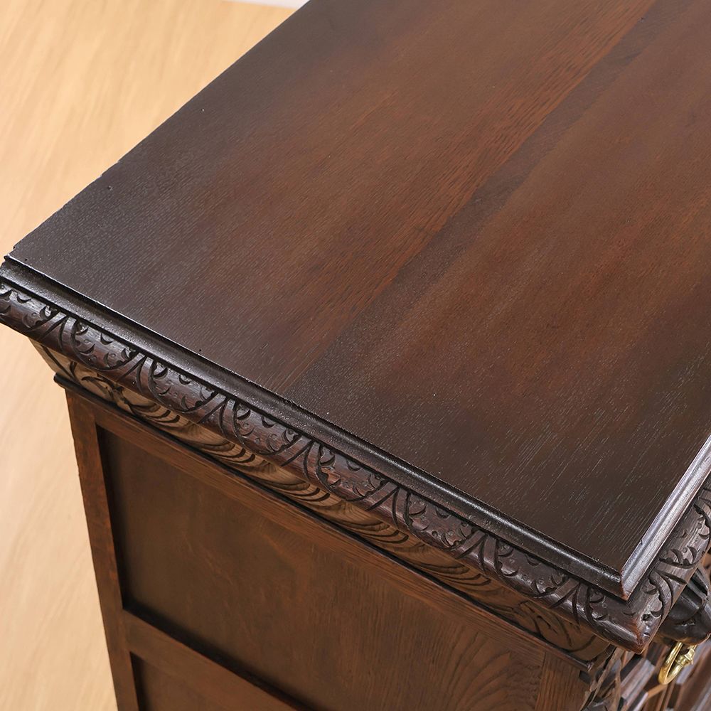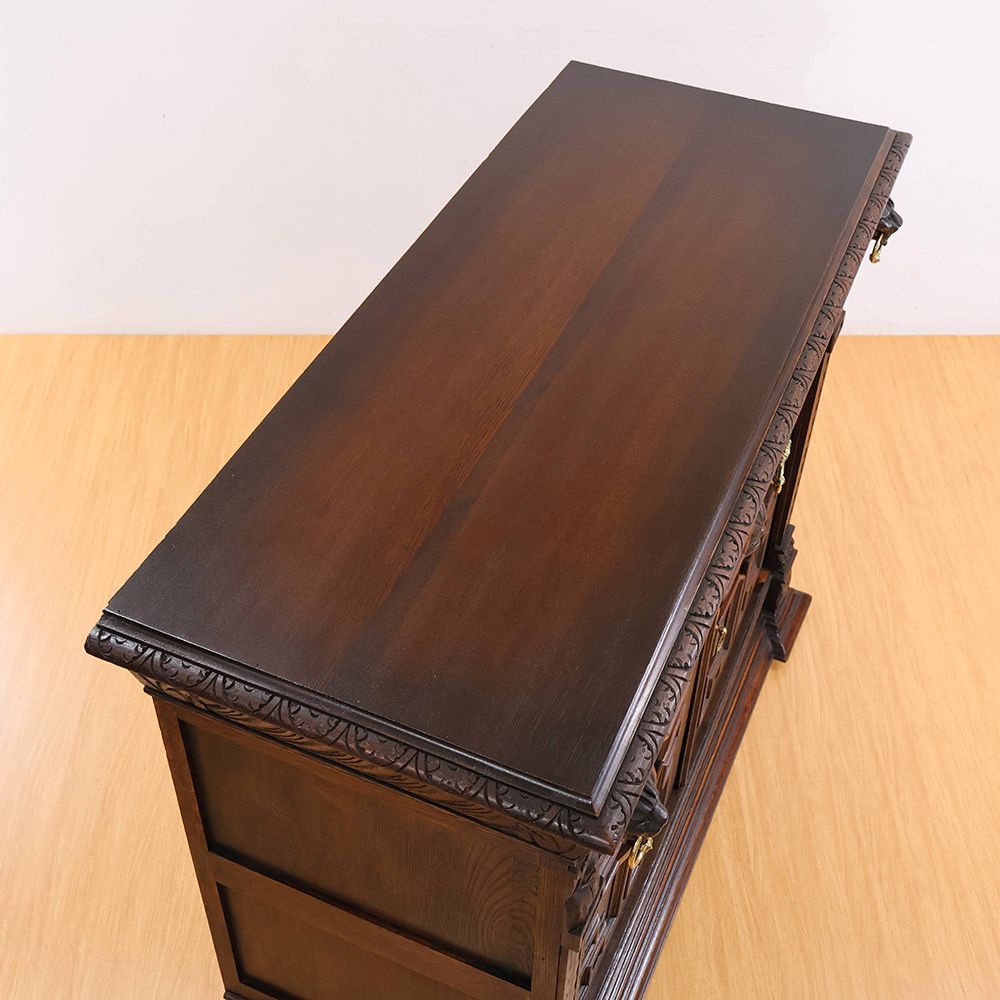 オーク深い色は、明るいお部屋のインテリアをキリッと引き締めるシックなアクセントに。装飾が細やかに彫り込まれて、隅々まで視線を誘う丁寧な作りが自慢です。