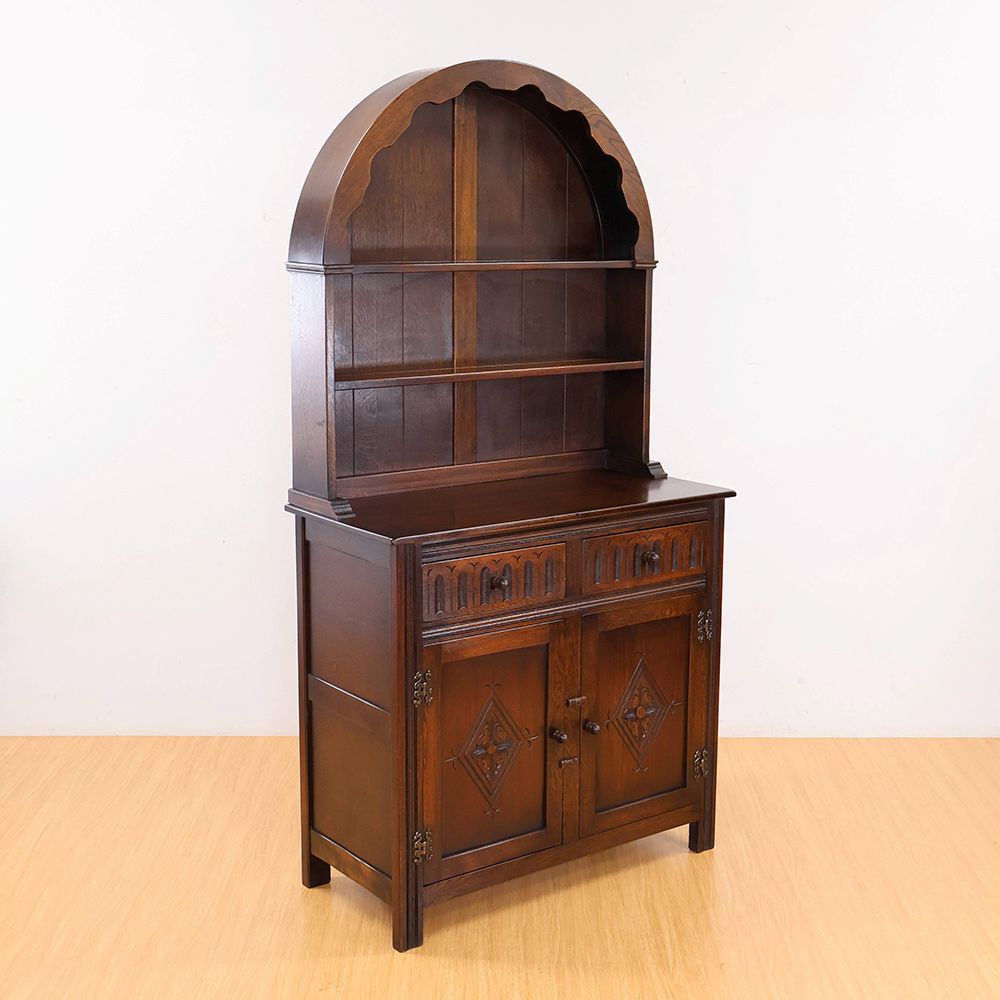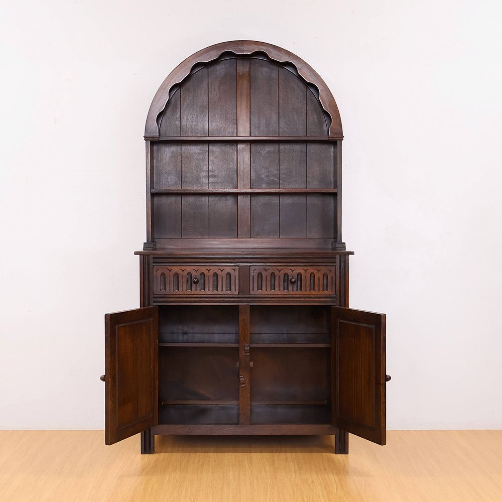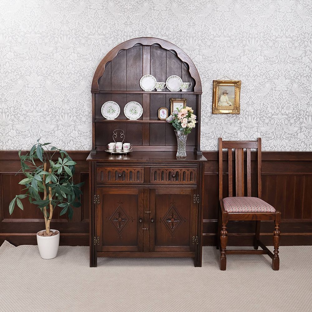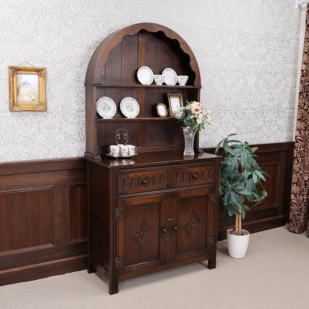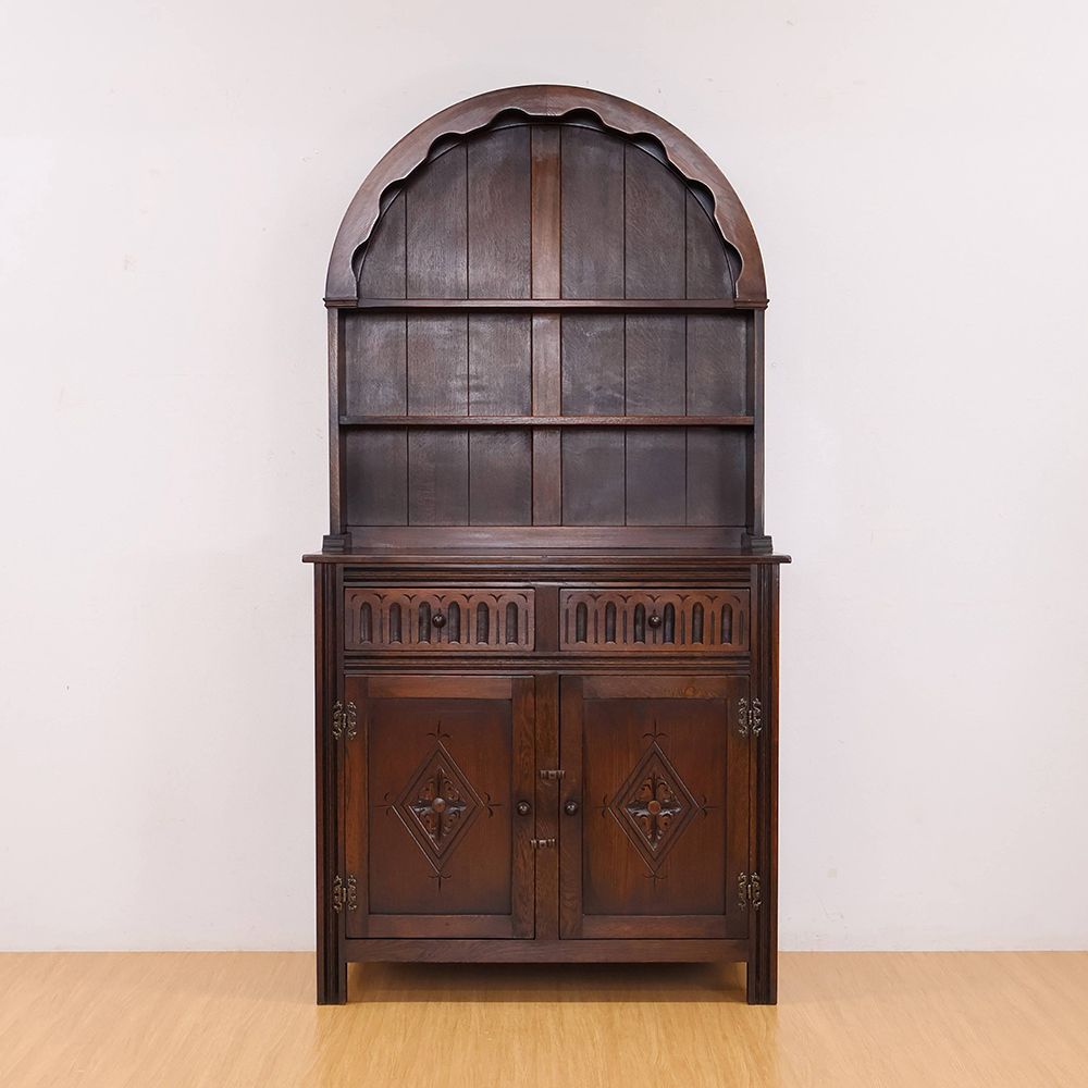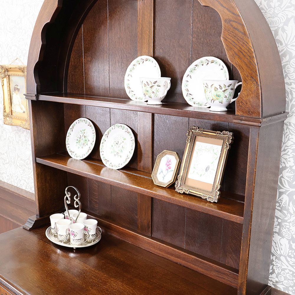 しっとりと深みのある木肌に、アーチ状の上部と繊細な彫刻が自慢の食器棚が入荷いたしました。