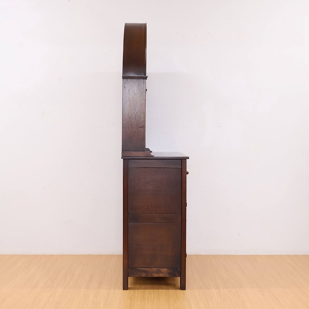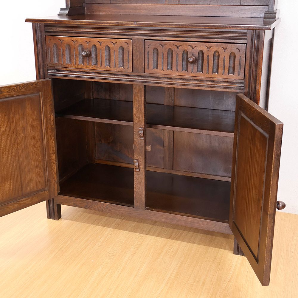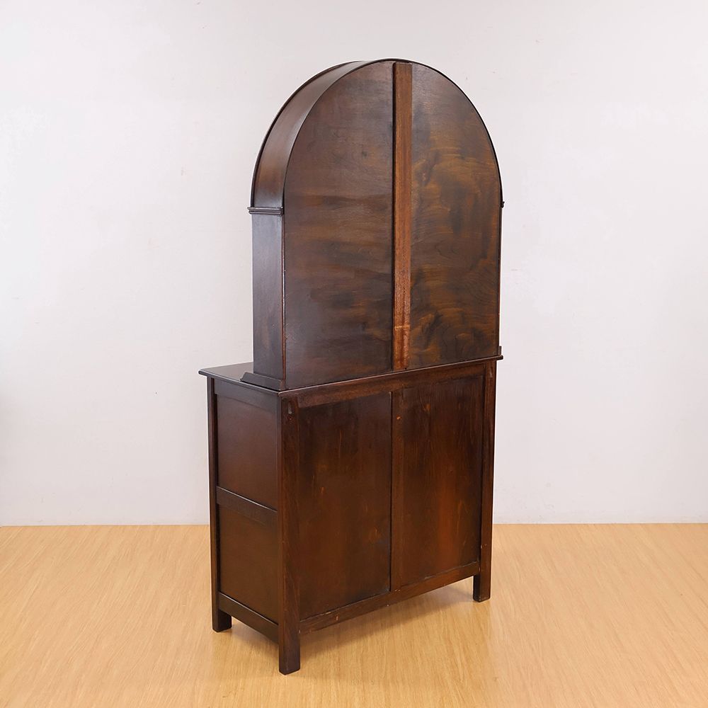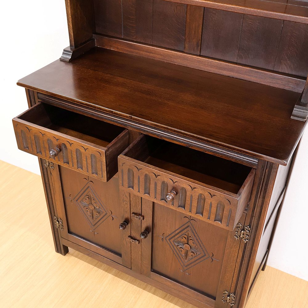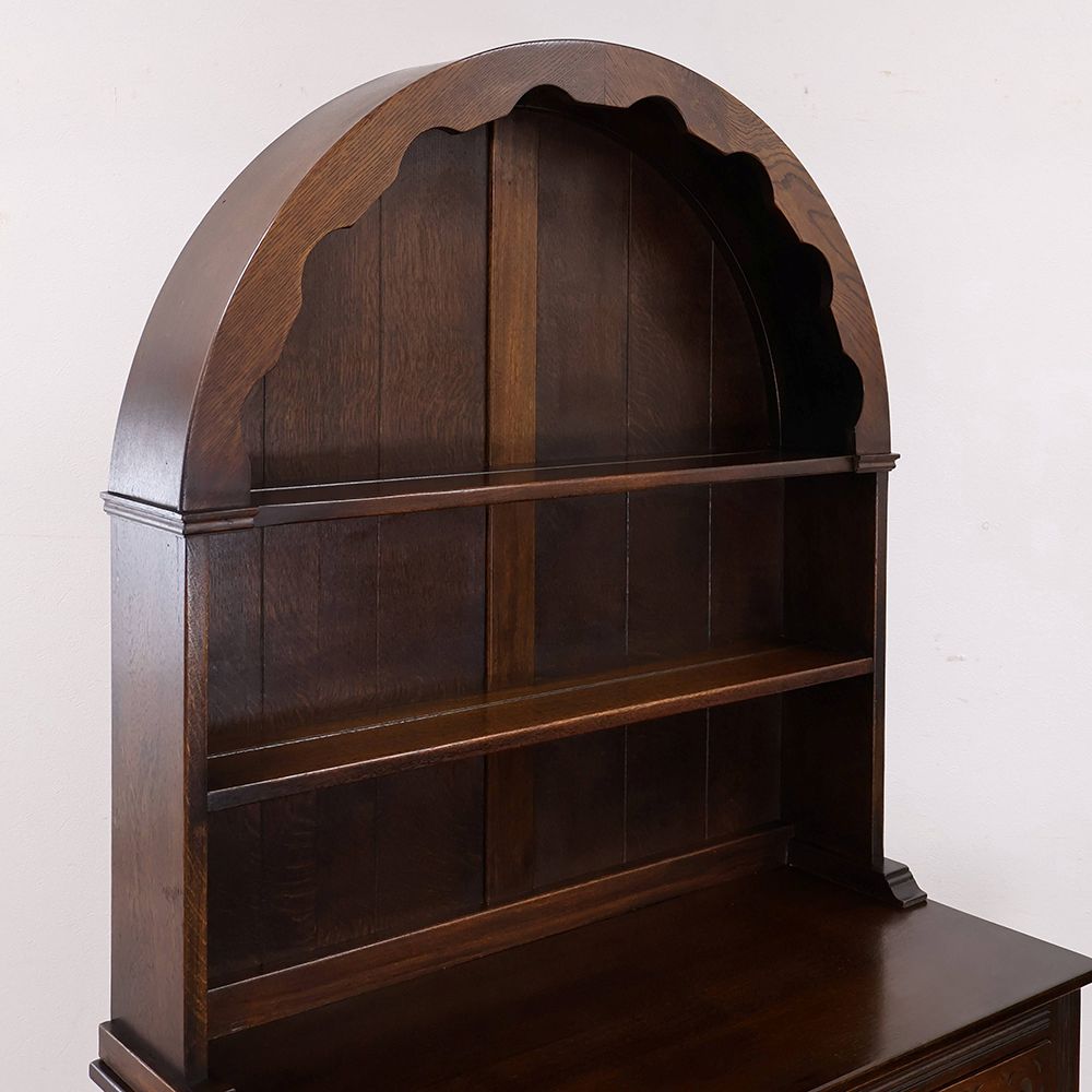 しっとりと深みのある木肌に、アーチ状の上部と繊細な彫刻が自慢の食器棚が入荷いたしました。