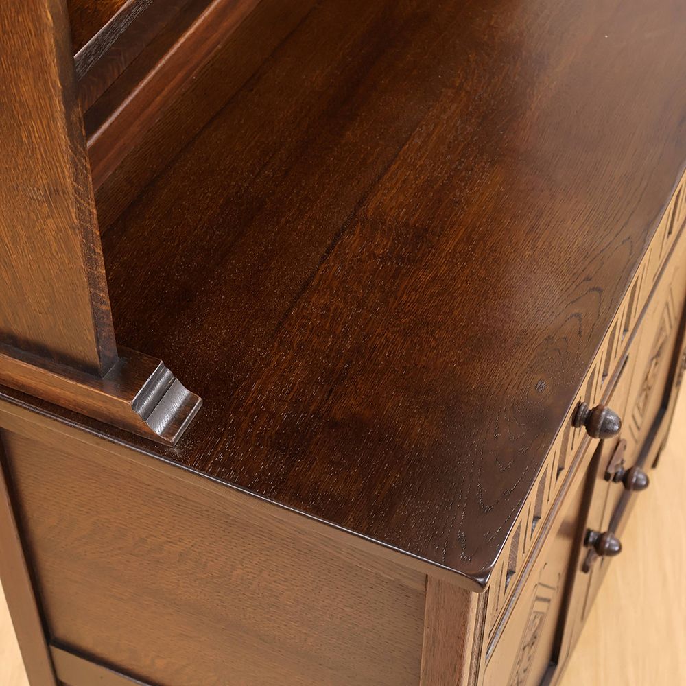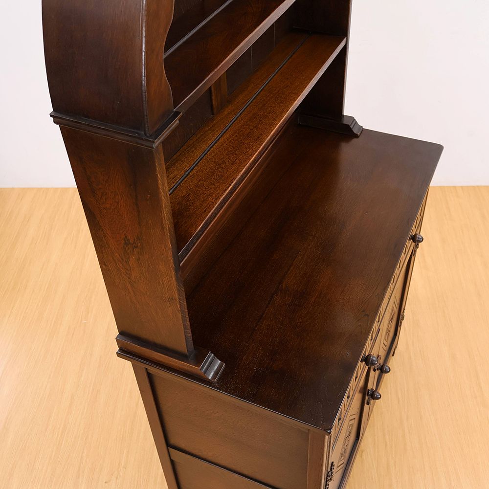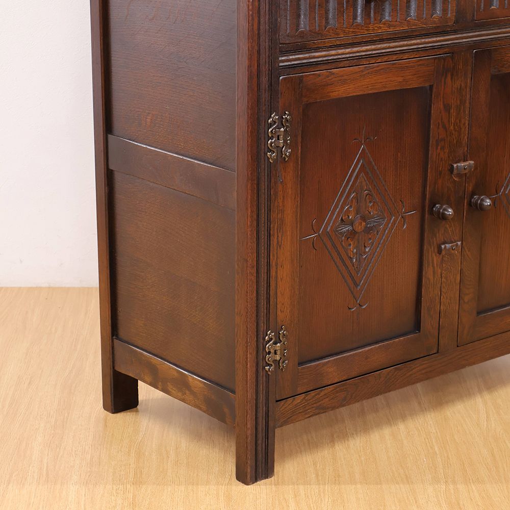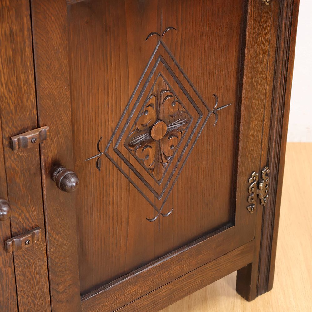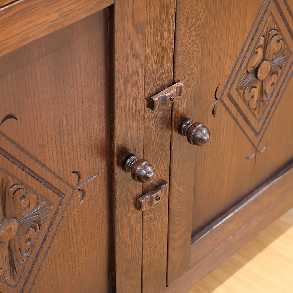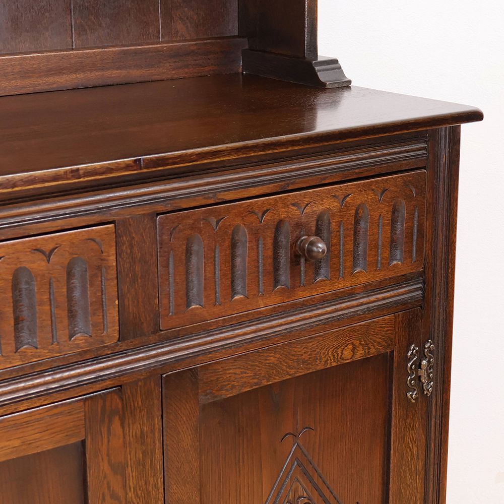しっとりと深みのある木肌に、アーチ状の上部と繊細な彫刻が自慢の食器棚が入荷いたしました。