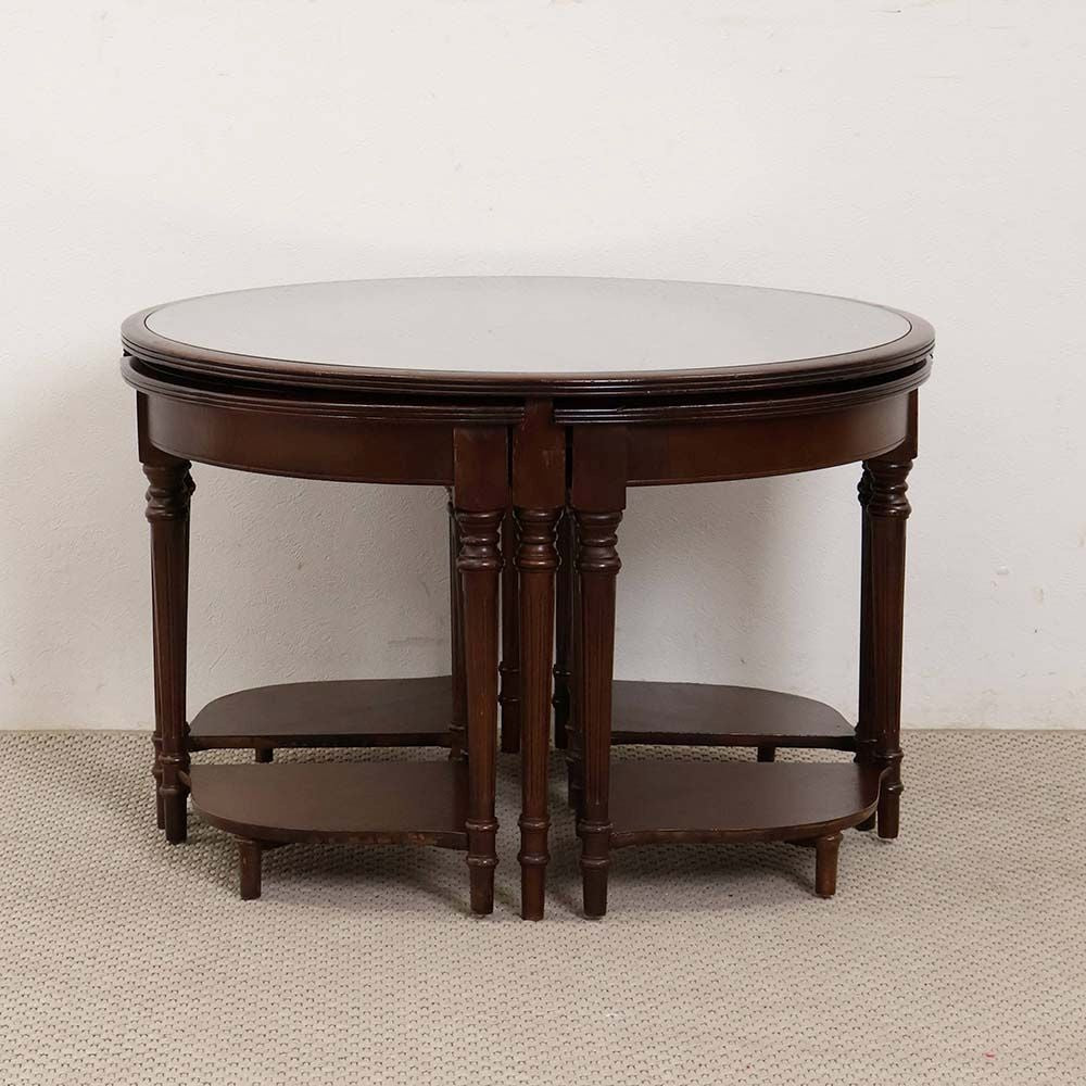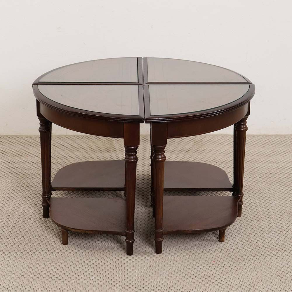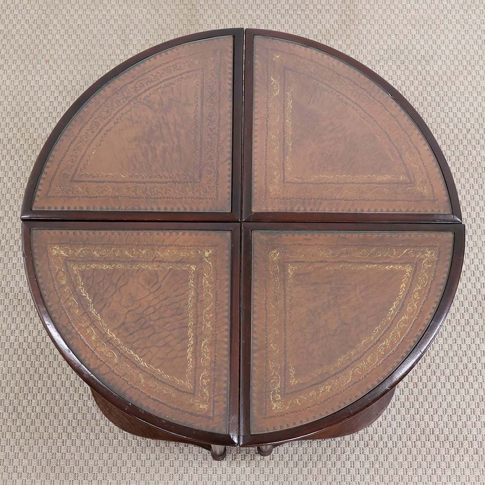 このネストテーブルは、丸テーブルの下にミニテーブルが4つ付いたユニークな形。まるでパイやピザを取り分けるように三角型のミニテーブルを引き出して使います。