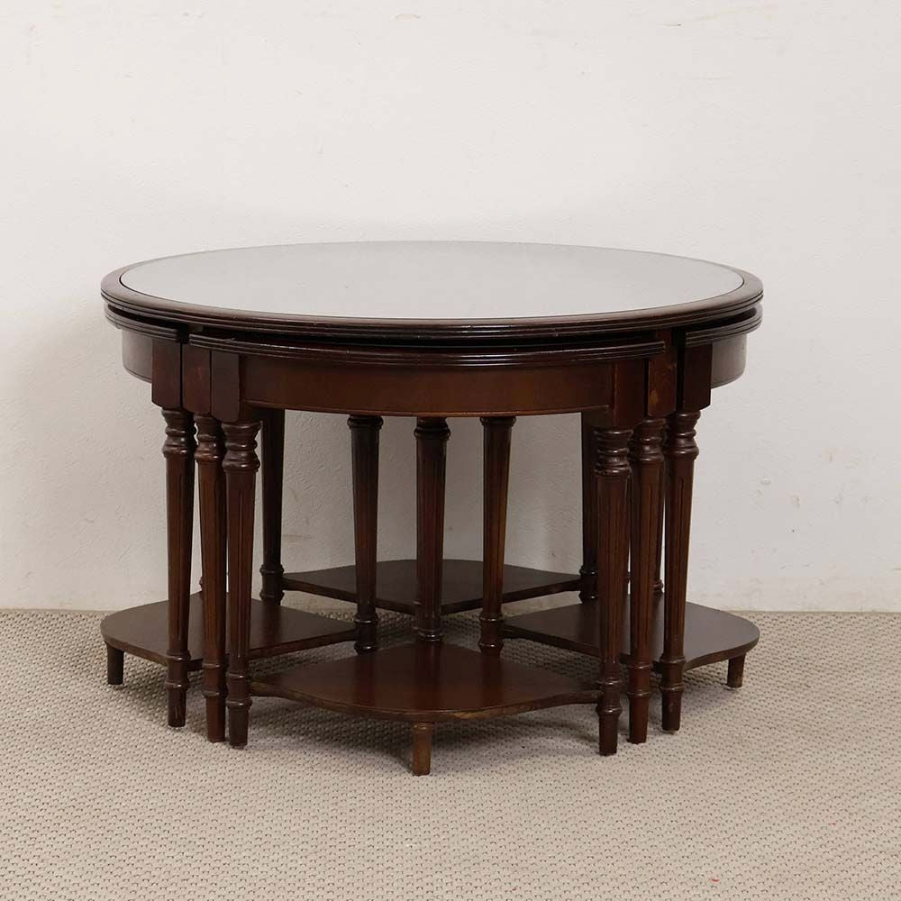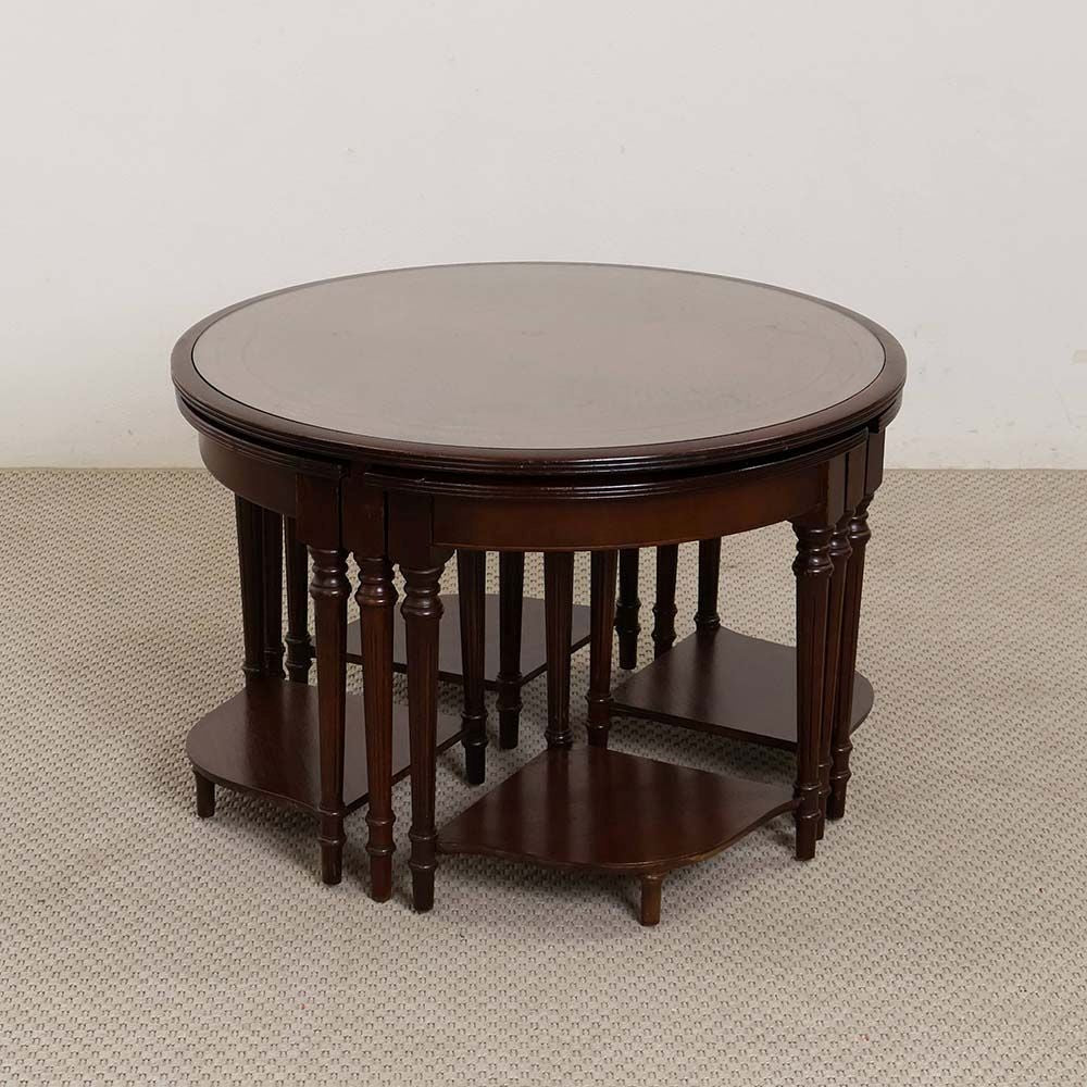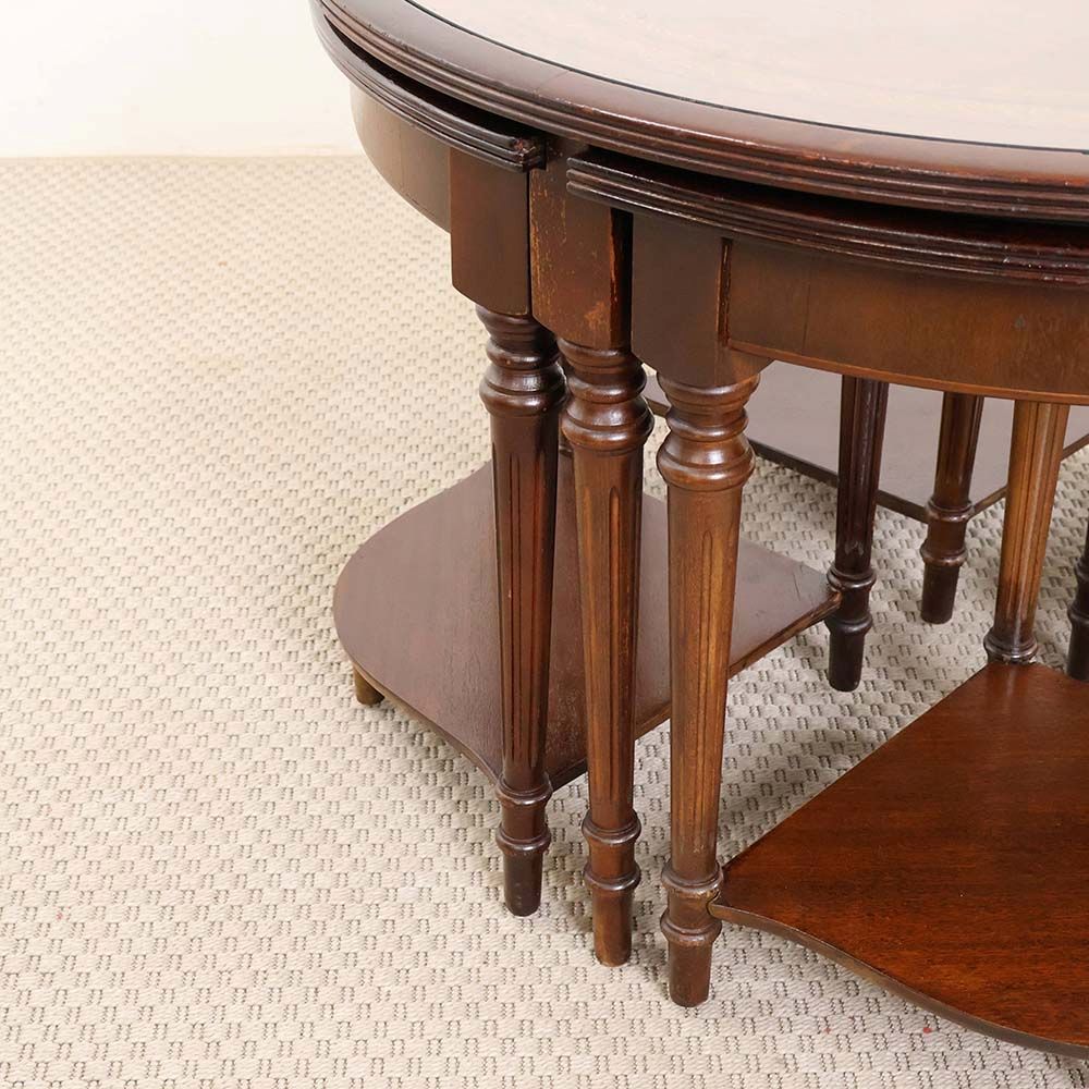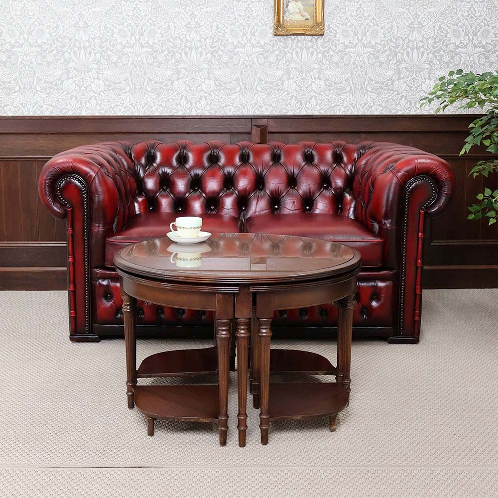 脚に素敵な装飾をあしらったマホガニーのテーブルには、箔押しの革張りの天板。傍に置いて使うたびにリッチな気分にさせてくれるネストテーブルが入荷しました。