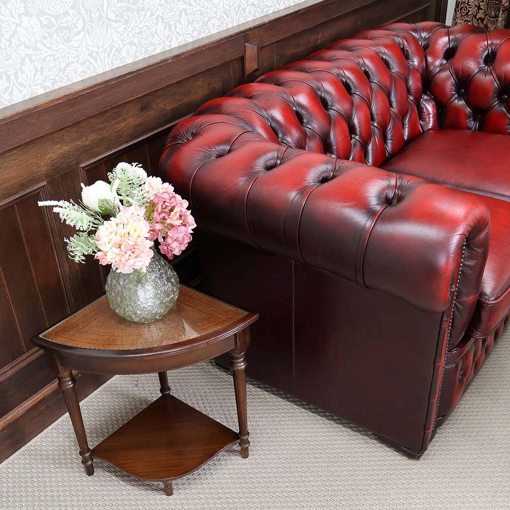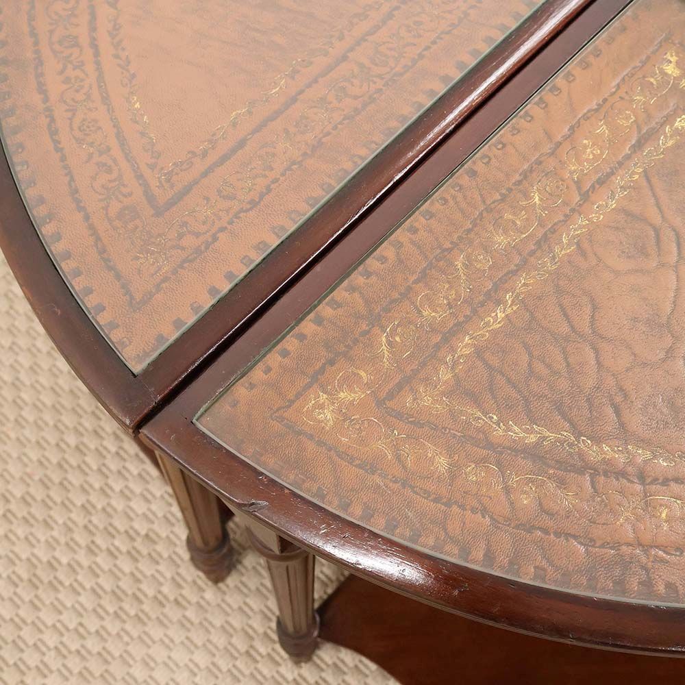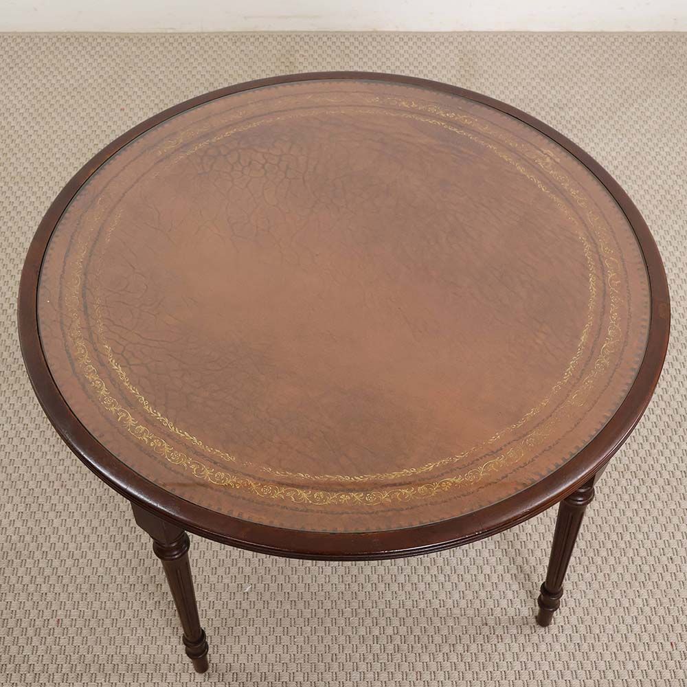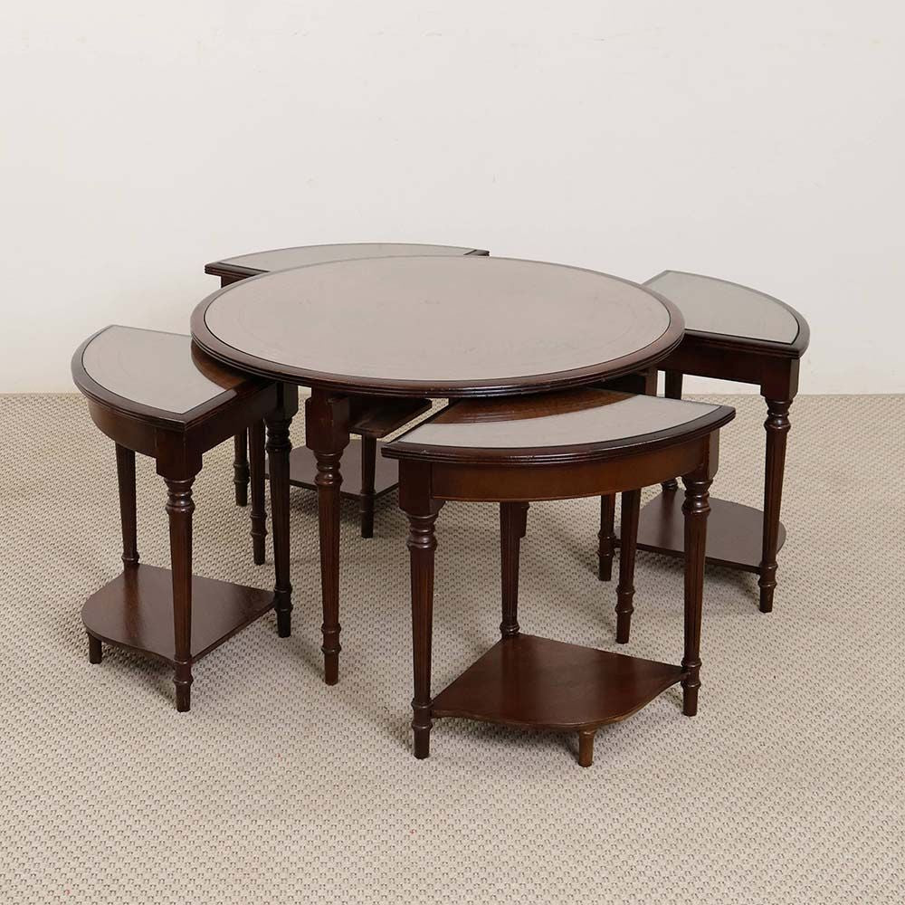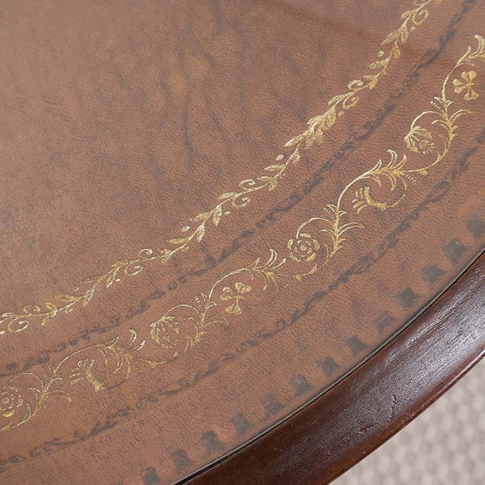 脚に素敵な装飾をあしらったマホガニーのテーブルには、箔押しの革張りの天板。傍に置いて使うたびにリッチな気分にさせてくれるネストテーブルが入荷しました。