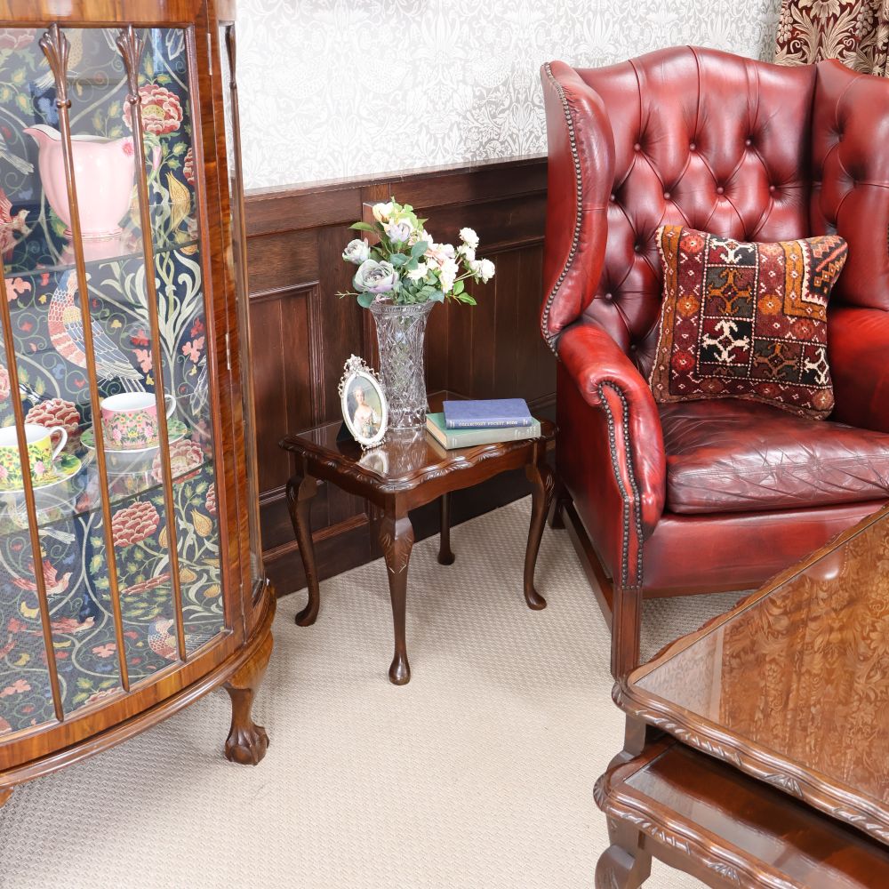 天板はマホガニーの芸術的な杢目がオシャレなアクセントに。スラリと伸びた猫脚にも彫りの装飾があしらわれて、目を楽しませてくれるオシャレなヴィンテージなんですよ♪