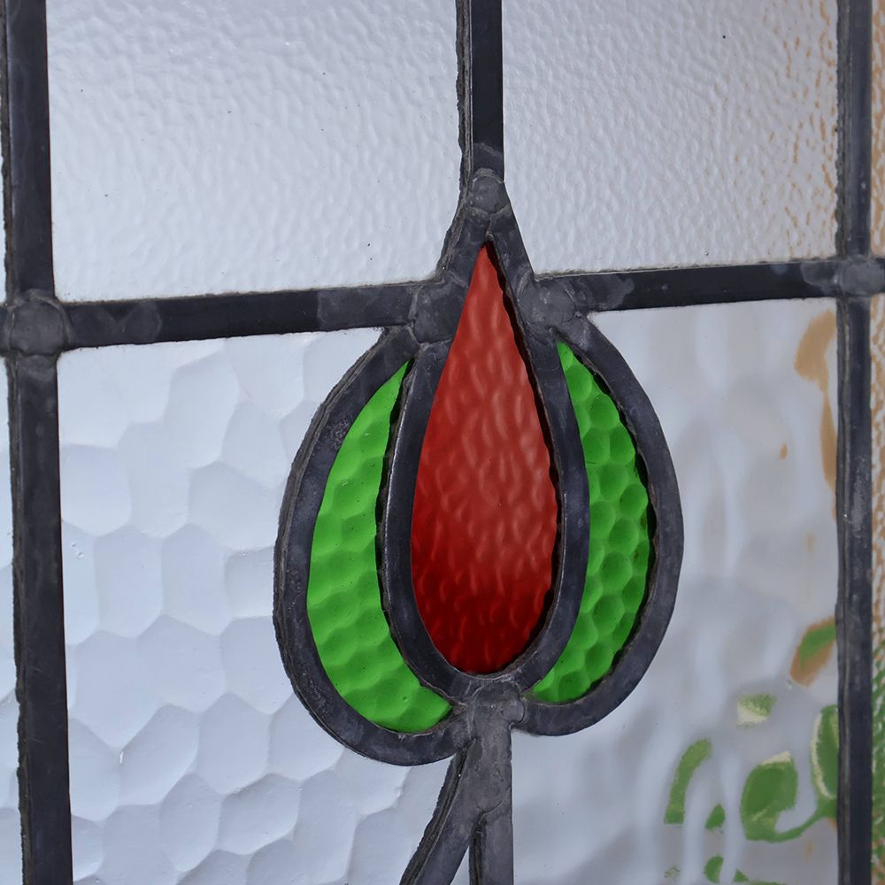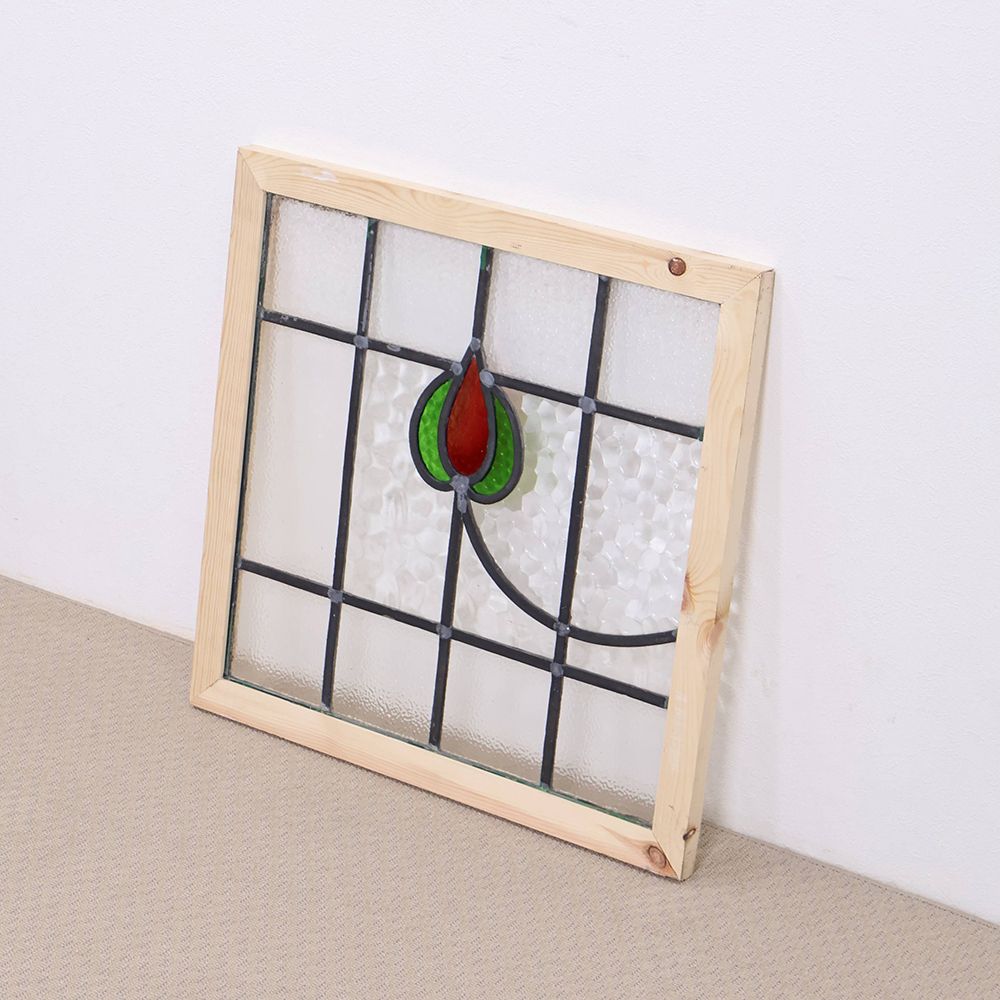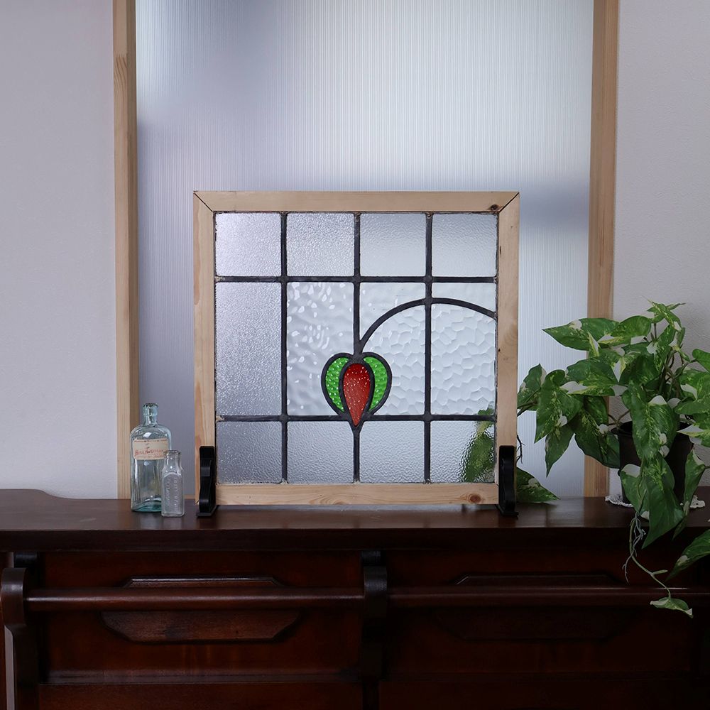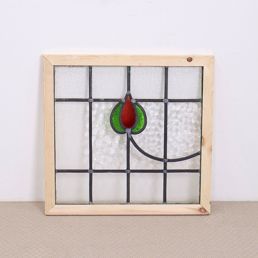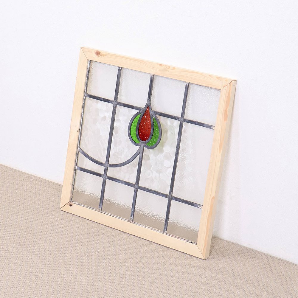 中央に配されたモチーフは、まるで蕾のよう。モチーフからフレームのフチまで曲線を描いて伸びるケイム(鉛線)が、おそらくは大きな窓の模様の一つだったことを物語る、可憐な1枚です。