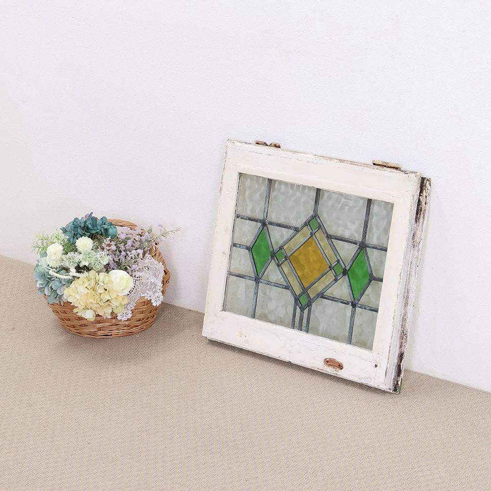 このステンドグラスは、白くペイントされたシャビーなフレームが印象的。