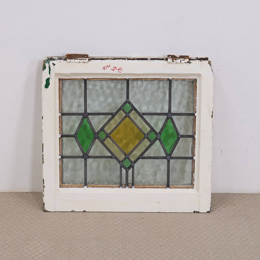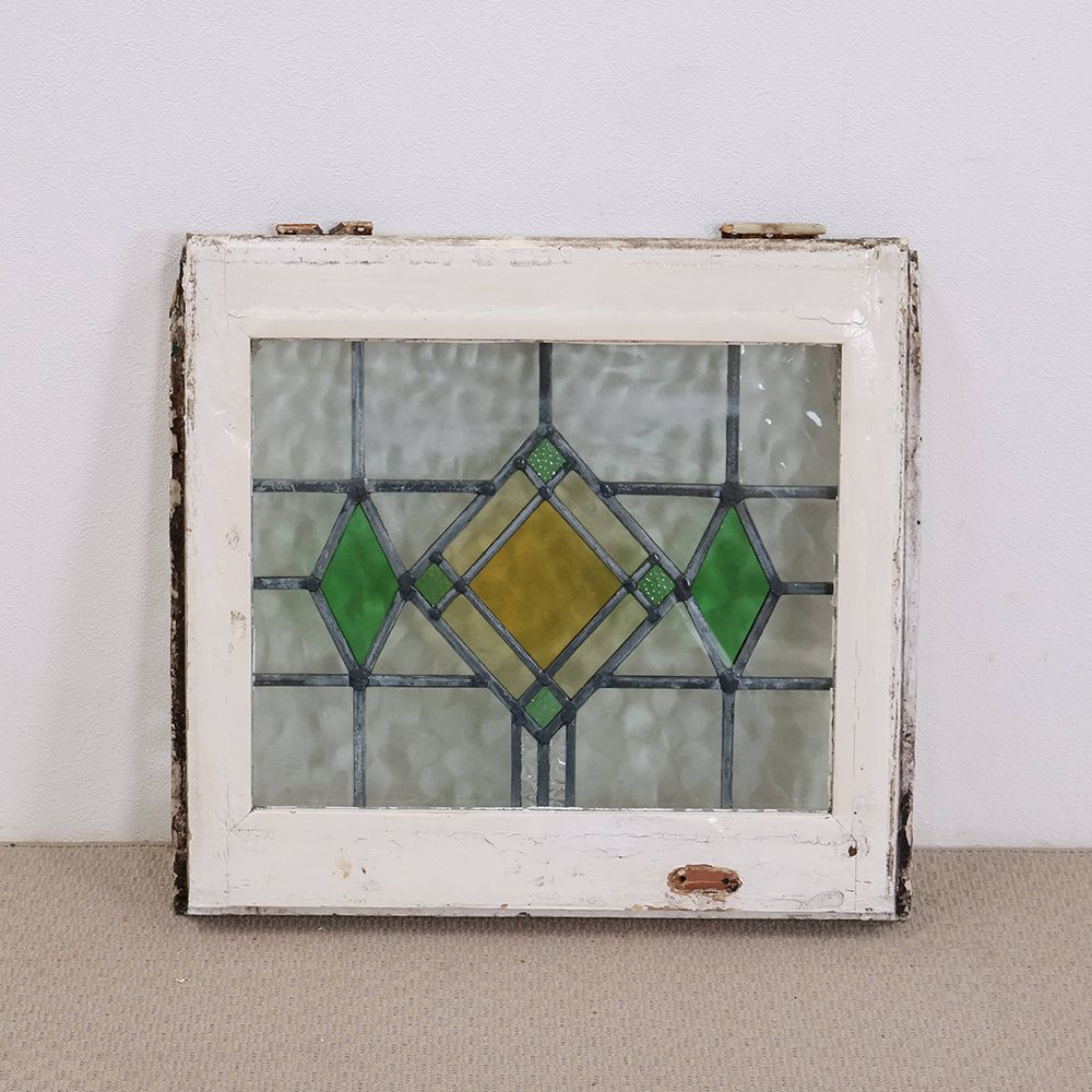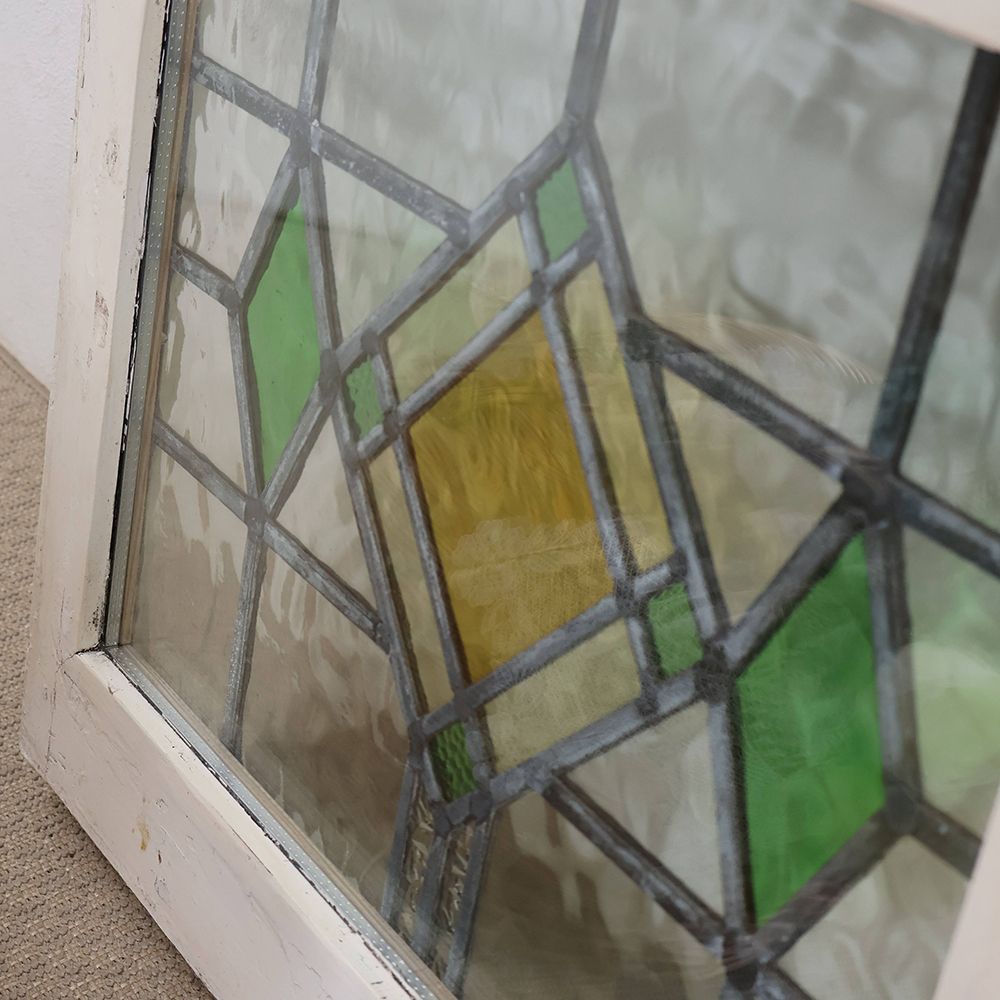 白い窓枠に組み込まれたステンドグラスは、ダイヤのモチーフをつないだ幾何学模様です。