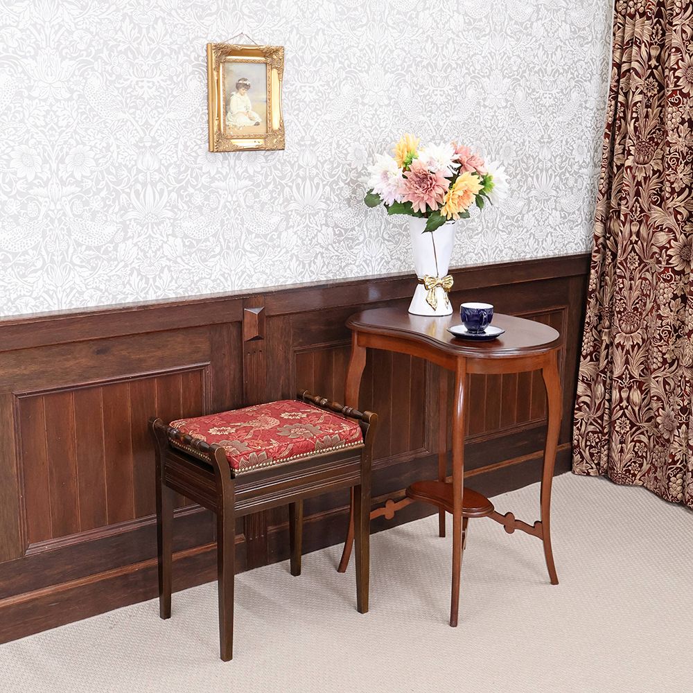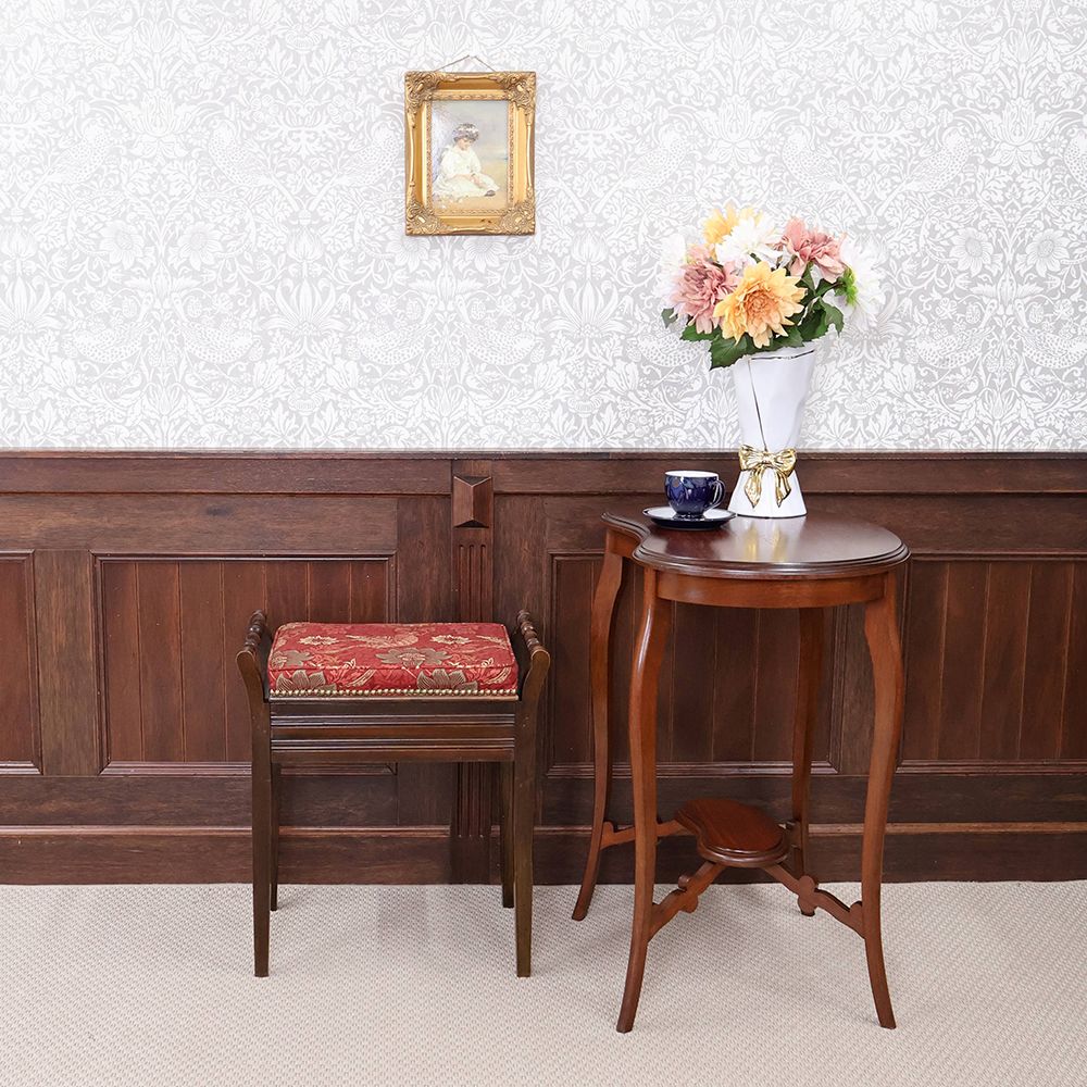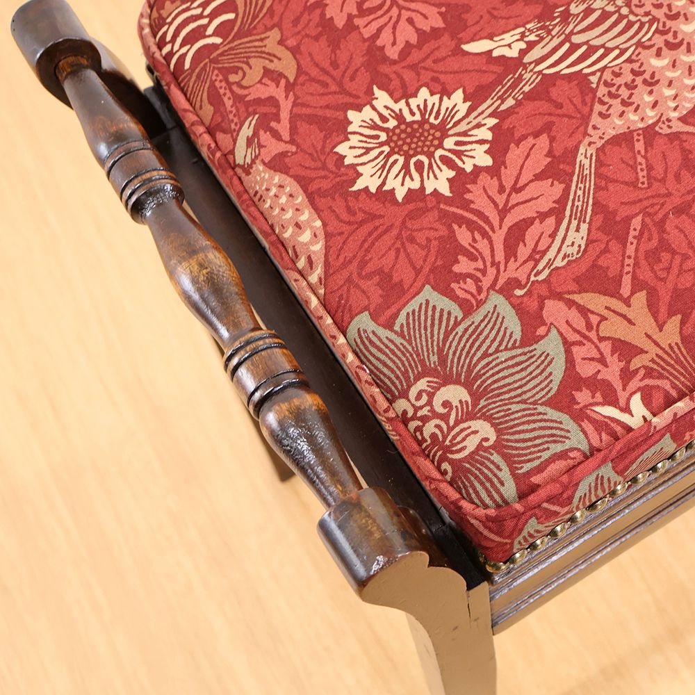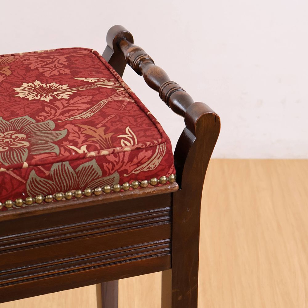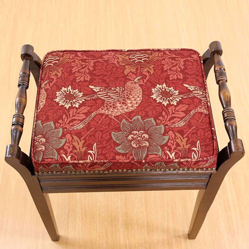 座面は当店でモリスの「Bird & Anemone」で張り替えました。現在は販売されていない希少なファブリックを贅沢に使い、キラリと輝く鋲飾りで縁取って、ピアノスツールのあでやかなアクセントに。