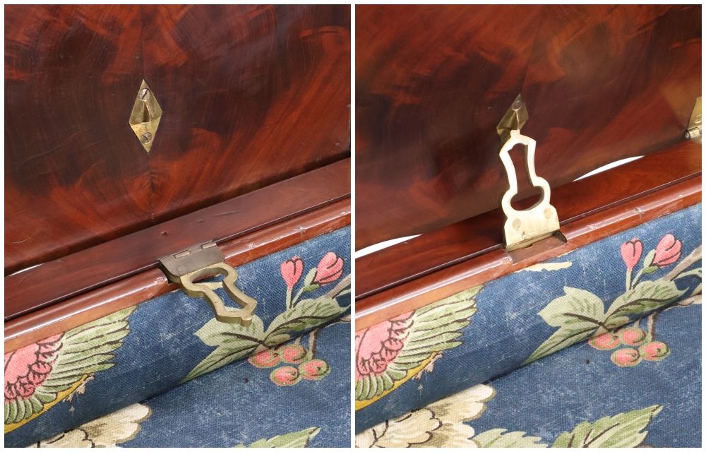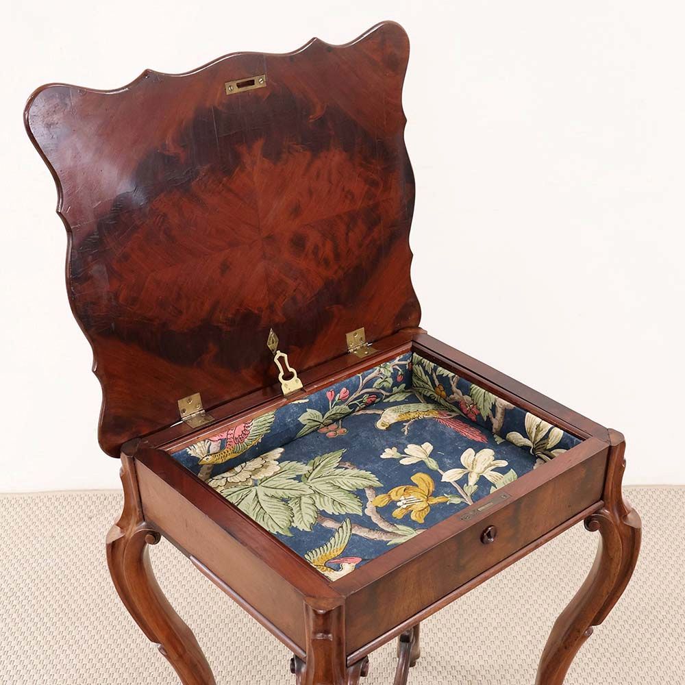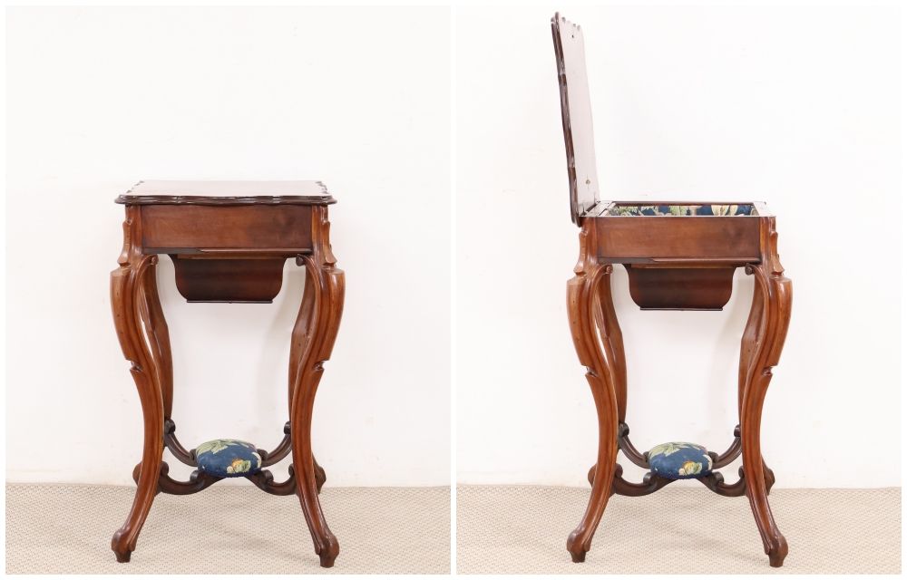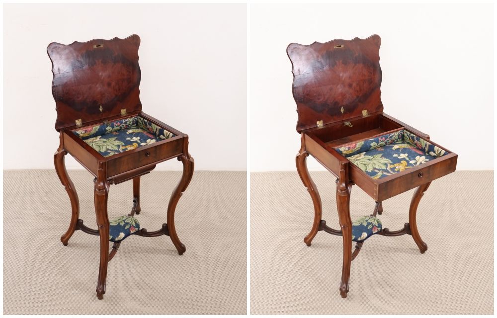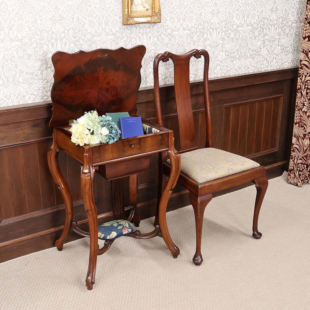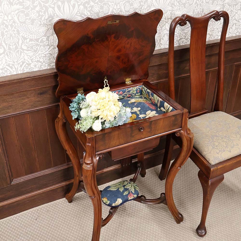 このソーイングワークテーブルは、天板を持ち上げると中を収納箱として使えるテーブルです。とても美しい作りなので、当時はリビングなどにこのテーブルを置いて、必要な時にサッと開けてレースを編んだり、刺繍を縫い込んだりしていたかもしれません。