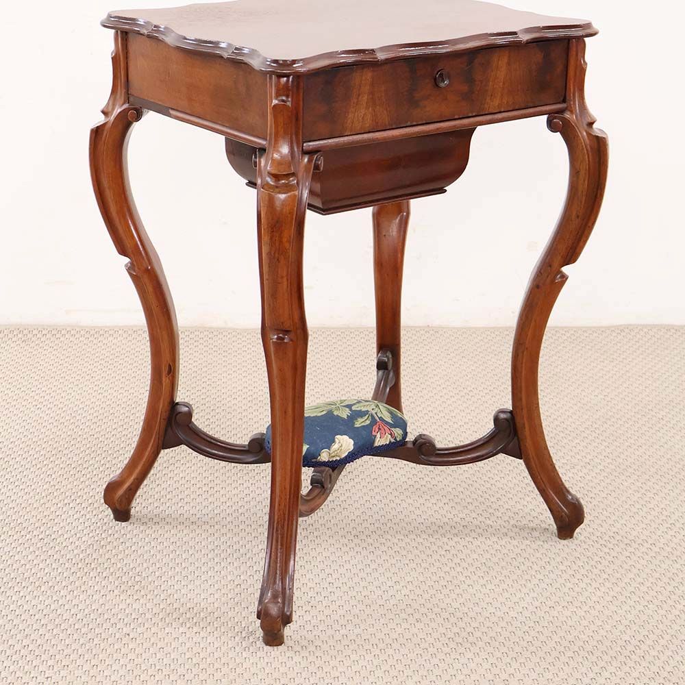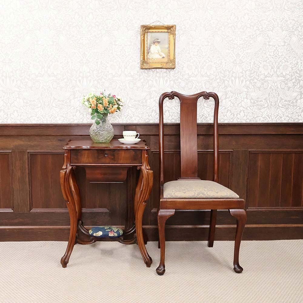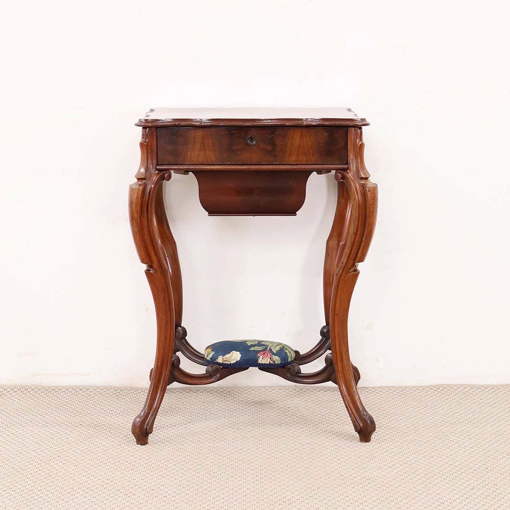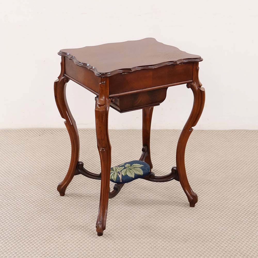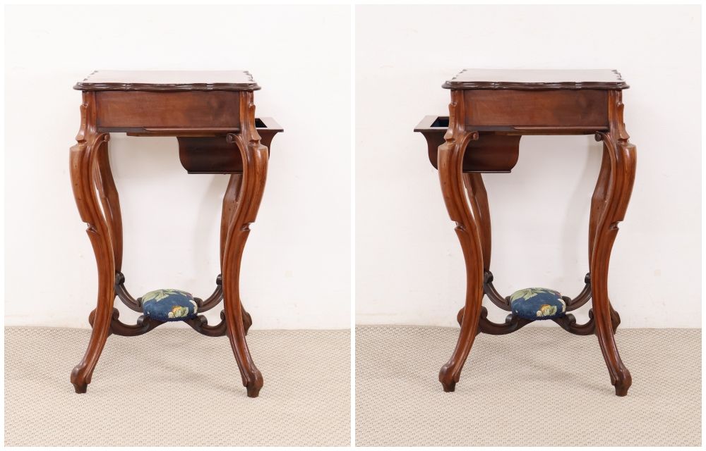 S字にカーブする猫足が優雅なソーイングワークテーブルは、まるでオケ―ジョナルテーブルのようにオシャレな佇まい。