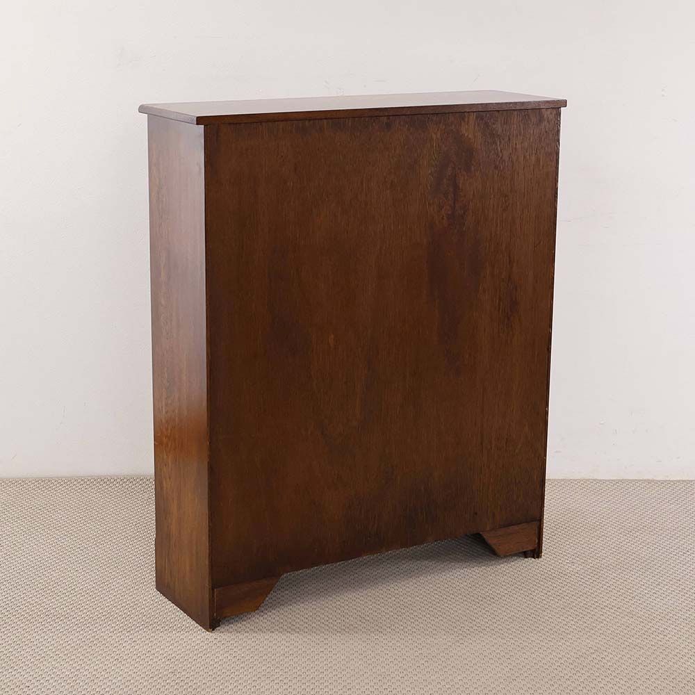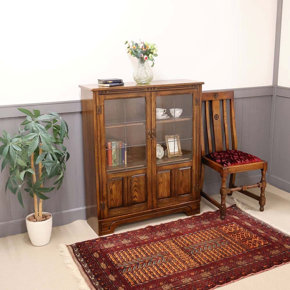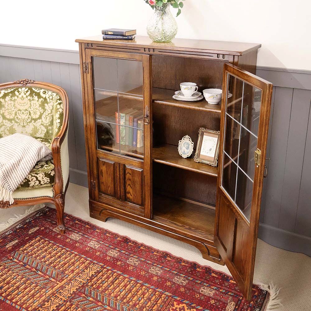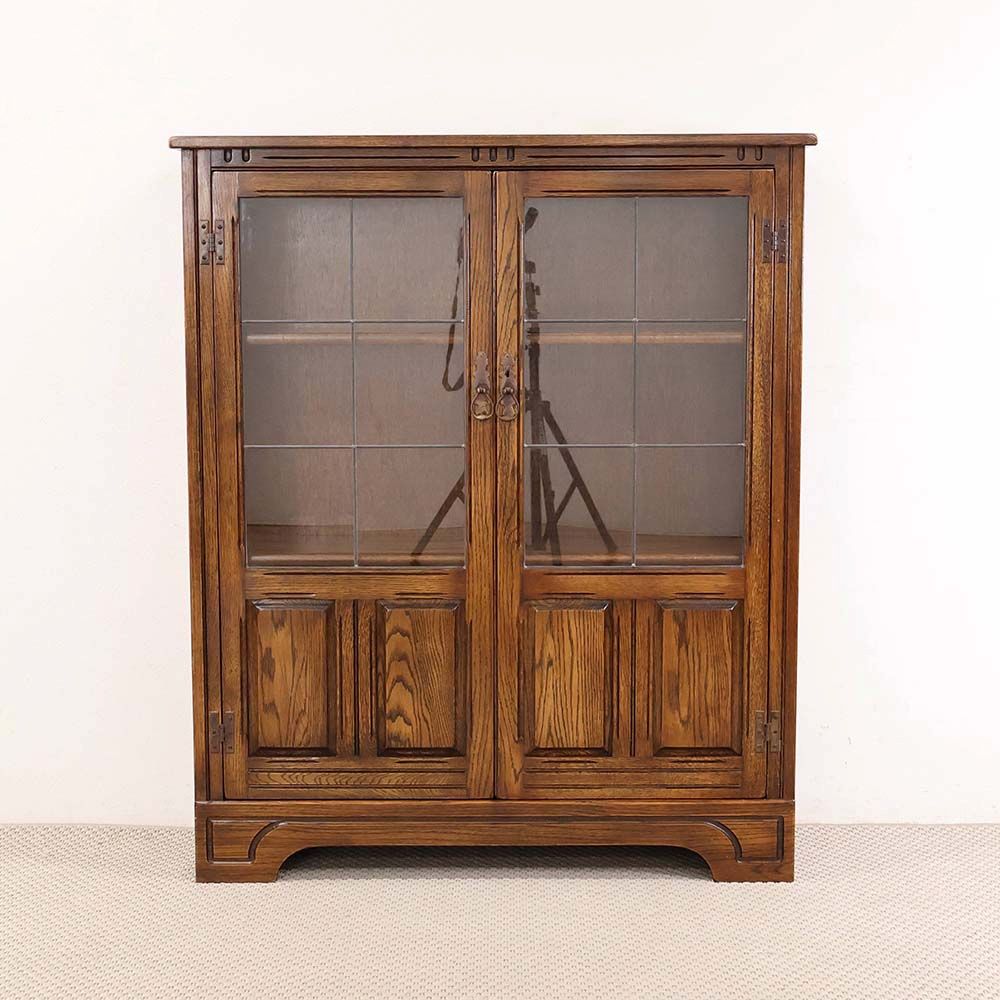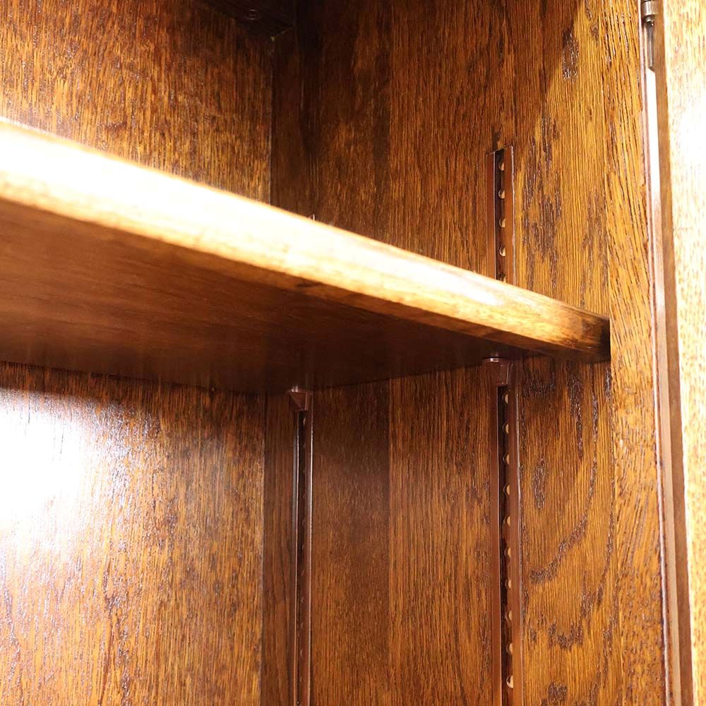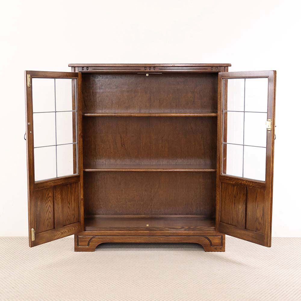 ブックケースの扉は上部がステンドグラス、下はオークの板になっているので、生活感のある日用品や光で色あせてしまう繊細なものは一番下の棚へ納めることができます。