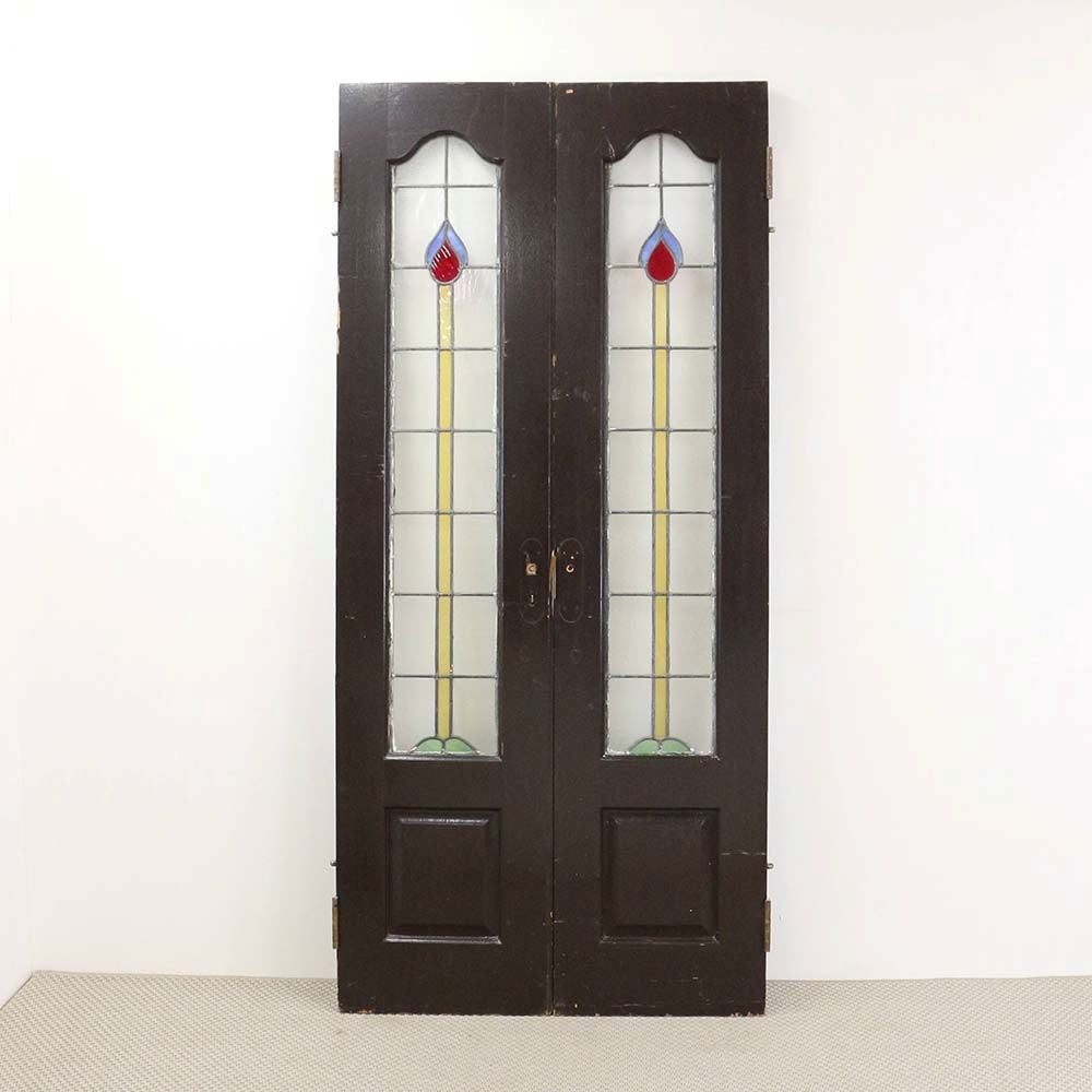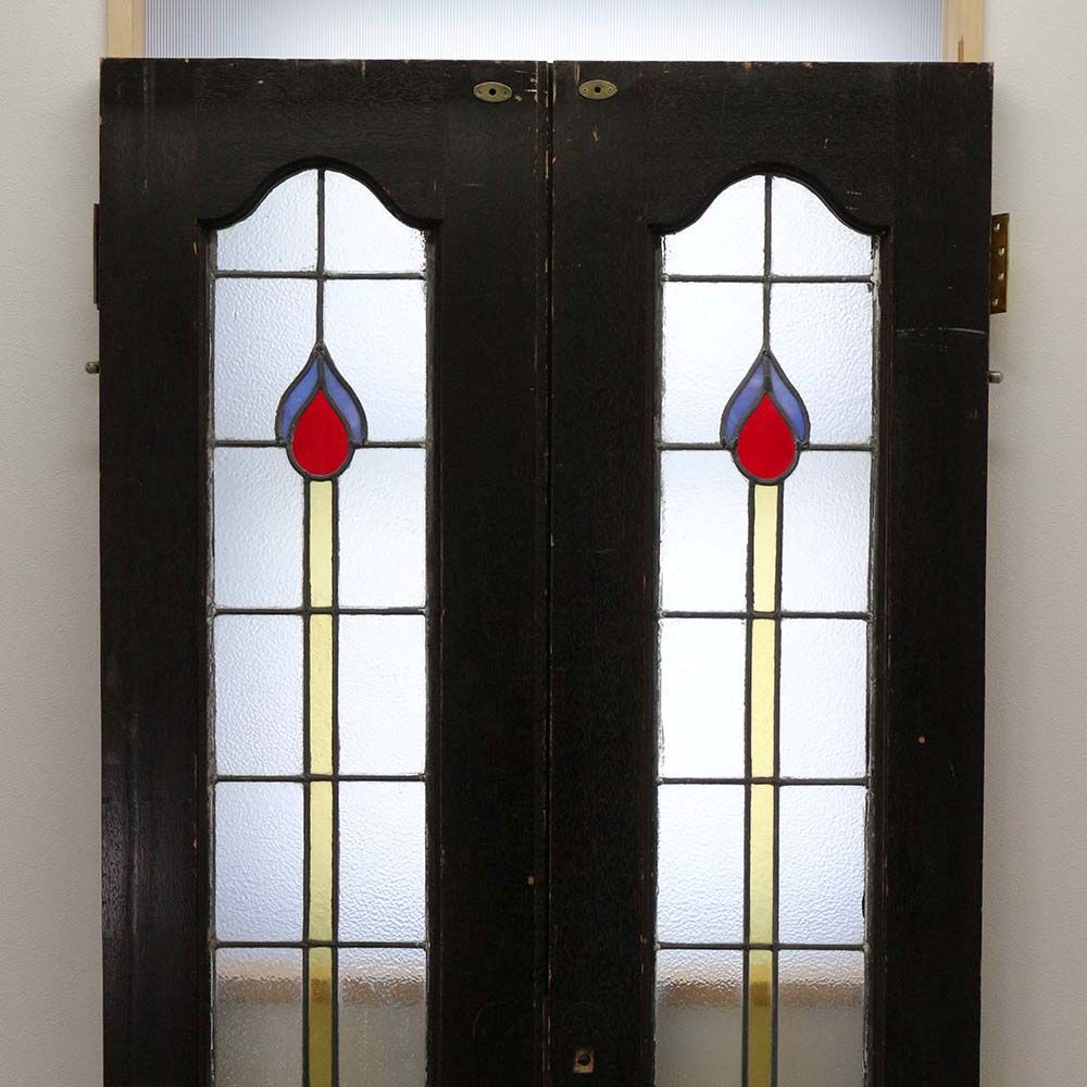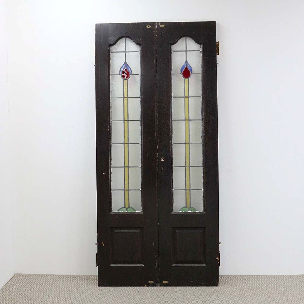 赤いガラスが印象的な英国アンティークステンドグラス入りペアドア VC69-002
