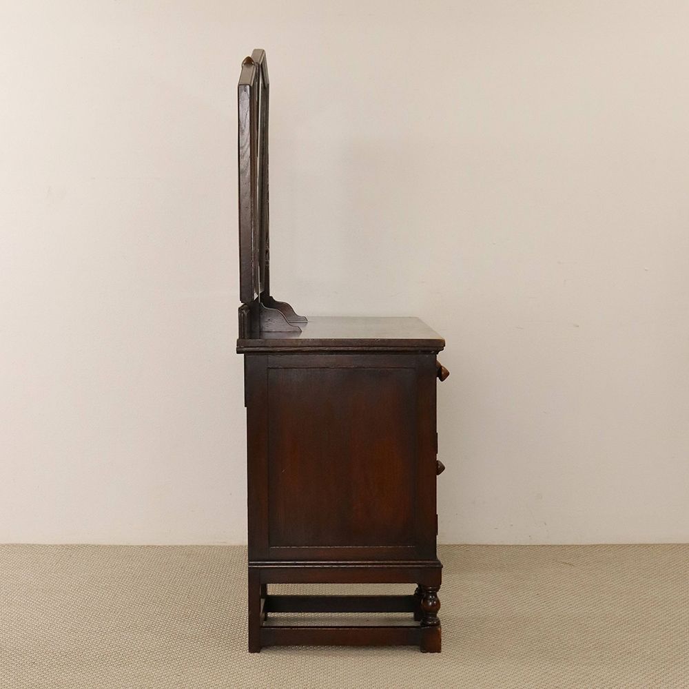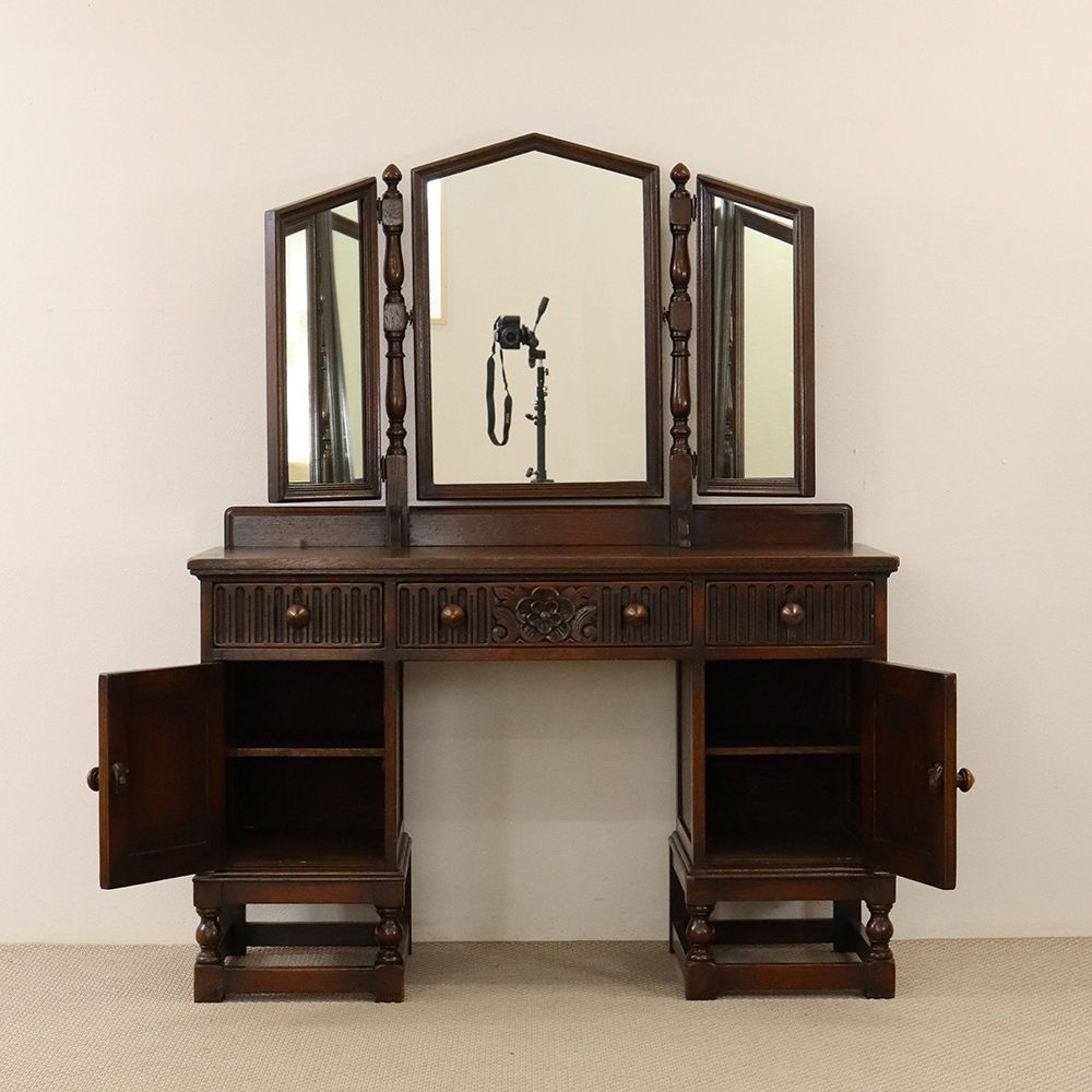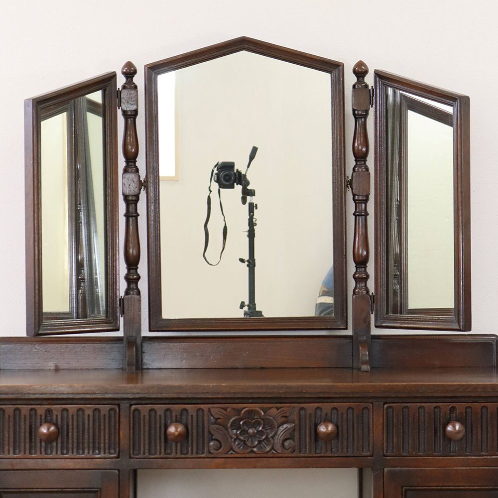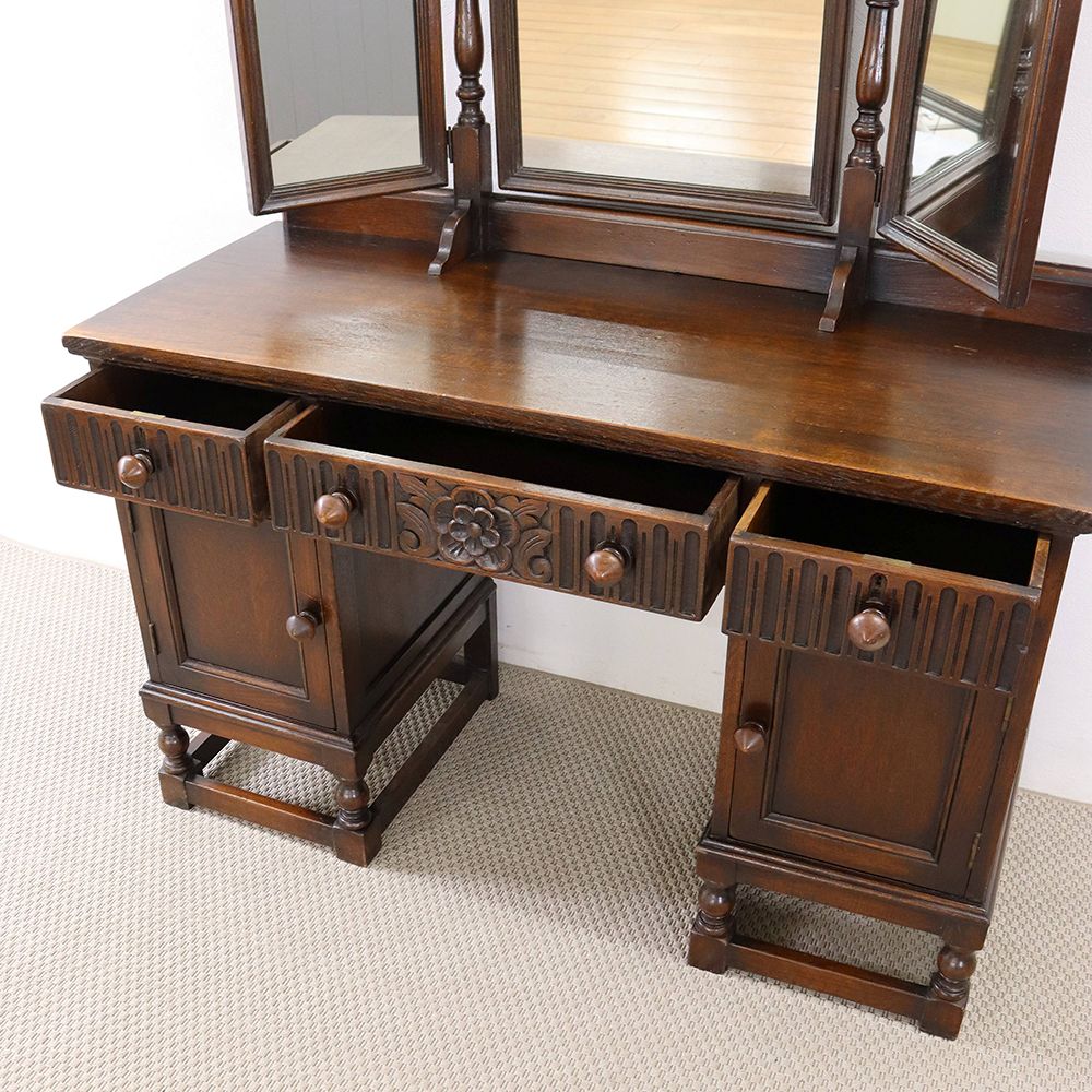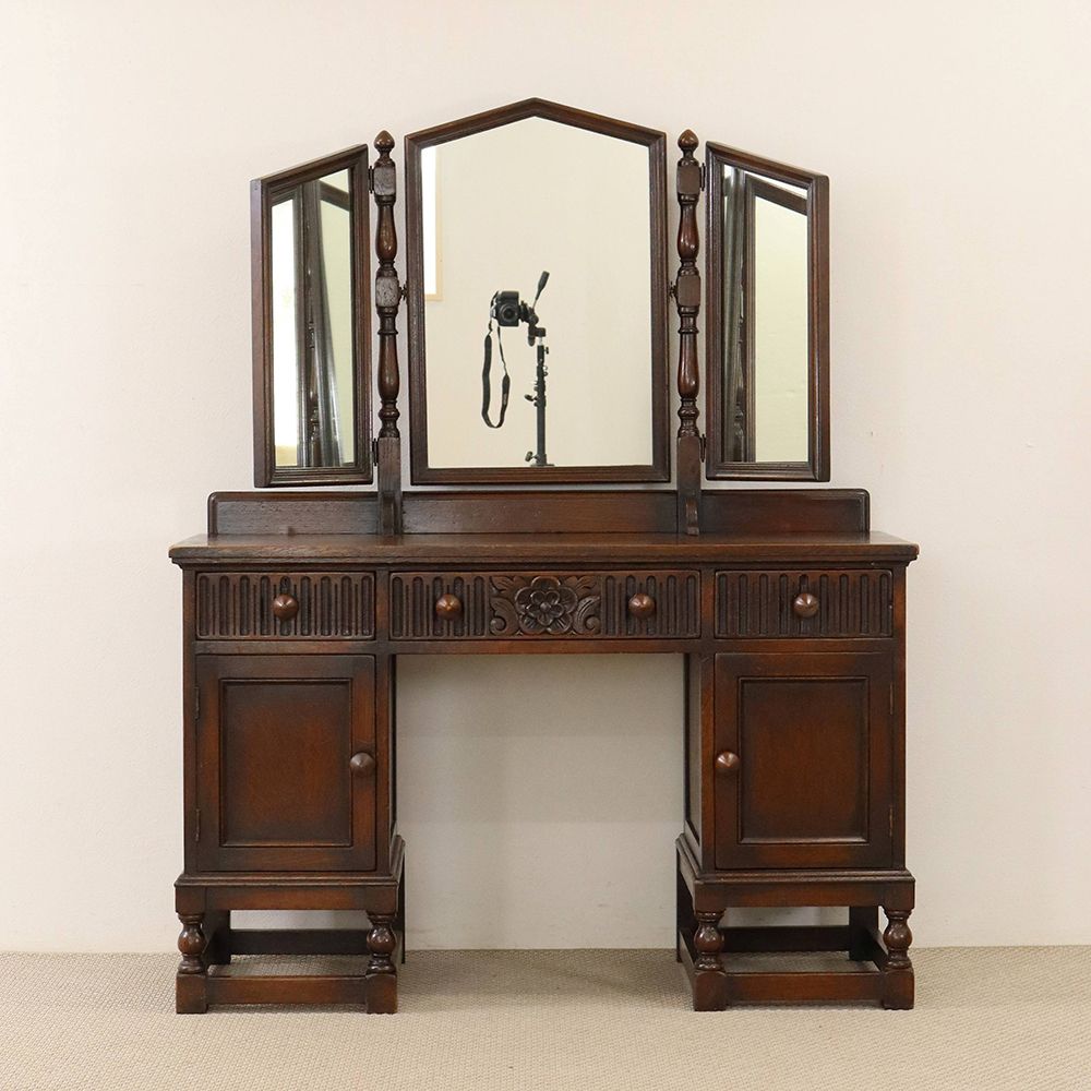 5角形を描く三面鏡には挽物細工の支柱をあしらって、ノスタルジックな佇まいに。引出に彫り込まれた可憐な花が視線を誘う、ロマンチックなドレッシングテーブルです。