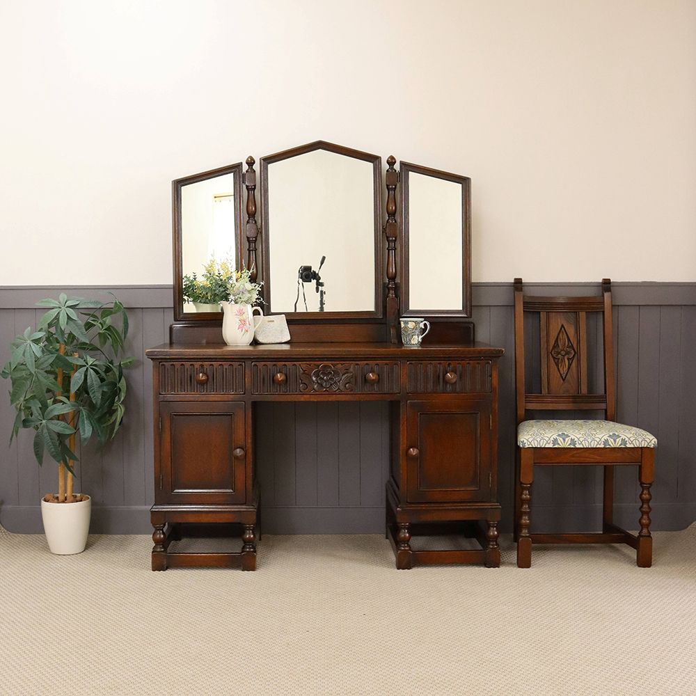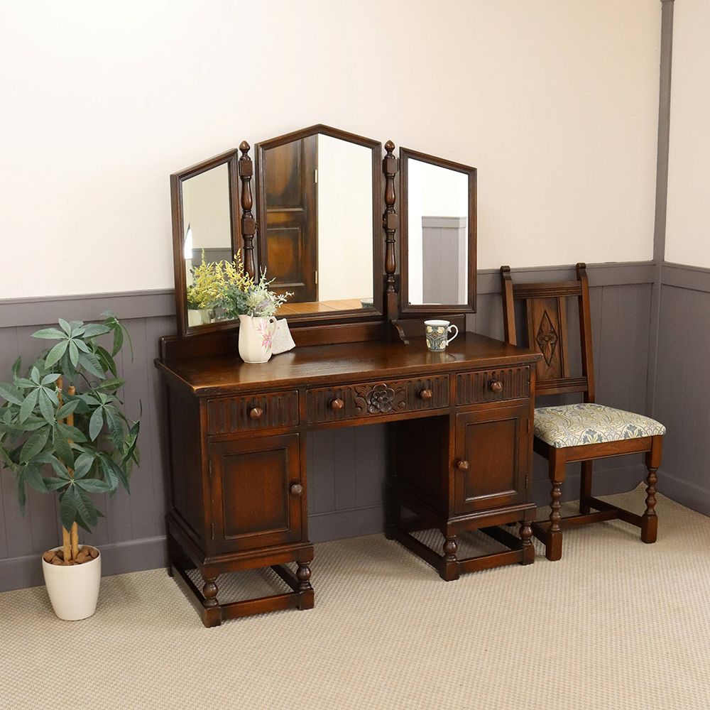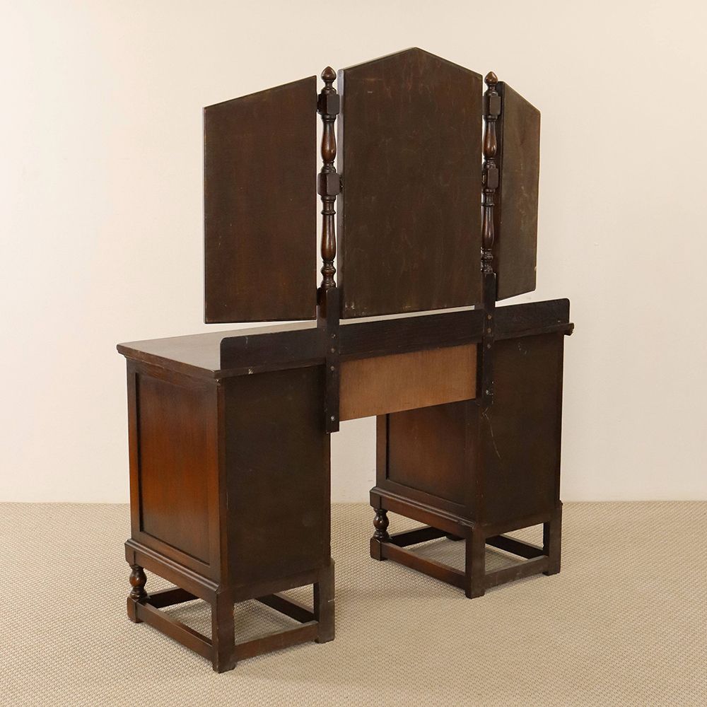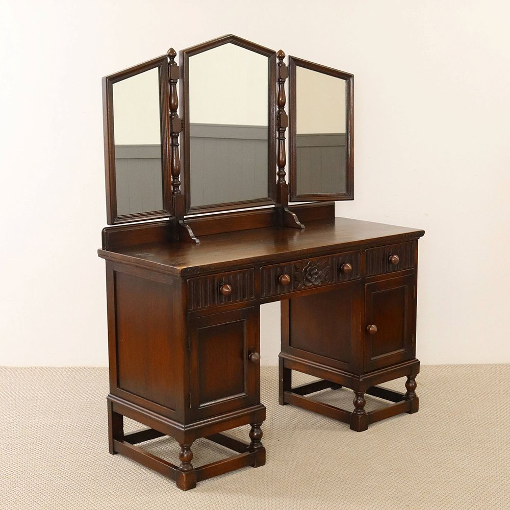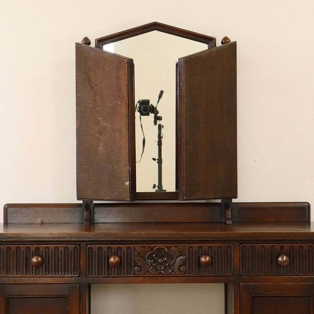 5角形を描く三面鏡には挽物細工の支柱をあしらって、ノスタルジックな佇まいに。引出に彫り込まれた可憐な花が視線を誘う、ロマンチックなドレッシングテーブルです。