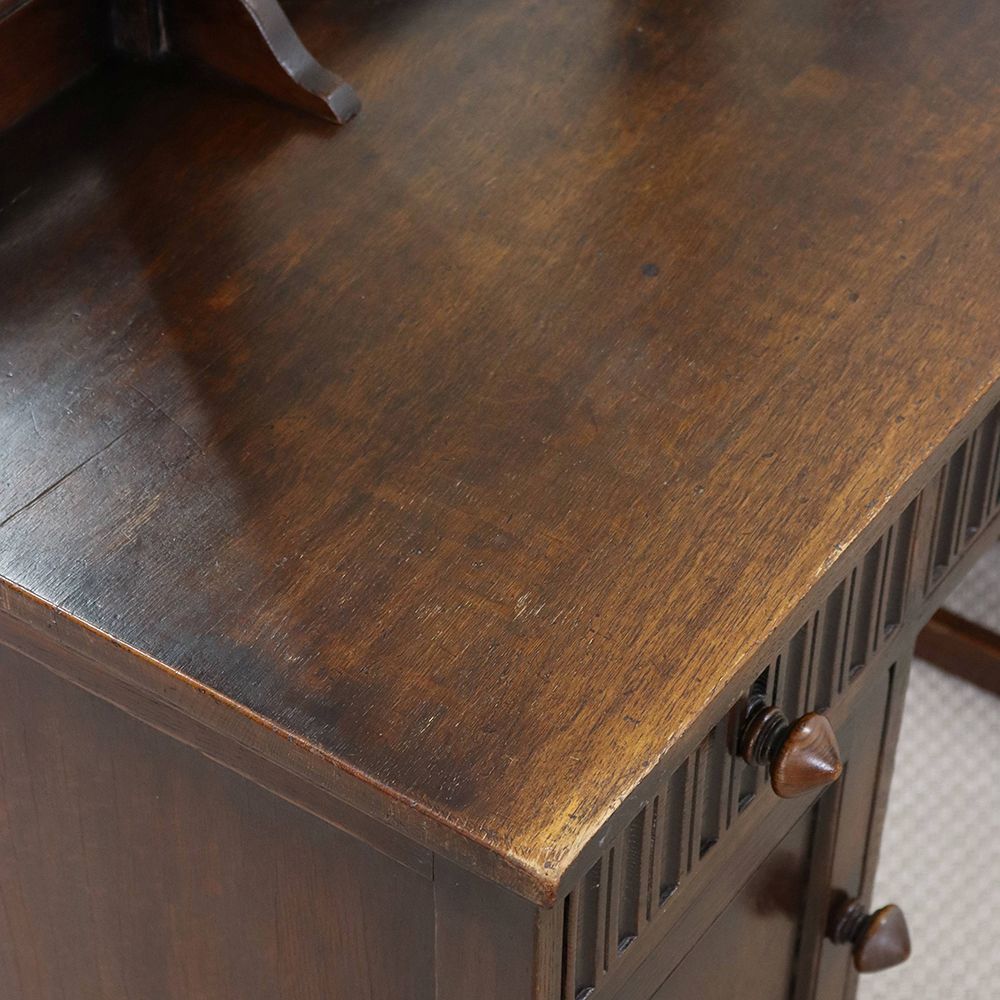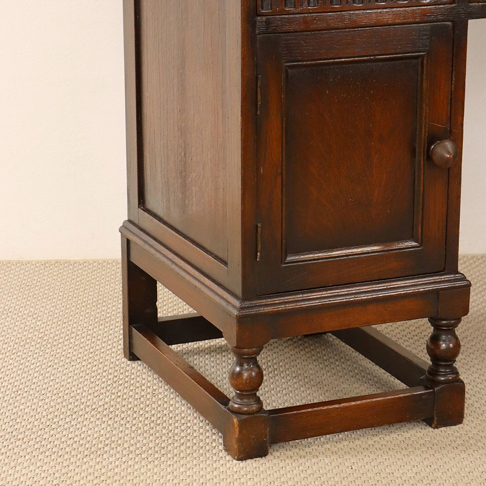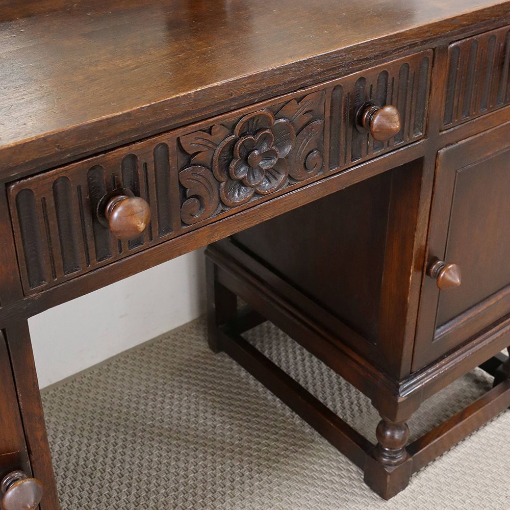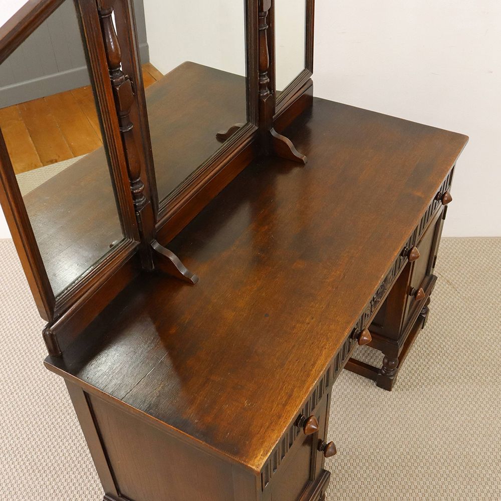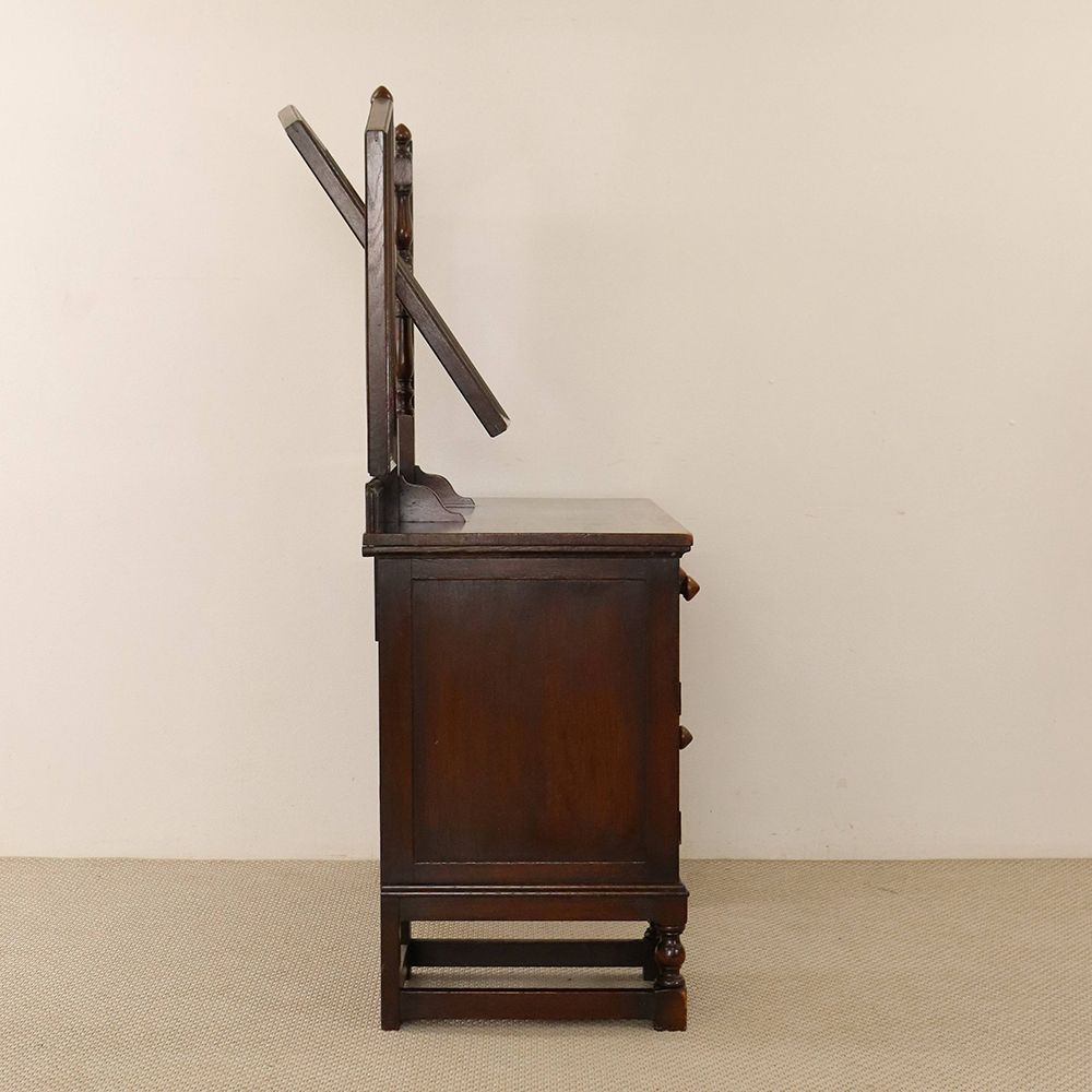 5角形を描く三面鏡には挽物細工の支柱をあしらって、ノスタルジックな佇まいに。引出に彫り込まれた可憐な花が視線を誘う、ロマンチックなドレッシングテーブルです。