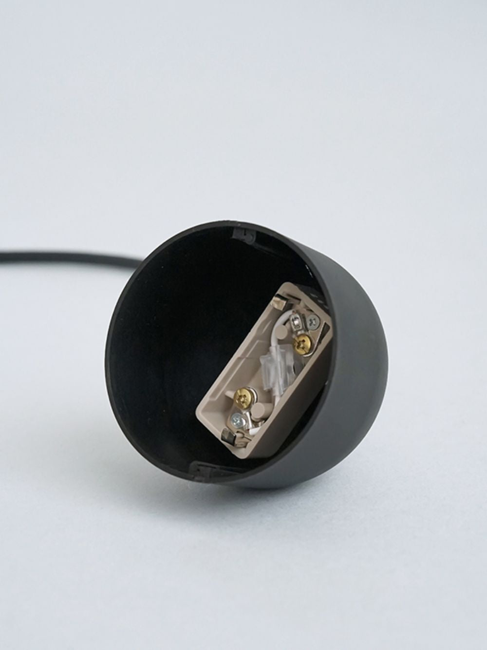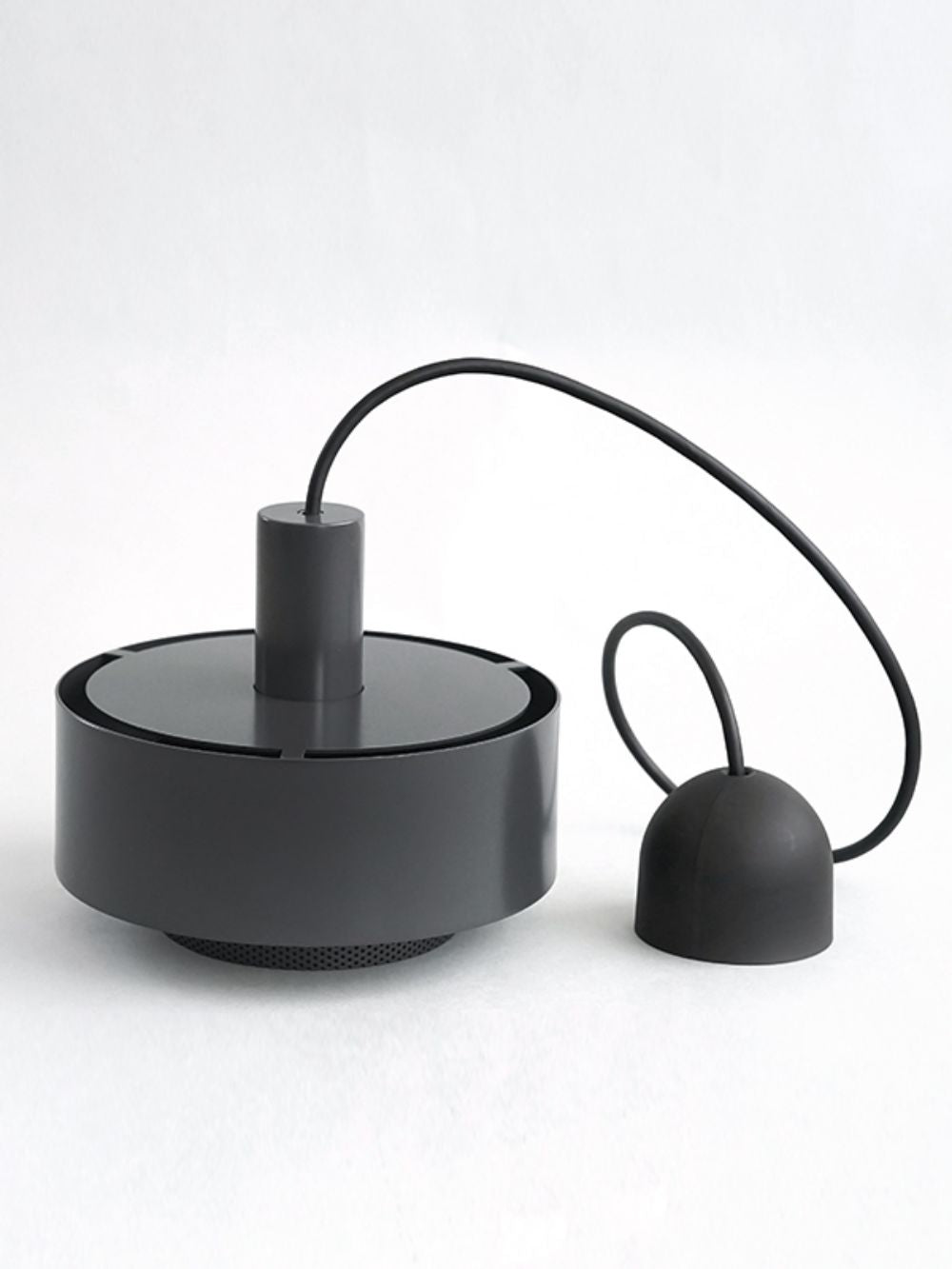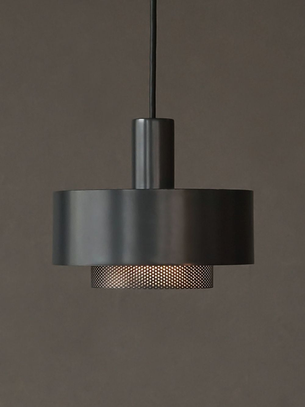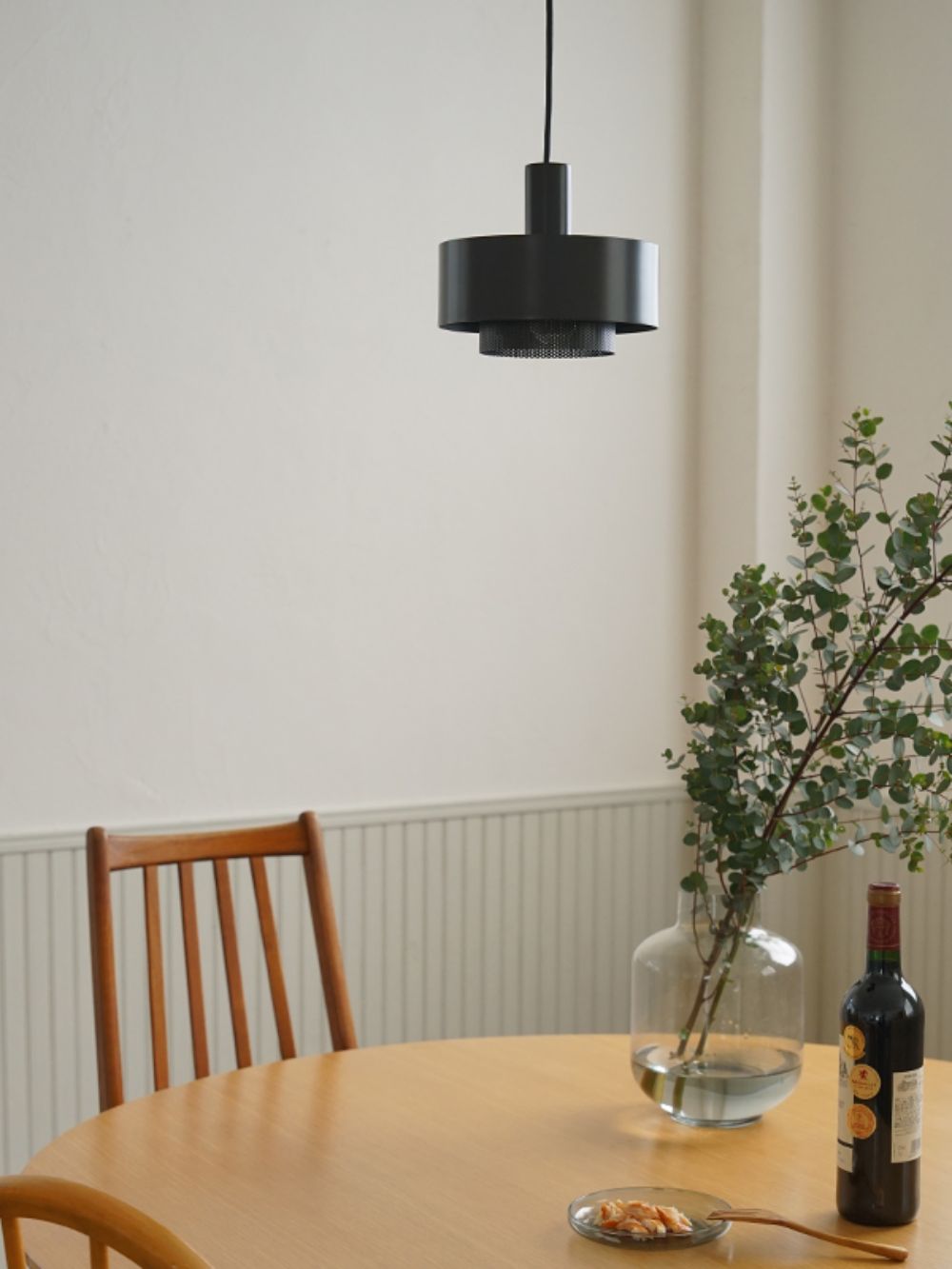 「KT punching light cylinder 60 GRY」は、直径約19cmのミディアムサイズのシェードと、60cmコードを組み合わせたペンダントライト。全体がシックなチャコールグレーカラーで仕上げられていて、インテリアを引き締める役割を果たします。