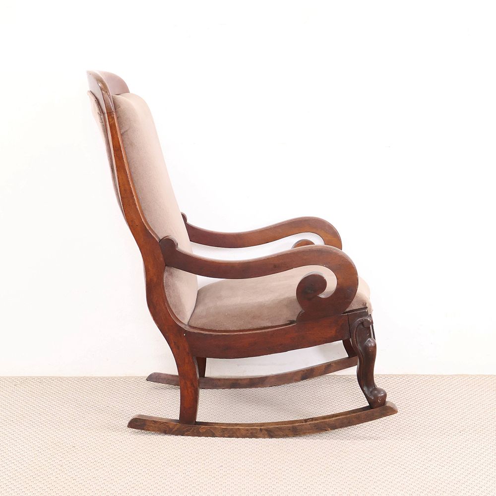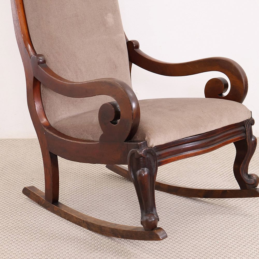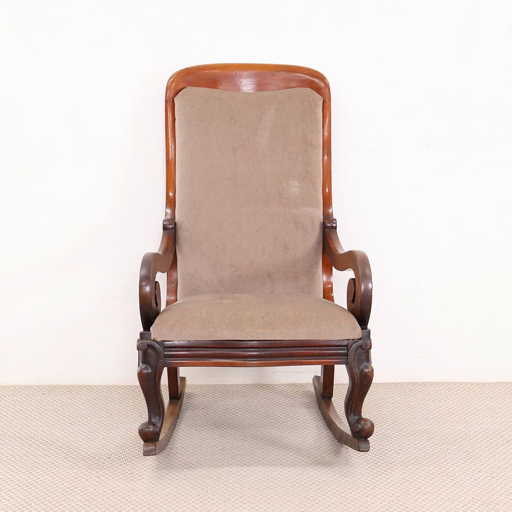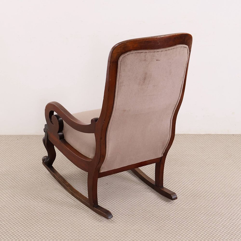 今回入荷したロッキングチェアはクルリと丸くなるアームや脚の装飾がオシャレなアンティーク。