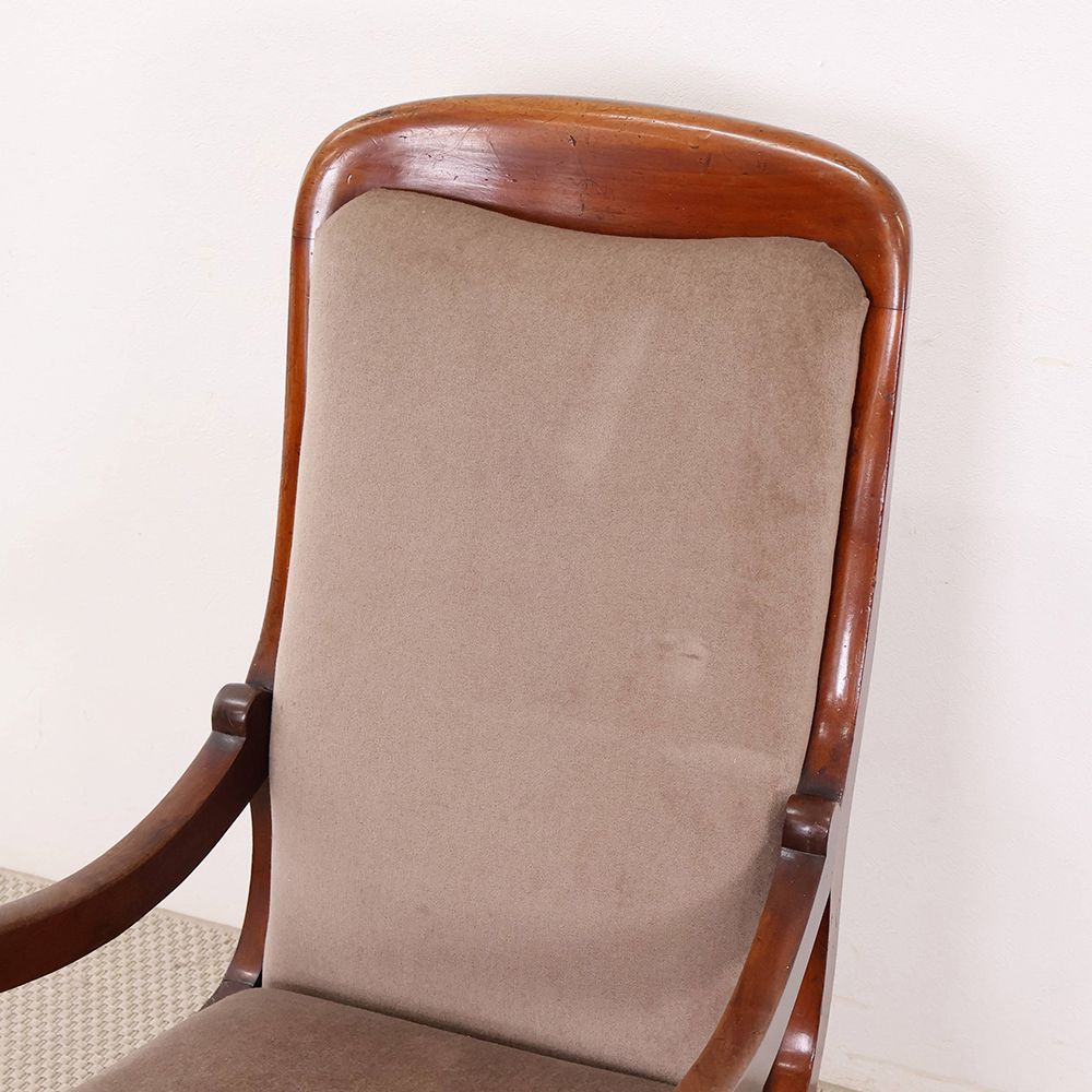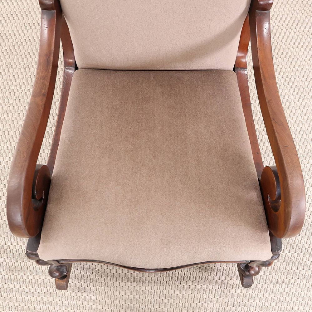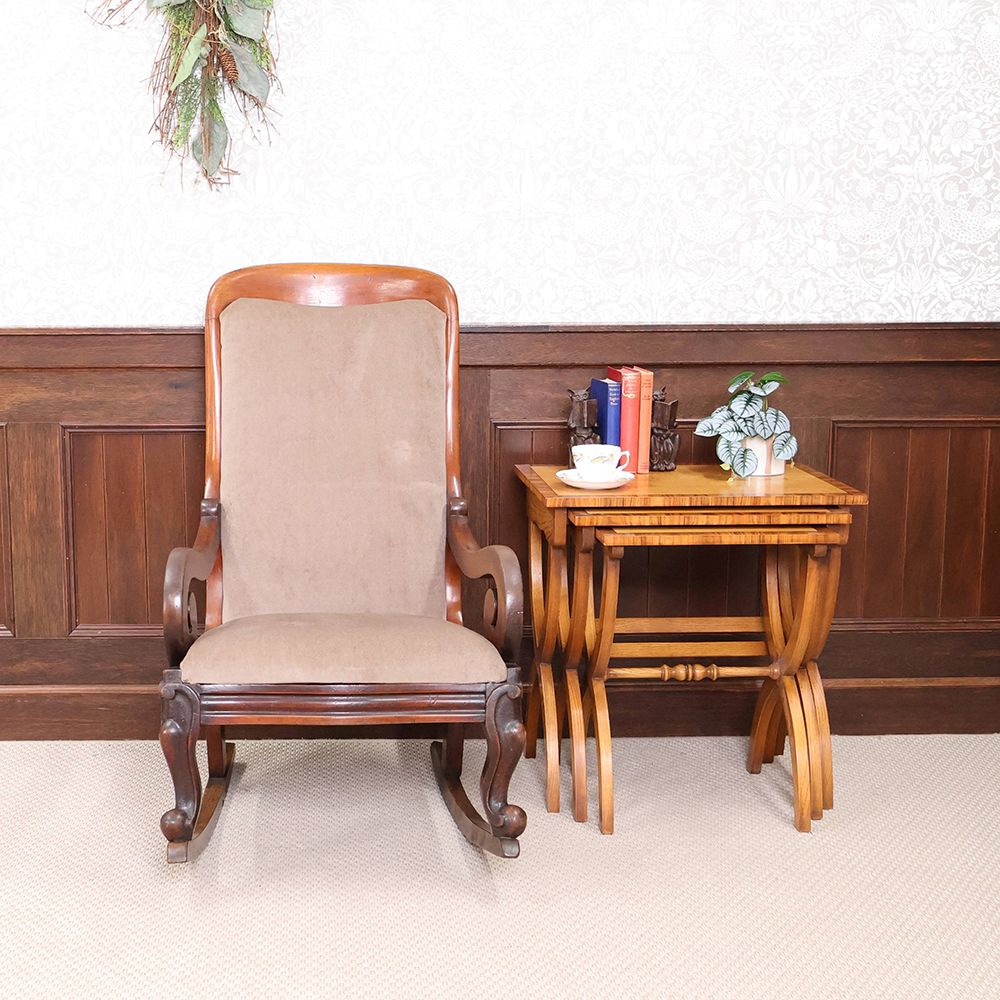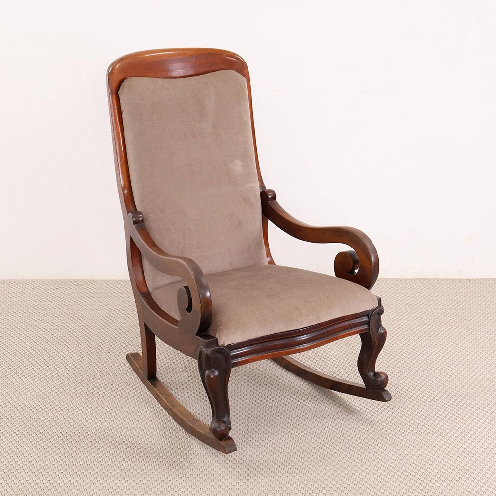 今回入荷したロッキングチェアはクルリと丸くなるアームや脚の装飾がオシャレなアンティーク。