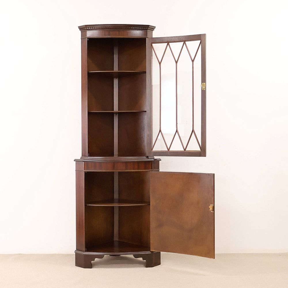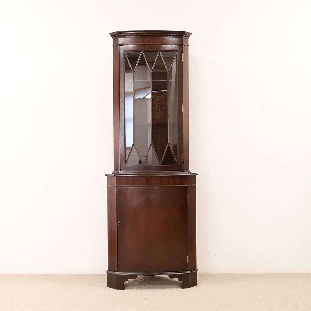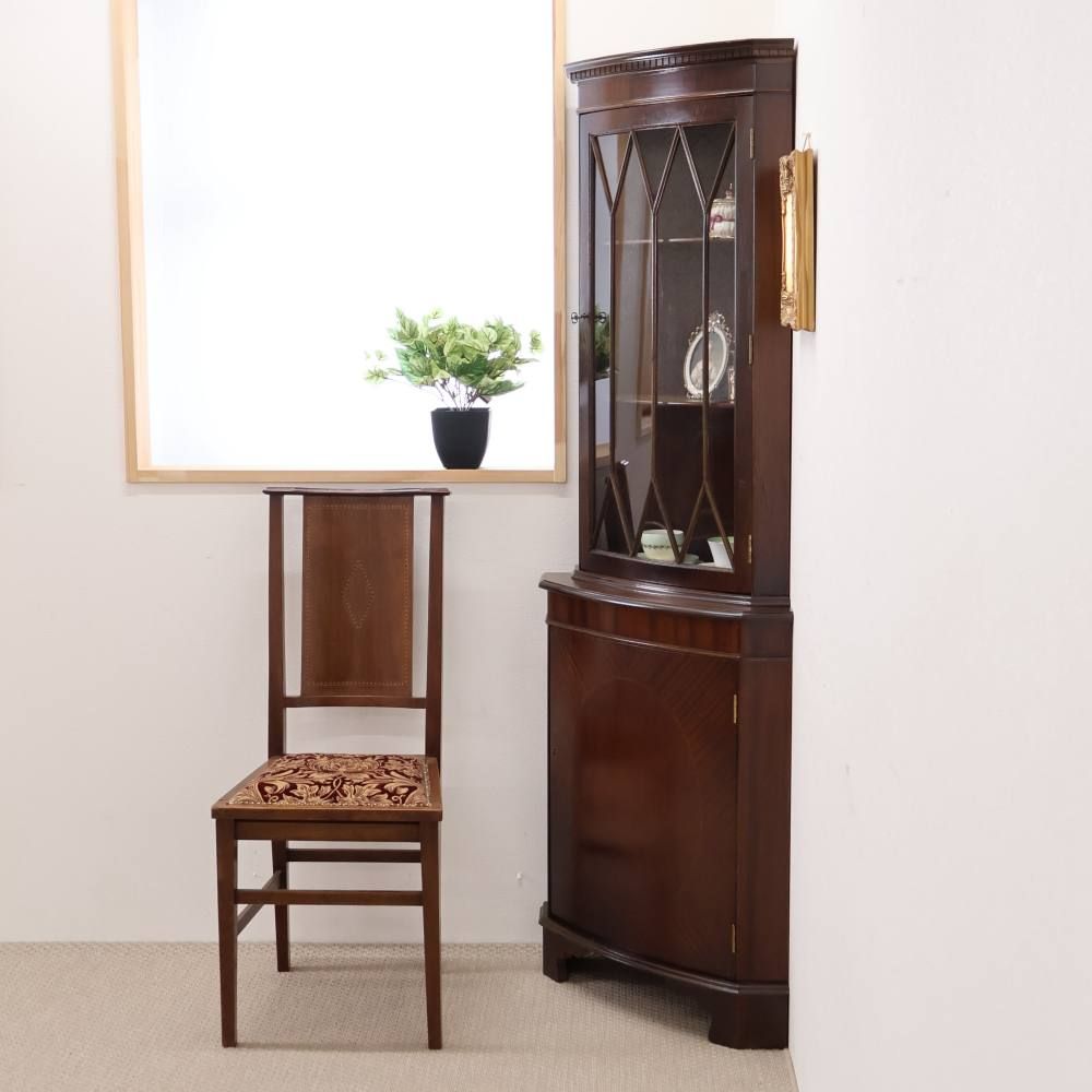 すっと立つシルエットに、繊細な格子模様とマホガニーの杢目が凛と映えるコーナーキャビネット。控えめながらも、上品な華やかさを空間に添えてくれる一台です。