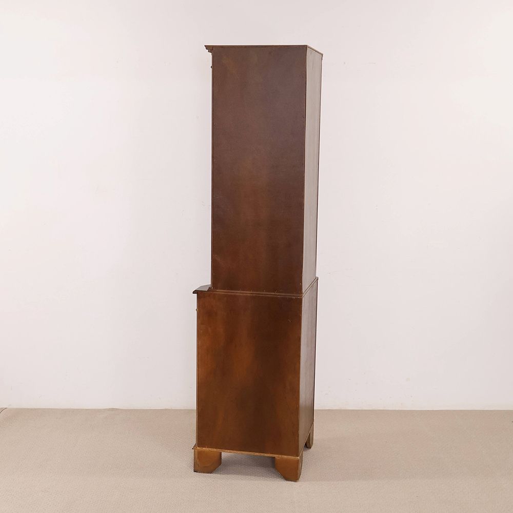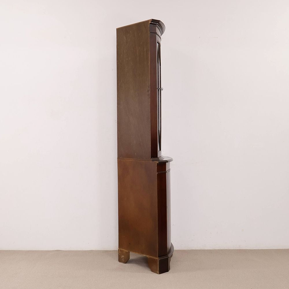 上部のガラス扉には、細長いひし形の格子が施され、差し込む光がやわらかに反射。中に飾った器やオブジェが、まるで静かな舞台のように美しく浮かび上がります。下部扉には、マホガニーの杢目を活かした円形の装飾が施され、落ち着いた中にも、手仕事のぬくもりを感じさせてくれます。