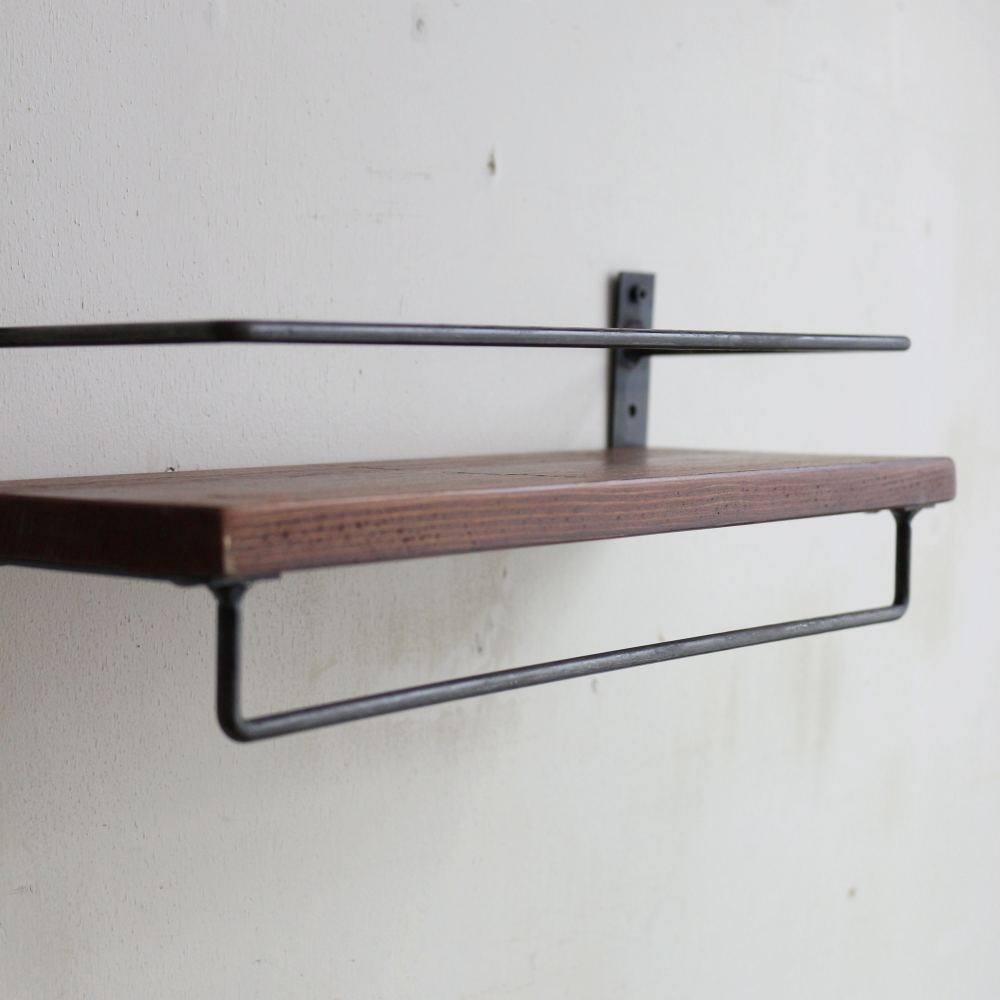 ボトルや雑貨類が置ける棚と、タオルハンガーがついたシンプルなウォールシェルフ。