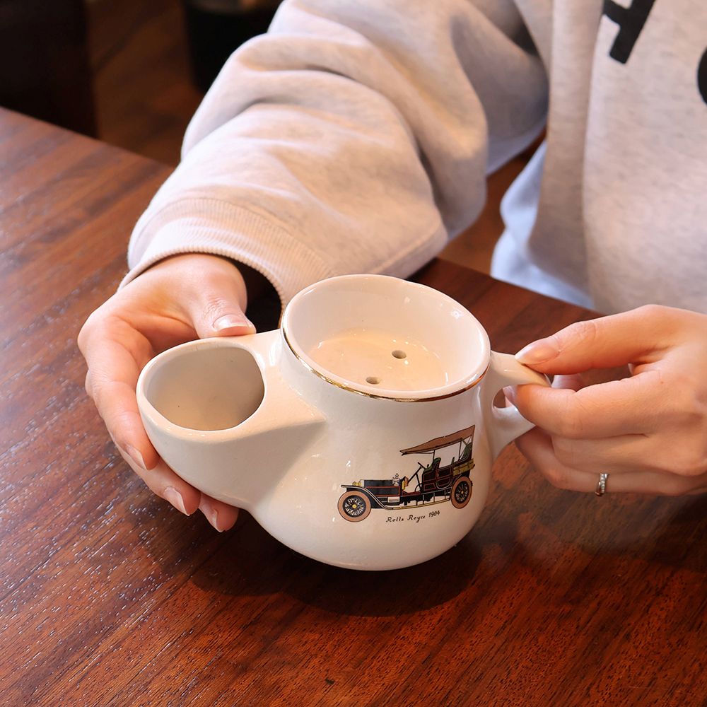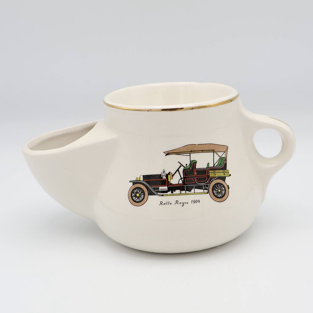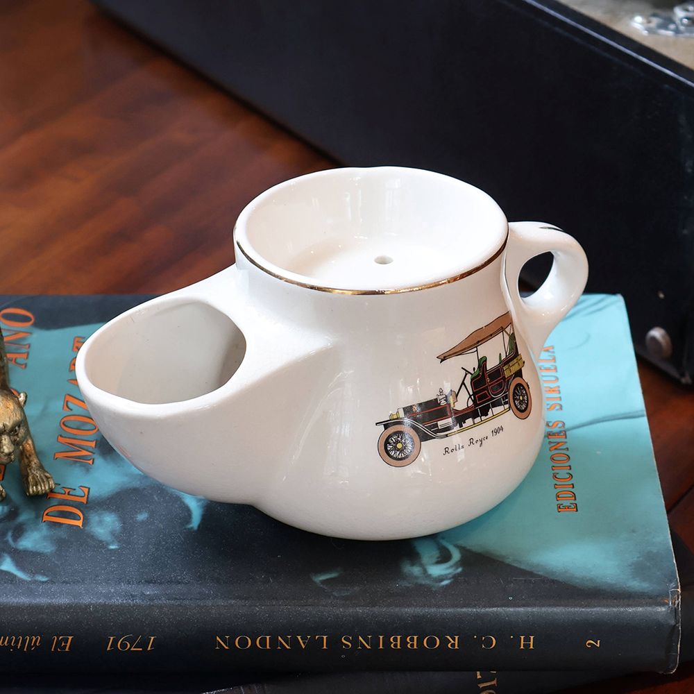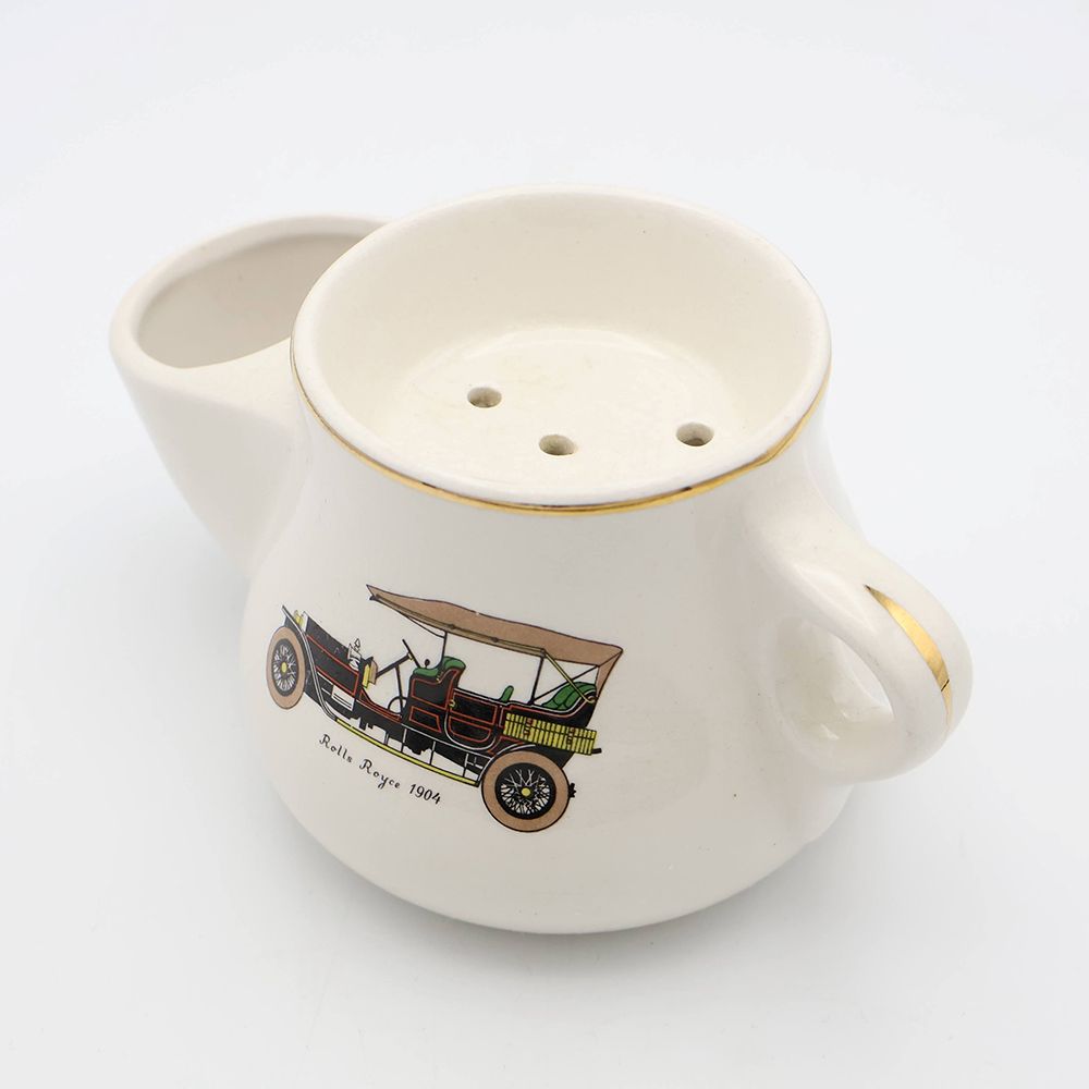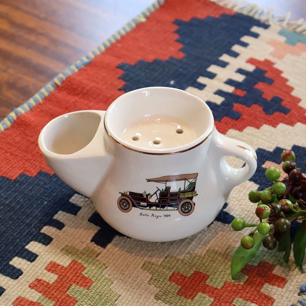 顔の手入れをする時間の傍らに置かれたシェービングマグは、様々な形のものを見かけますが、こちらは丸みのあるポッテリした形。そして白い陶器のボディにはレトロな自動車が描かれてオシャレでしょう?