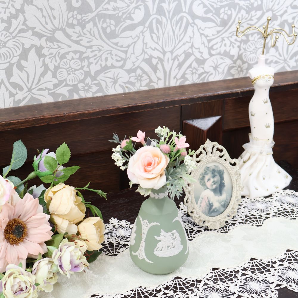 ウェッジウッドのジャスパーベースは、繊細な色に白いレリーフが浮かび上がって、ロマンティックに視線を誘います。