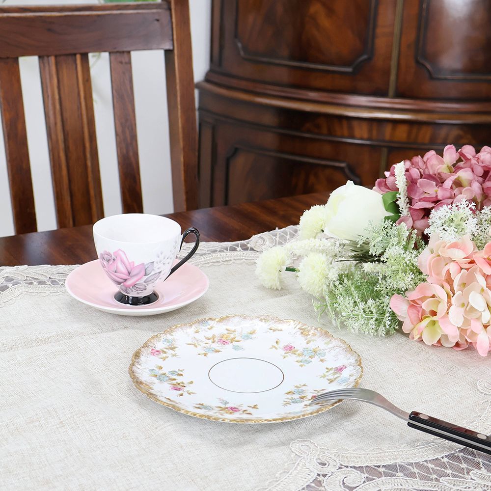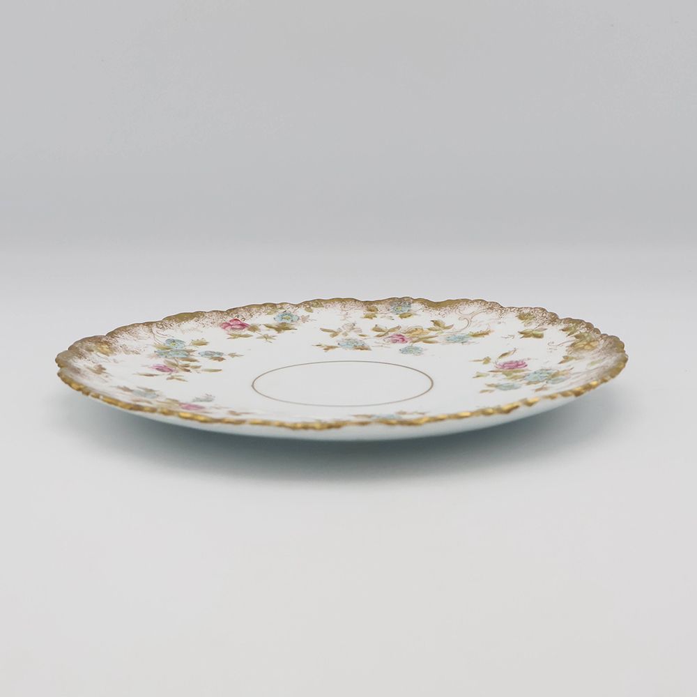 縁はゆるやかに波打つスカラップ。そこに施された金の縁取りが、光をやさしく受けて、テーブルを華やかに彩ります。