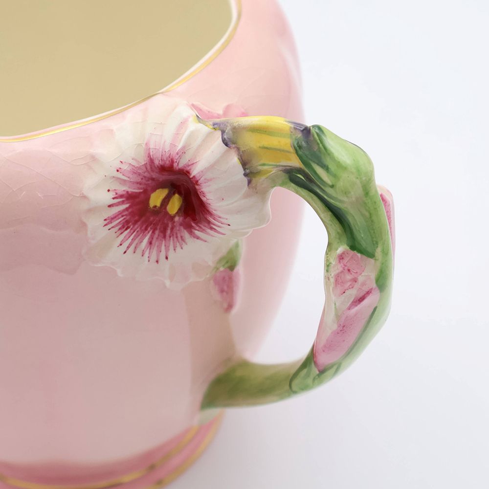 画像のバックスタンプに見られる「Handpainted(ハンドペイント)」の刻印は、このピッチャーが職人の手作業によって丁寧に彩色された証です。また、金色で「PETUNIA(ペチュニア)」と記されているとおり、ペチュニアの花をモチーフにしたシリーズであることがわかります。