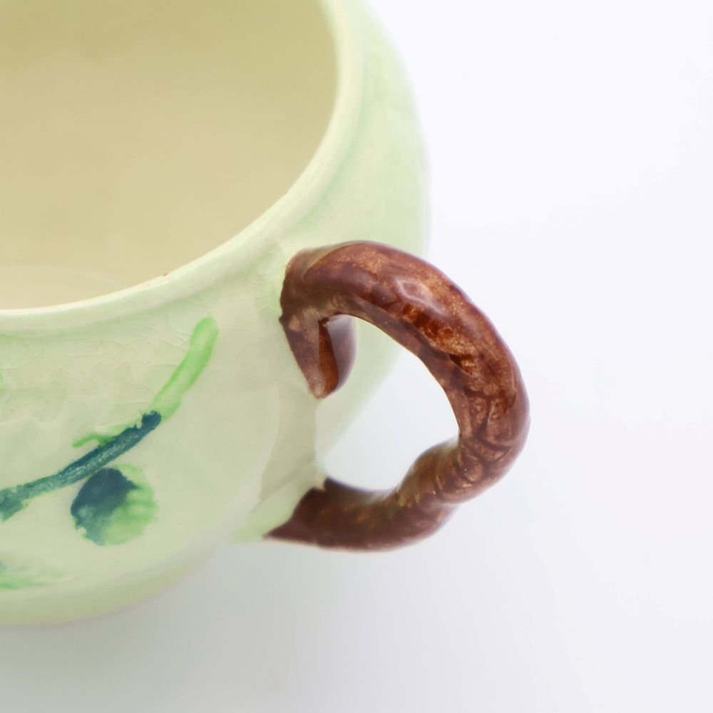 花や葉のモチーフはまるで陶器に咲いた本物の草花のように瑞々しく、眺めるたびに心がほころぶような愛らしさ。持ち手は木の枝を思わせる茶色でデザインされており、グリーンと花々の色彩とのコントラストが、まるで小さな森の中の一場面を切り取ったかのような、やさしい物語を感じさせます。