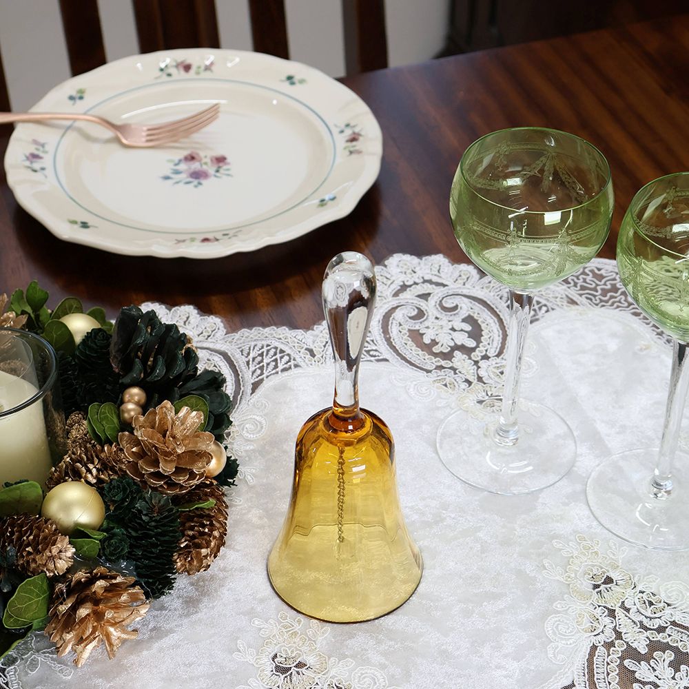 少し物足りなく感じるディスプレイには、透明感のある蜂蜜色のガラスのディナーベルを置いて。