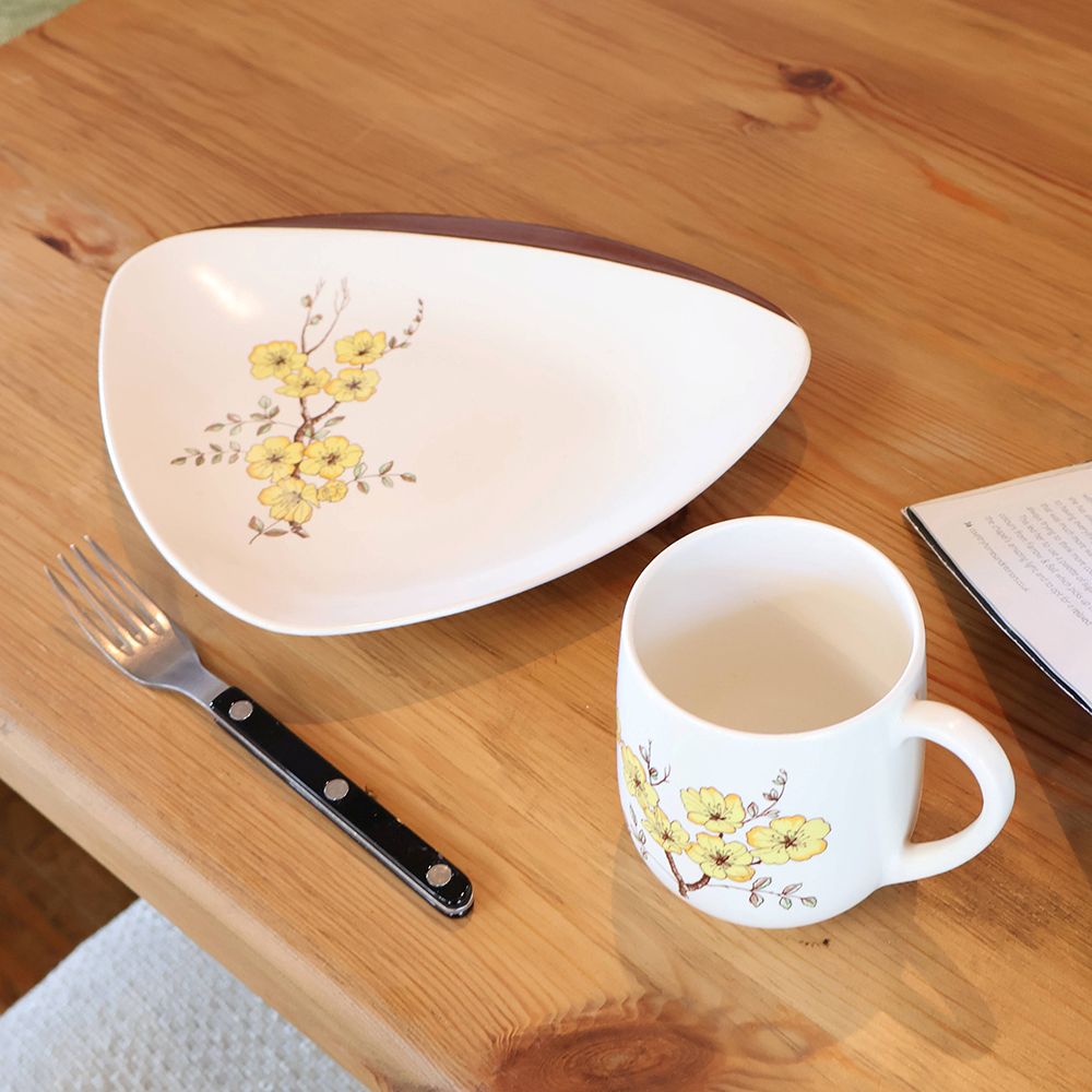 目を引くのは、プレートの中央にあしらわれた黄色の小花たち。ミモザのふんわりとした可憐な花が、細やかな線と優しいグラデーションで丁寧に描かれています。