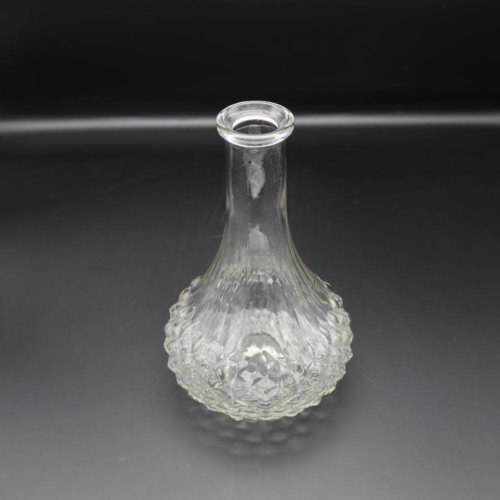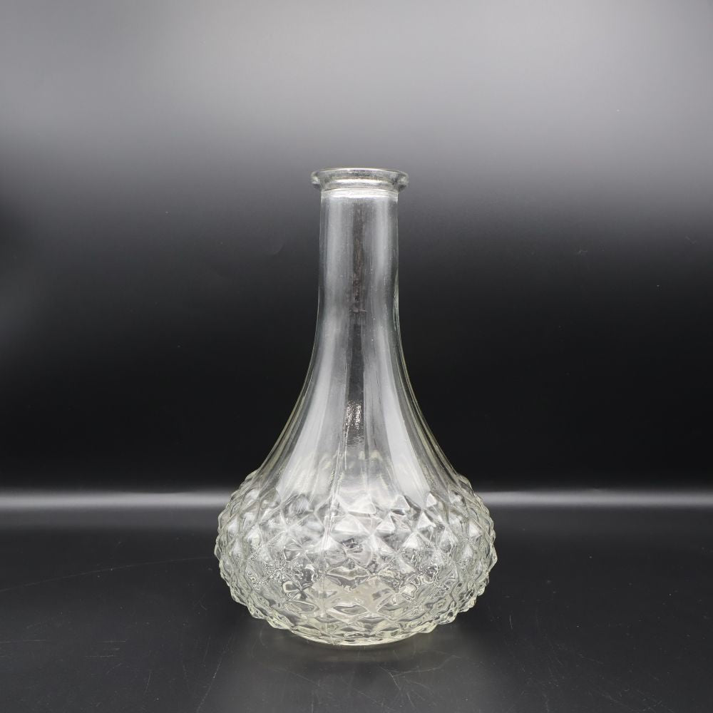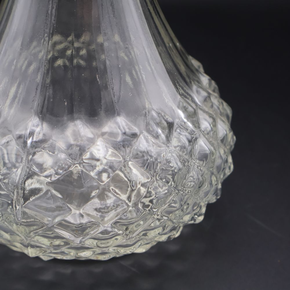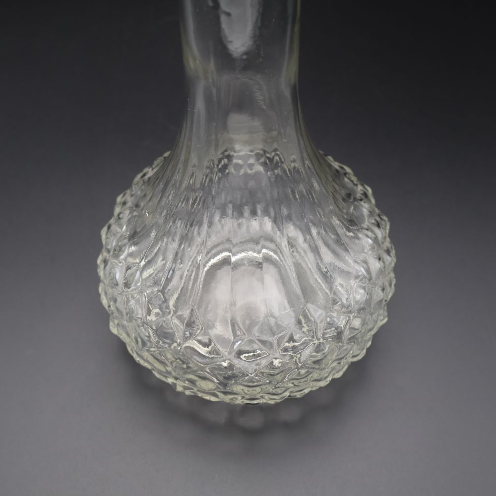 プレスガラスの素朴な厚みに凹凸の装飾をあしらったガラスベースは、カッティングをほどこしたデキャンタのようにキラキラした輝きで目を楽しませてくれます。