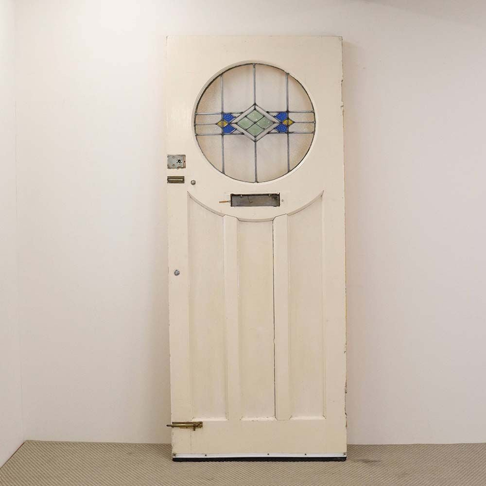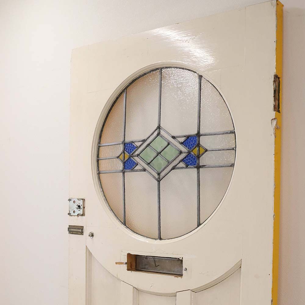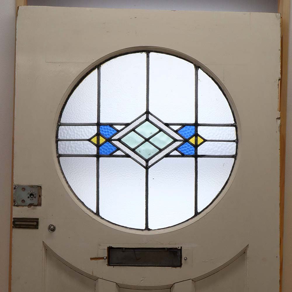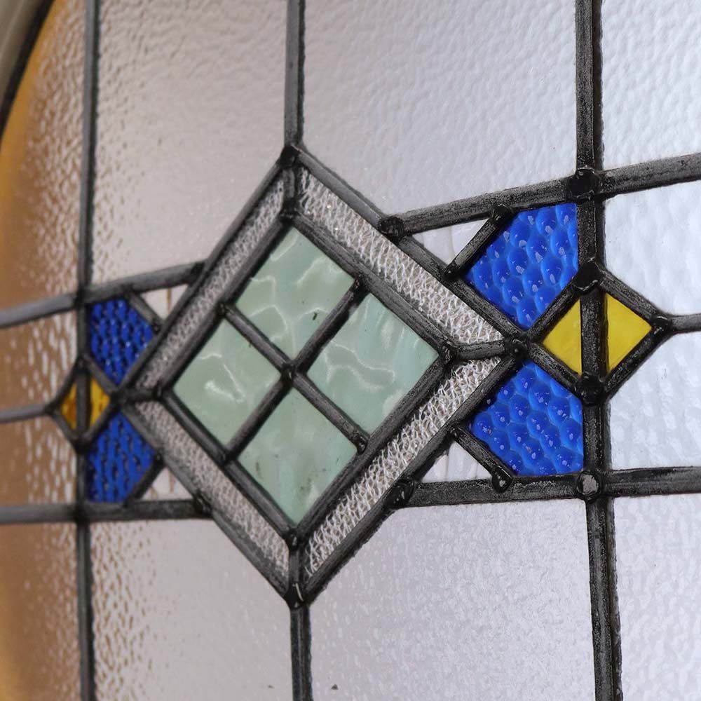 丸い形のアールデコの影響を受けた幾何学模様のステンドグラスは、表面の凹凸など、様々な質感のアンティークガラスが使用されています。