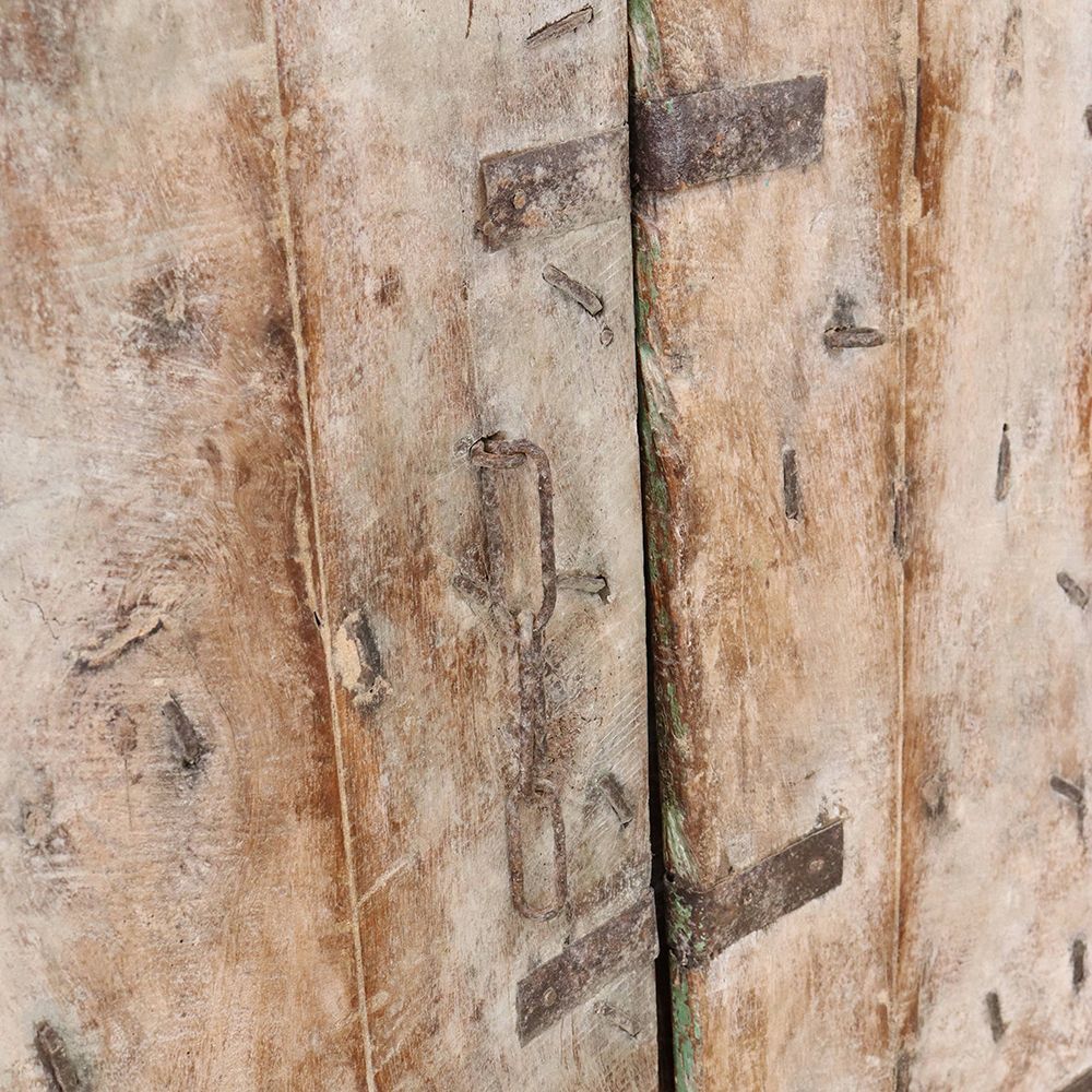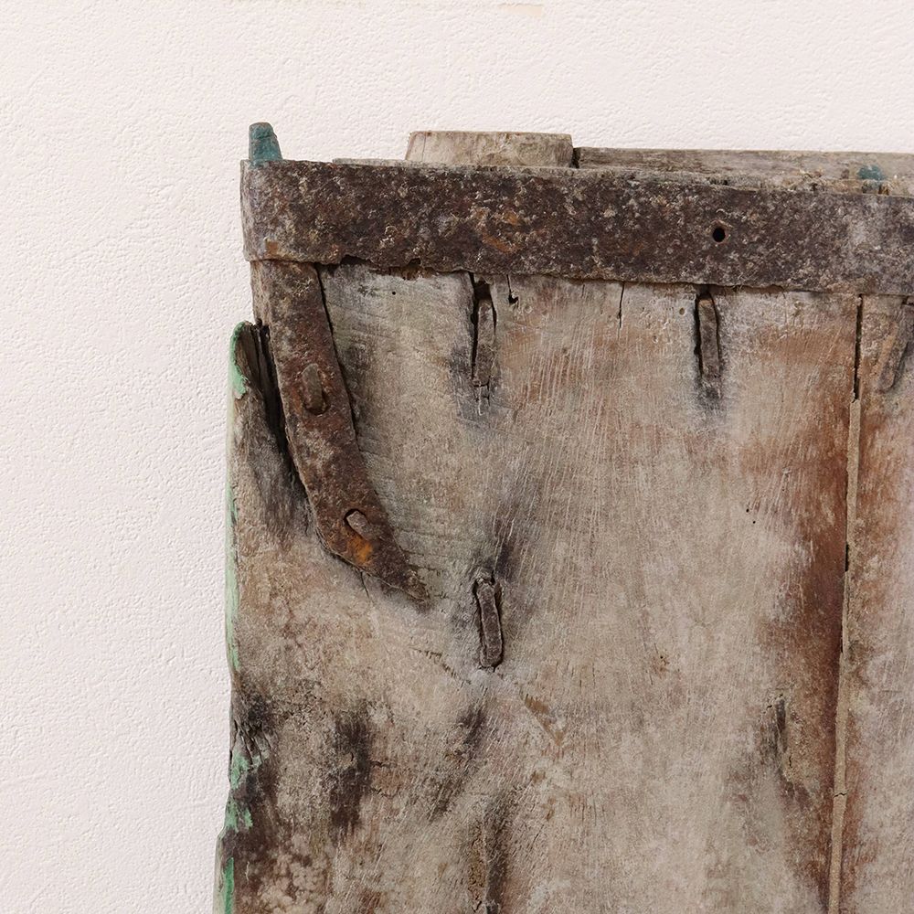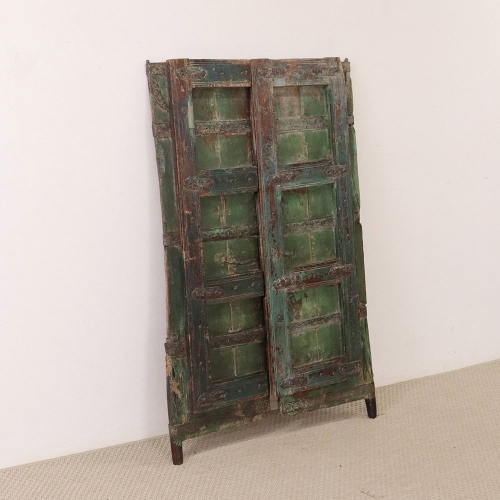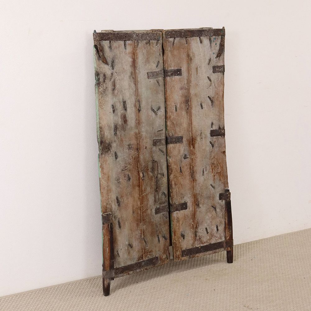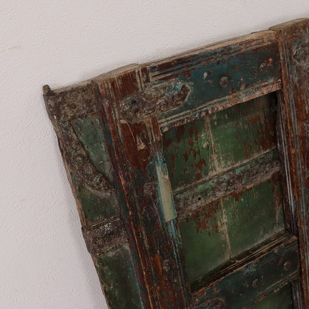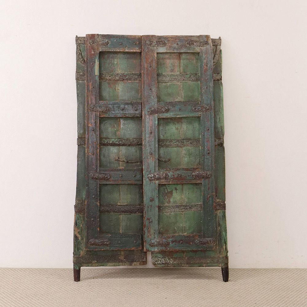 重厚な木材とアイアン金具が組み合わされたアンティークの窓用扉。