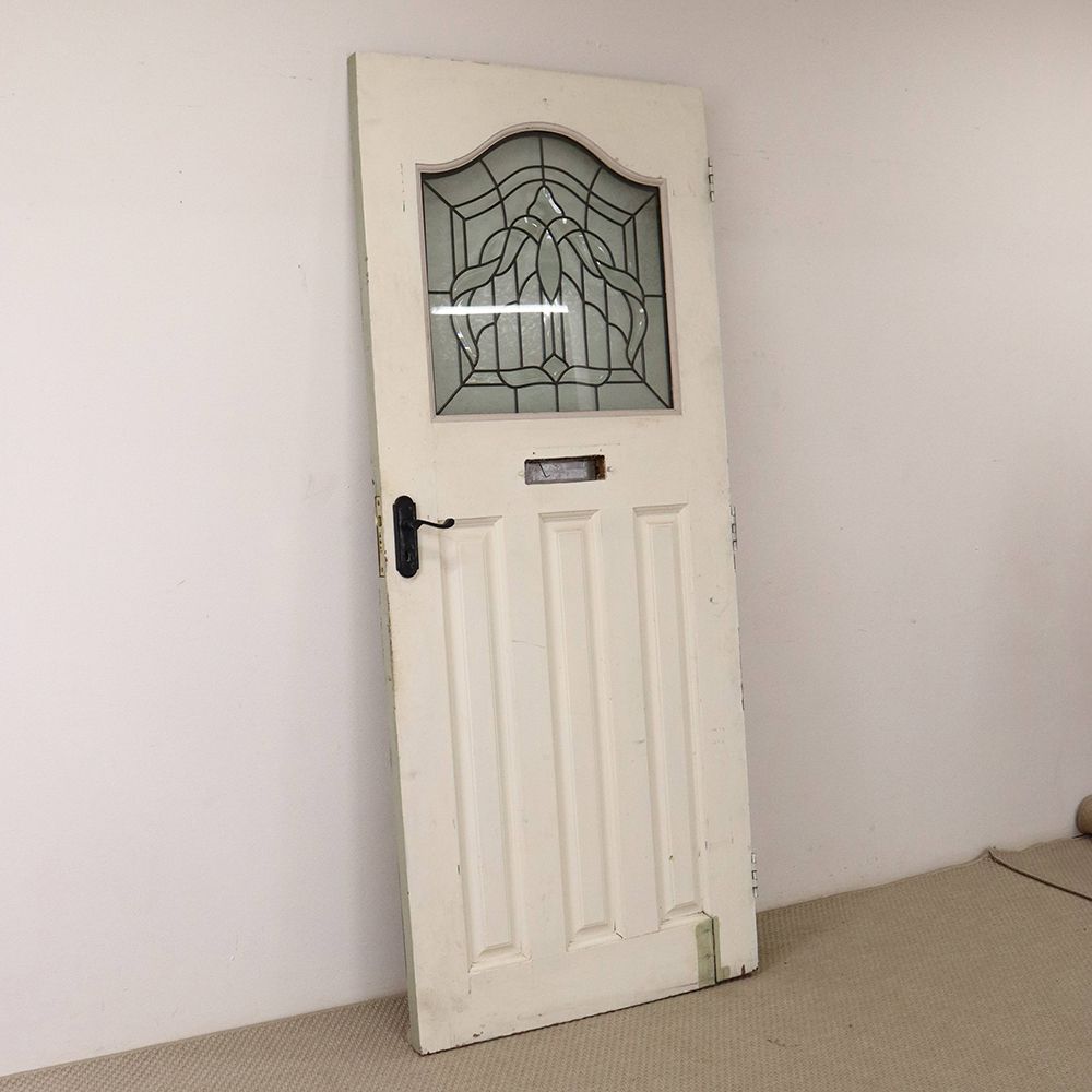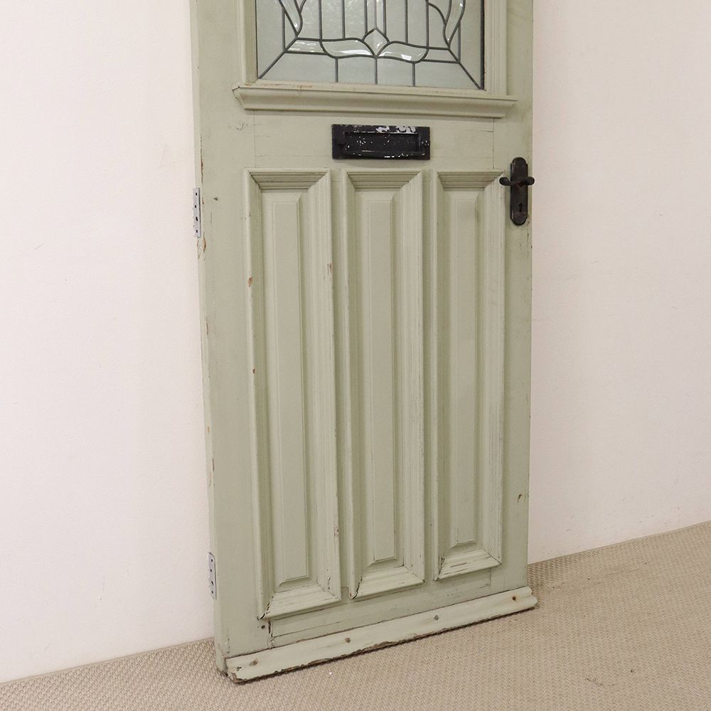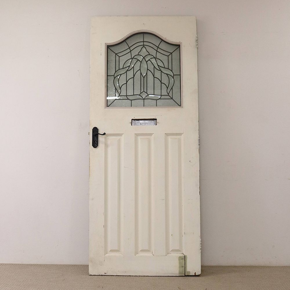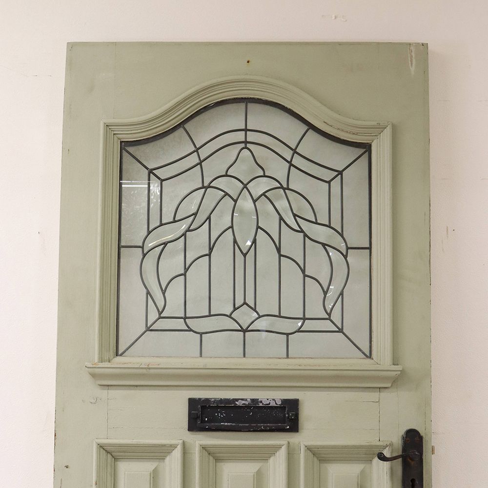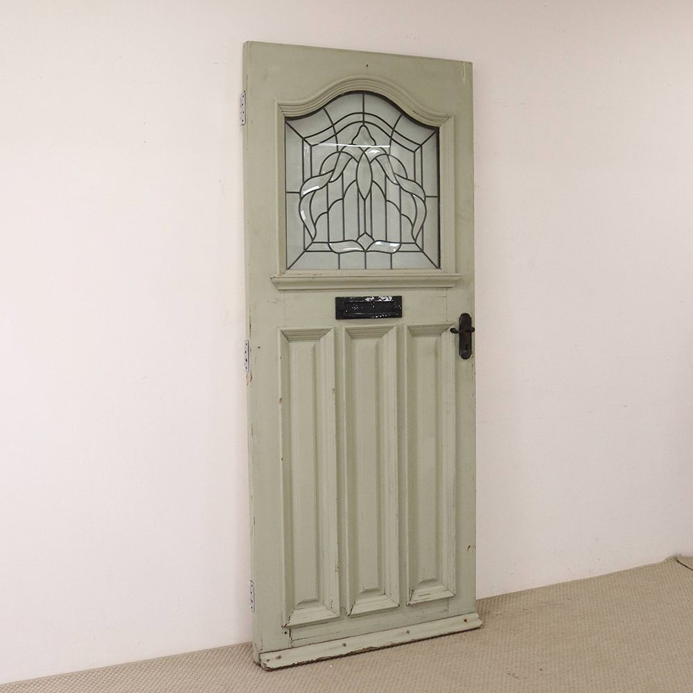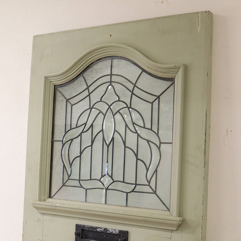無色ガラスを組み合わせたステンドグラスが印象的な、イギリスのアンティークドアです。