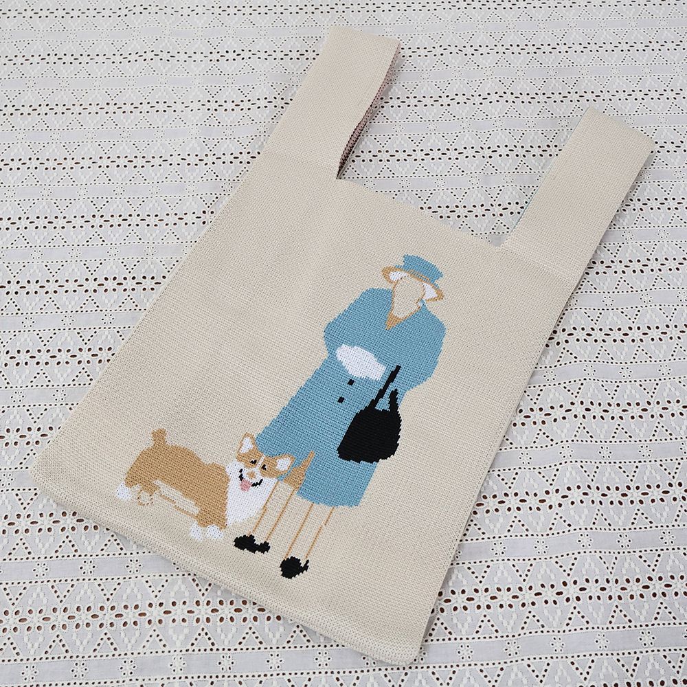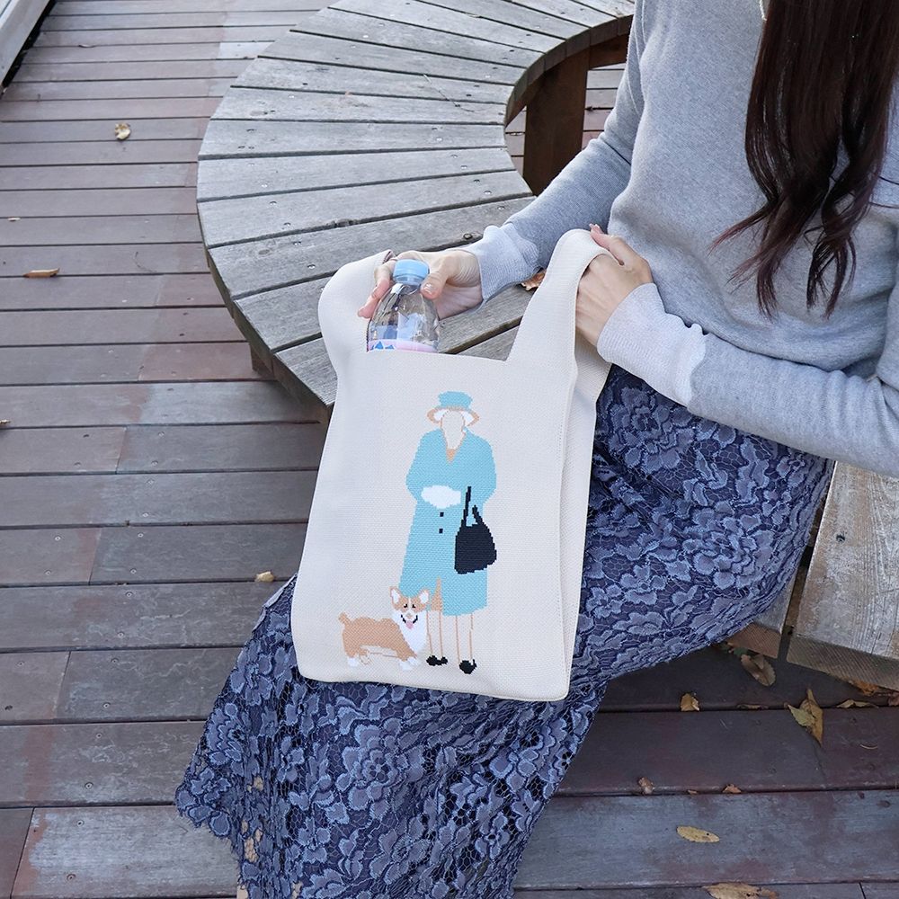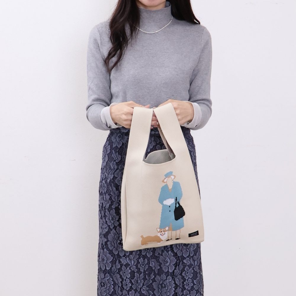 可愛い女王とコーギー柄♪ ニットトートバッグBeige DM1-TOTEK-ORG004