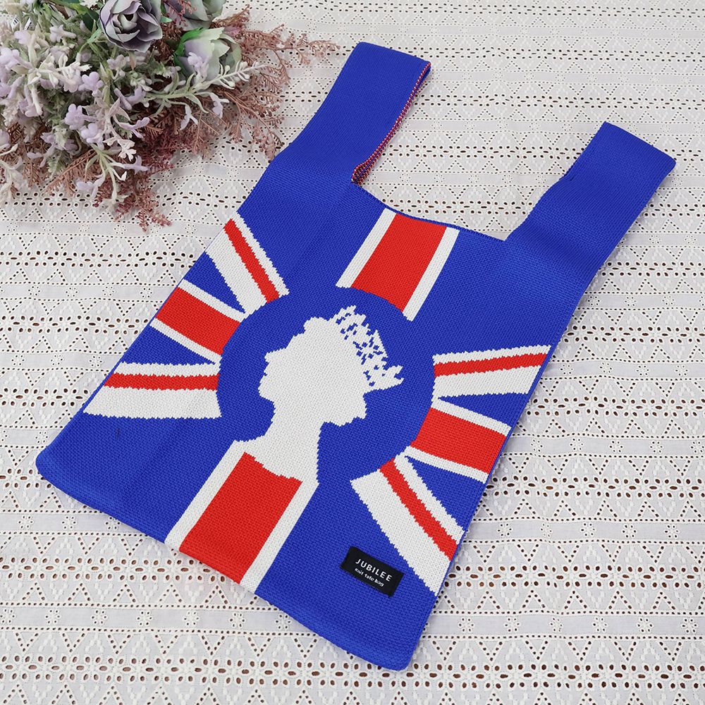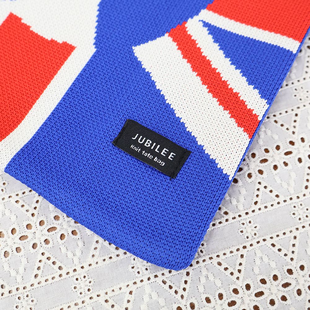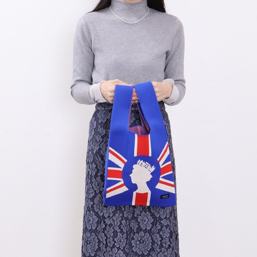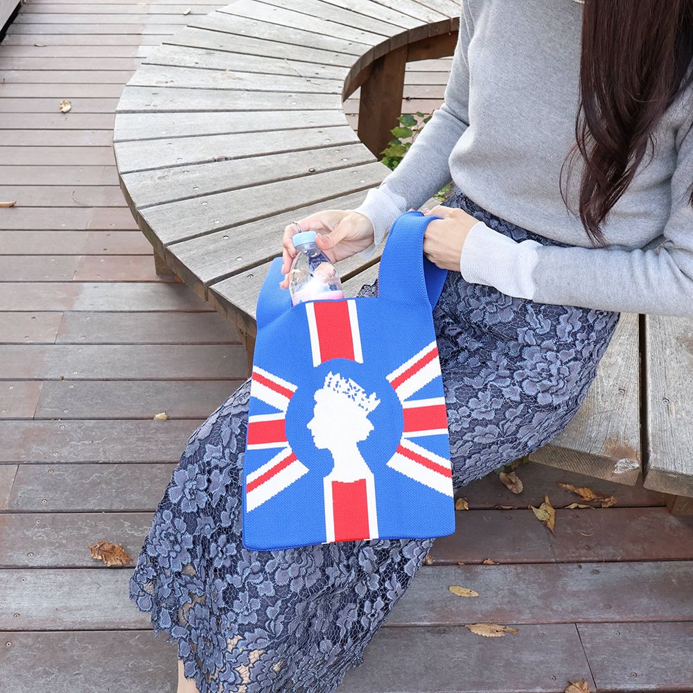 ユニオンジャックの中央に若き日のエリザベス2世が描かれた、イギリスらしいニットトート。