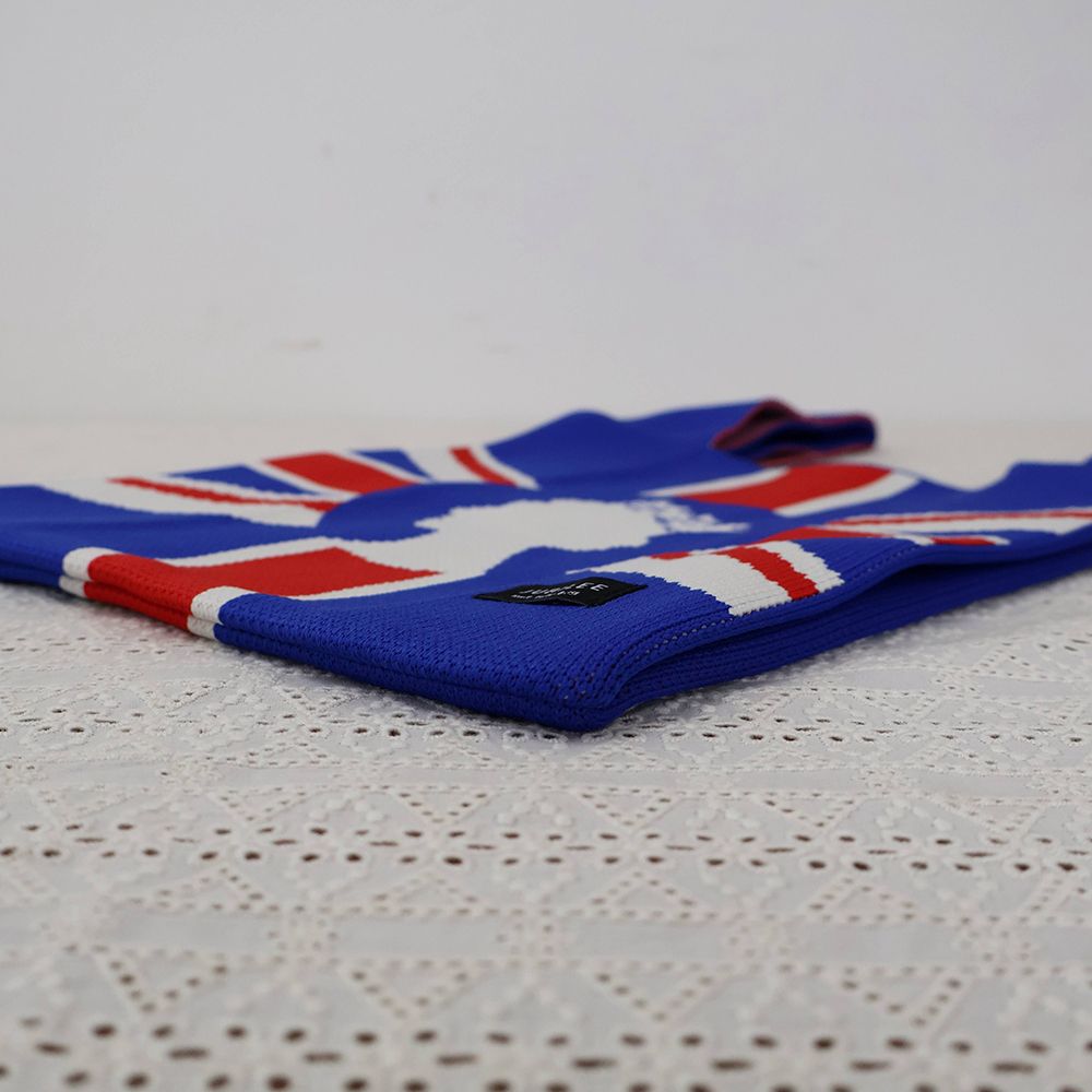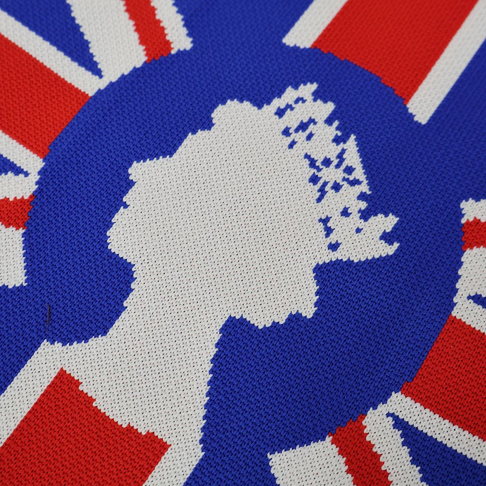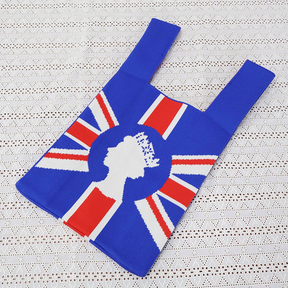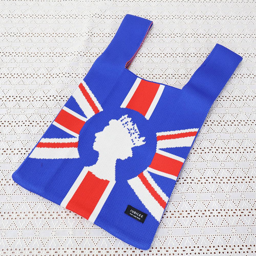 ユニオンジャックの中央に若き日のエリザベス2世が描かれた、イギリスらしいニットトート。