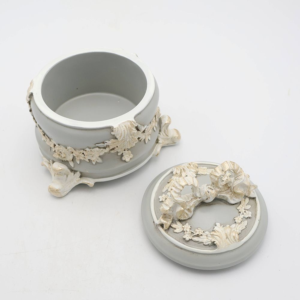 ころんと丸みを帯びたフォルムに、繊細な装飾がやさしく浮かび上がるトリンケットボックス。