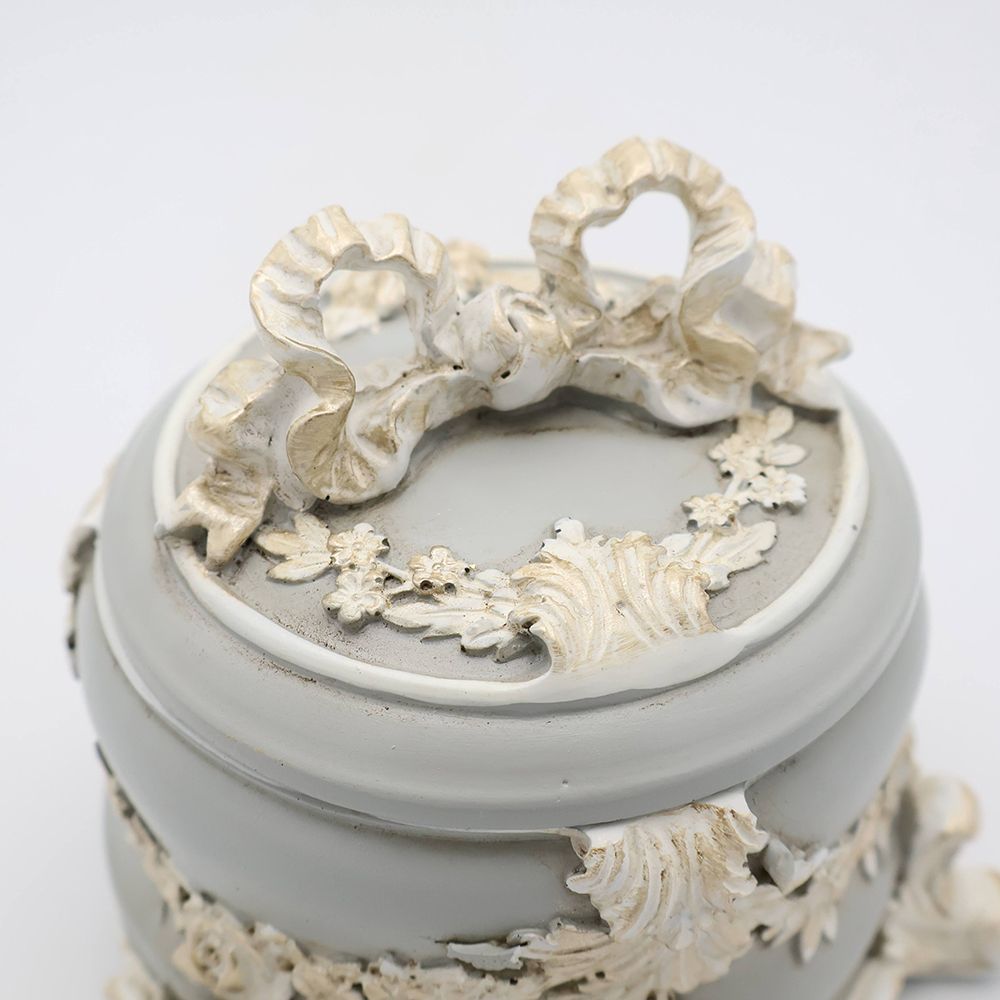 一番のチャームポイントは、天面にあしらわれた大きなリボンの装飾。ころんとした丸みのあるフォルムを、浮き上がるような繊細な草花のレリーフがぐるりと囲み、どこから眺めても隙のない美しさです。