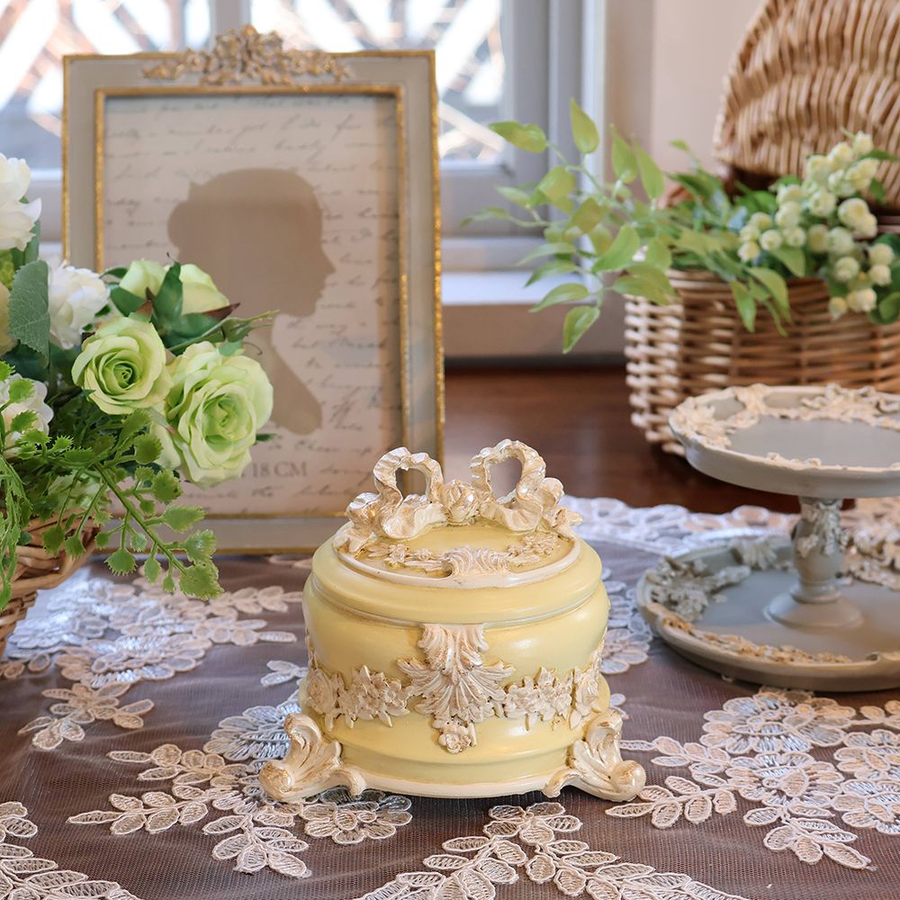 蓋のトップにあしらわれた立体的なリボンの装飾が、視線を惹きつける愛らしいポイント。やわらかな布を思わせるような曲線が美しく、華やかさの中にもやさしい表情を添えてくれます。