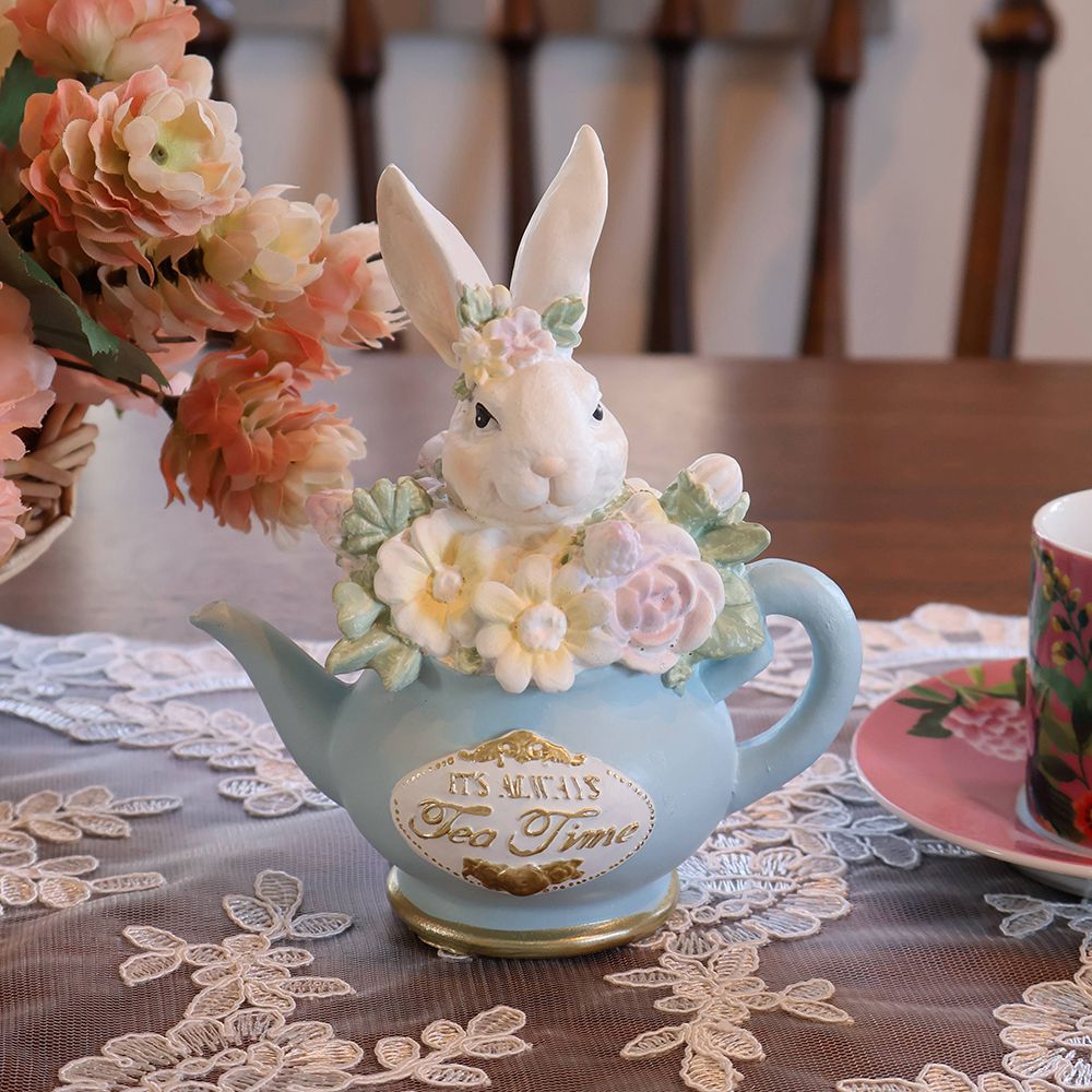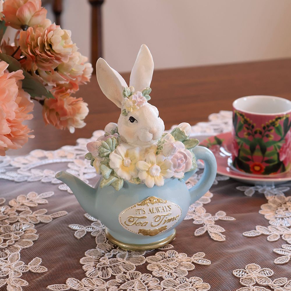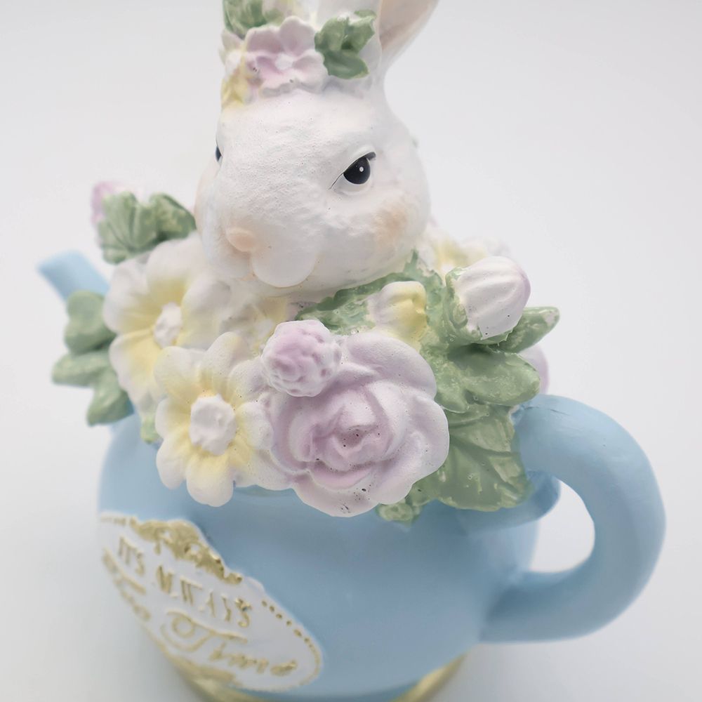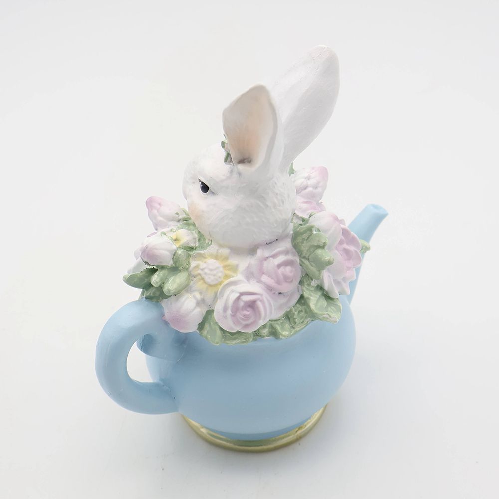 淡いブルーの小さなティーポットから、ひょっこりと顔を出した真っ白なうさぎさん。つぶらな瞳で見つめられるたび、思わず頬が緩んでしまいそうな愛らしさですね。
