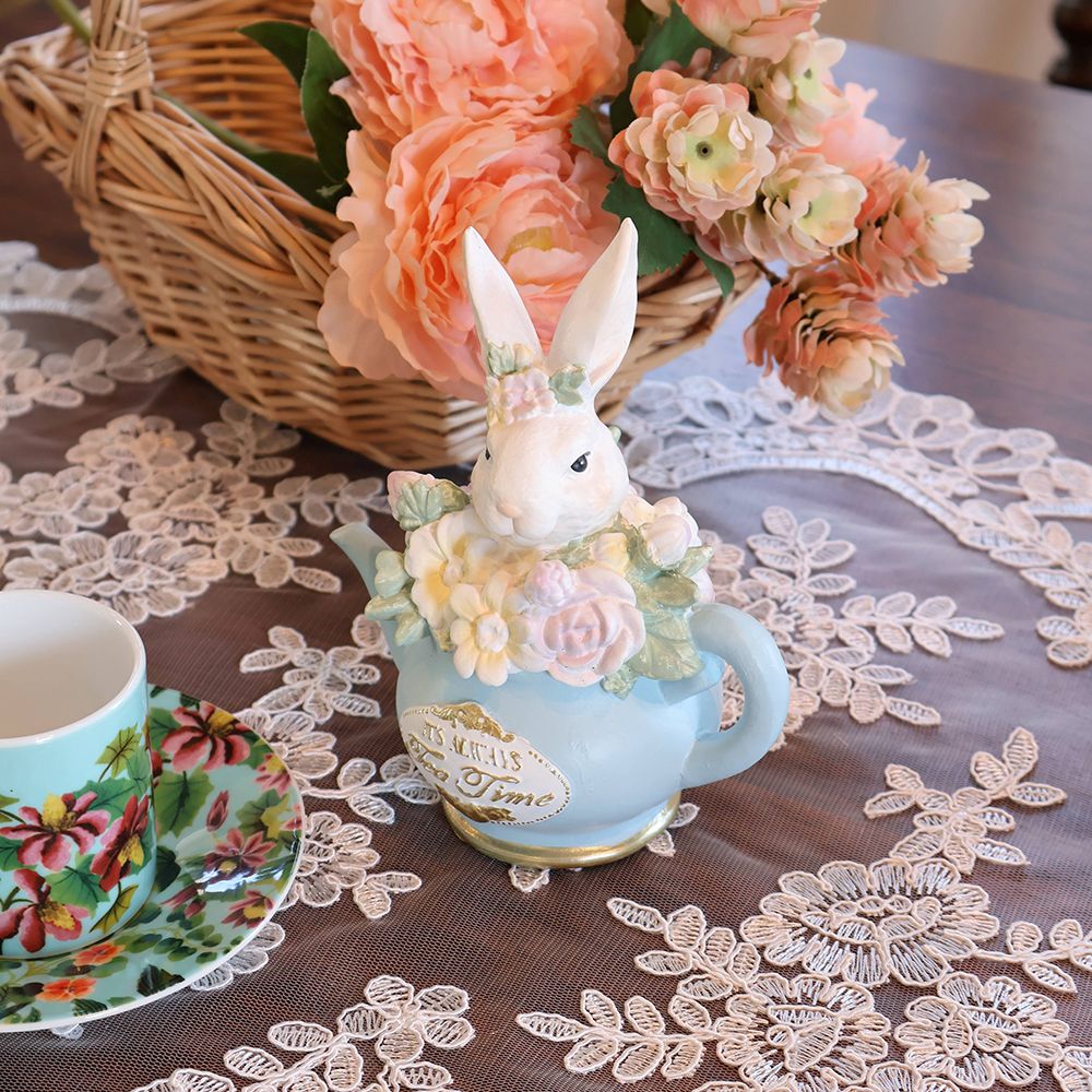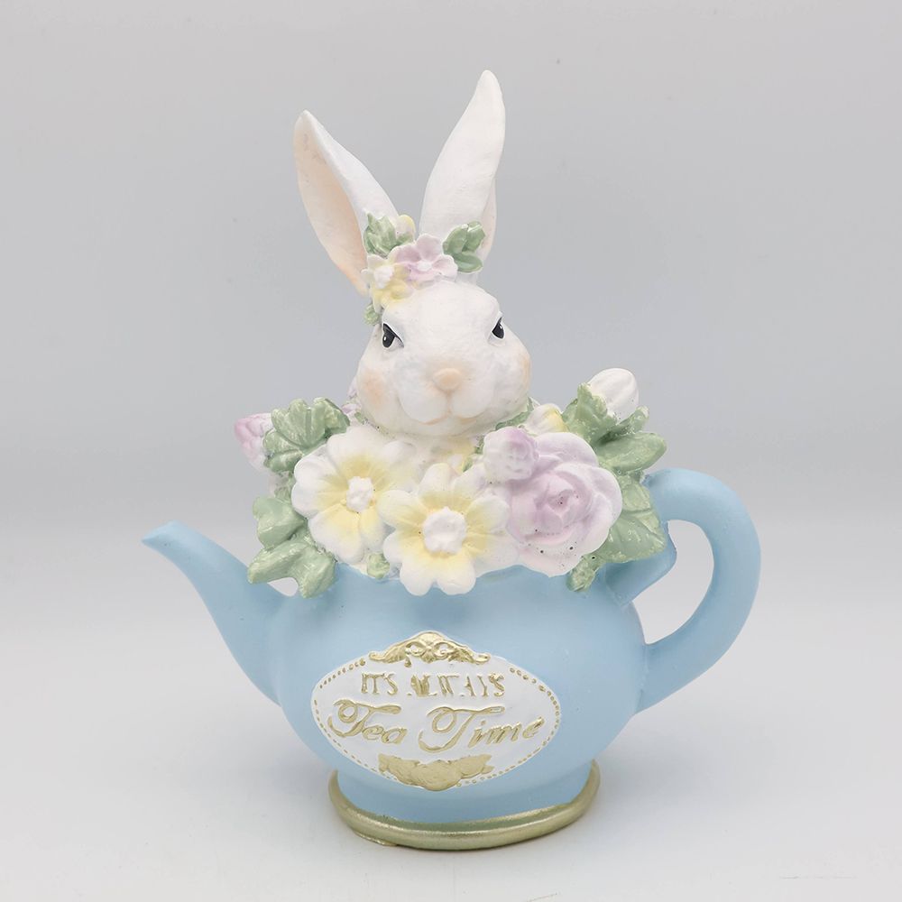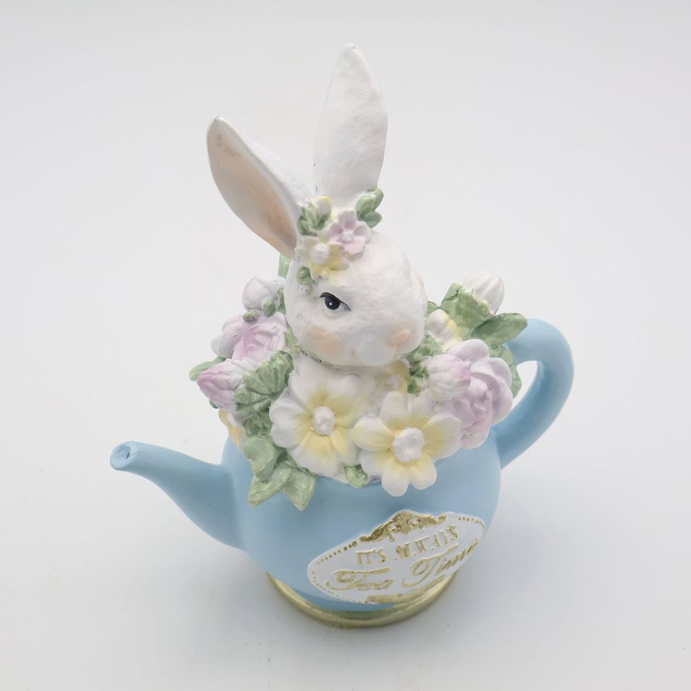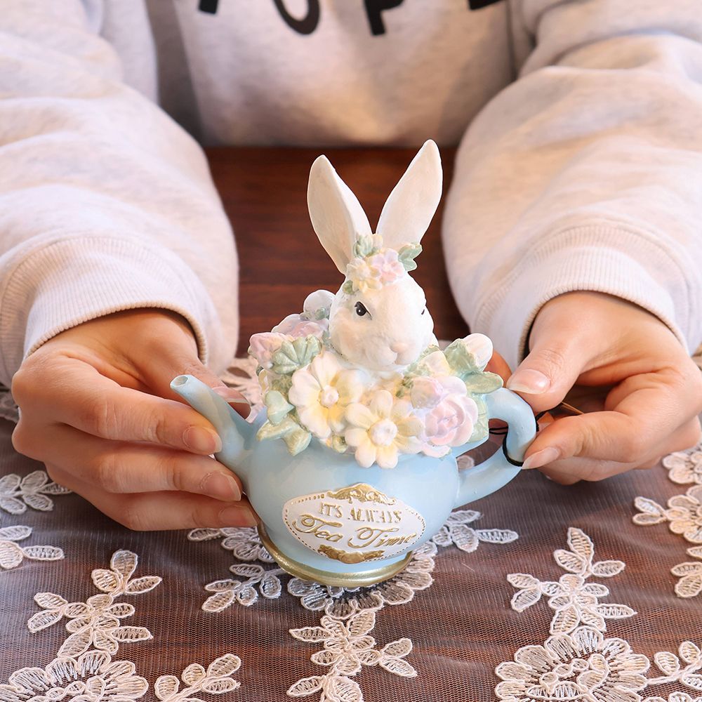 淡いブルーの小さなティーポットから、ひょっこりと顔を出した真っ白なうさぎさん。つぶらな瞳で見つめられるたび、思わず頬が緩んでしまいそうな愛らしさですね。