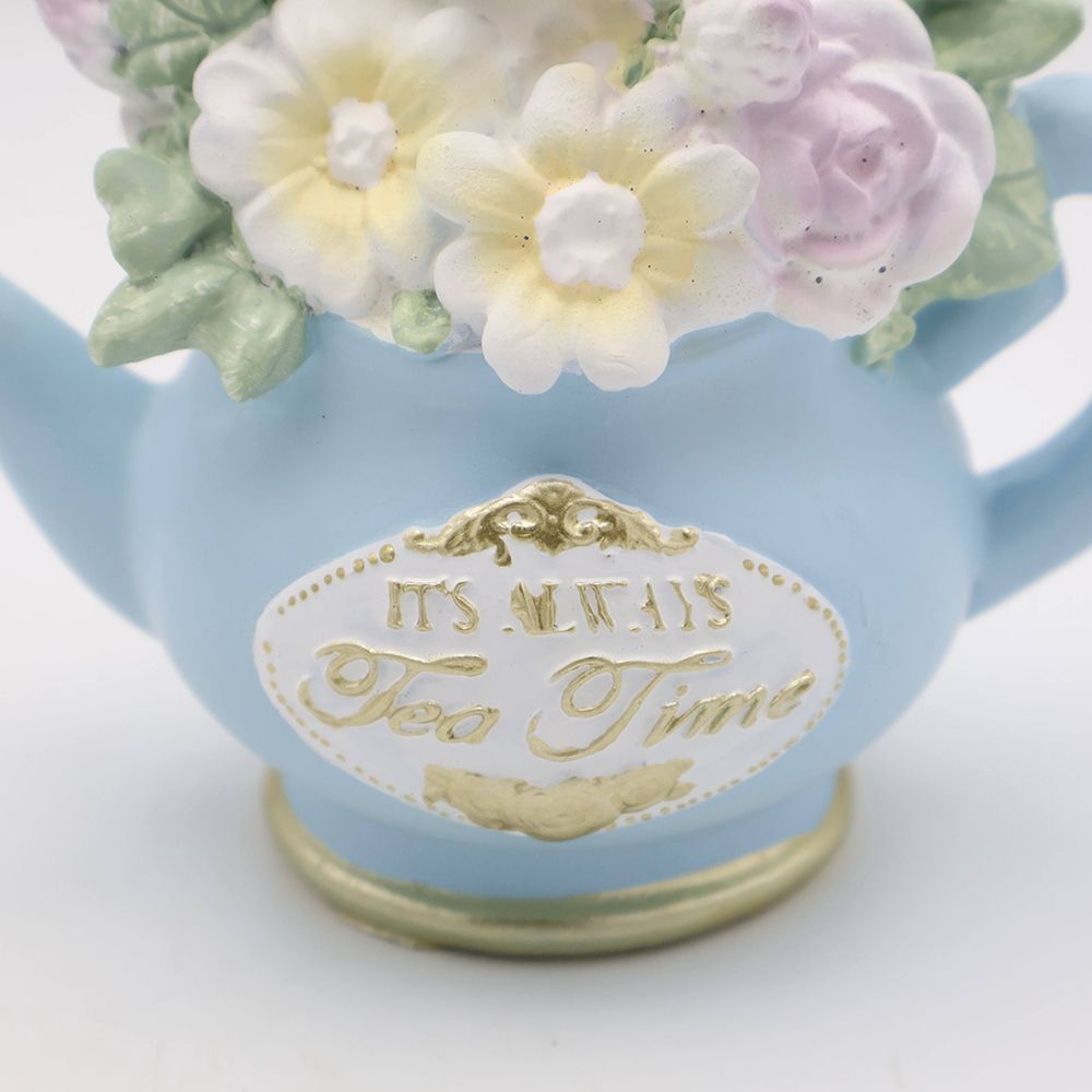 パステルカラーのお花に囲まれてちょこんと佇む姿は、まるで絵本のワンシーンを切り取ったかのよう。繊細なお花のデコレーションや、ゴールドのアクセントが映える「It's Always Tea Time」の文字が、クラシカルで華やかな雰囲気を演出してくれます。